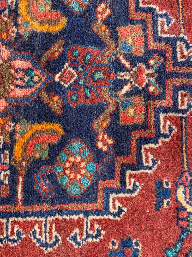 Upean arvokas vintage-Hamadan yksityiskohtaisella geometrisella kuvioinnilla ja tunnelmallisella väriteemalla. Käsinsolmittu villasta.