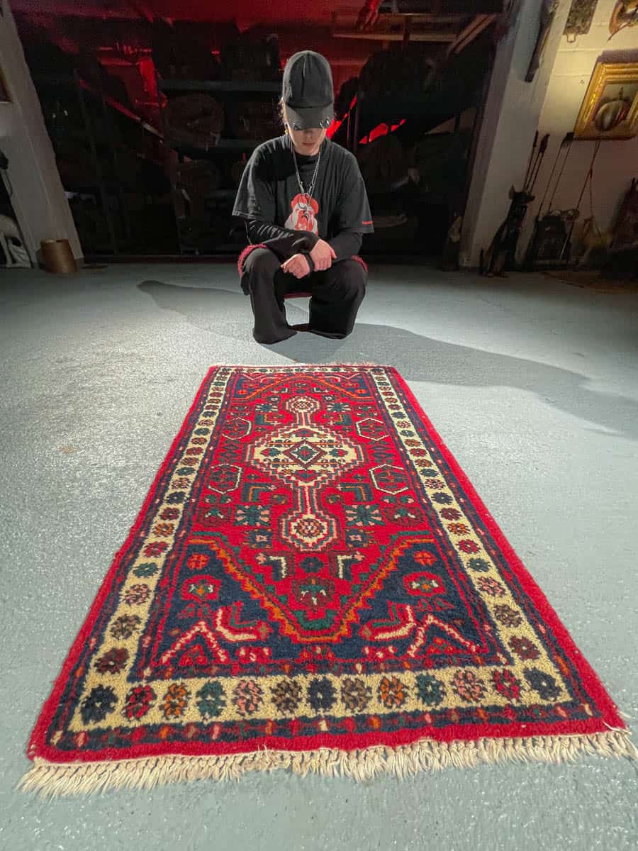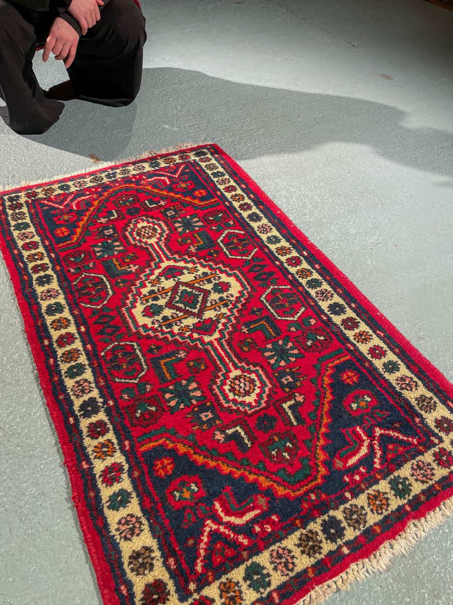 Pieni Hamadan-villamatto upealla kontrastilla, perinteisillä  värisävyillä ja geometrisella kuvioinnilla.