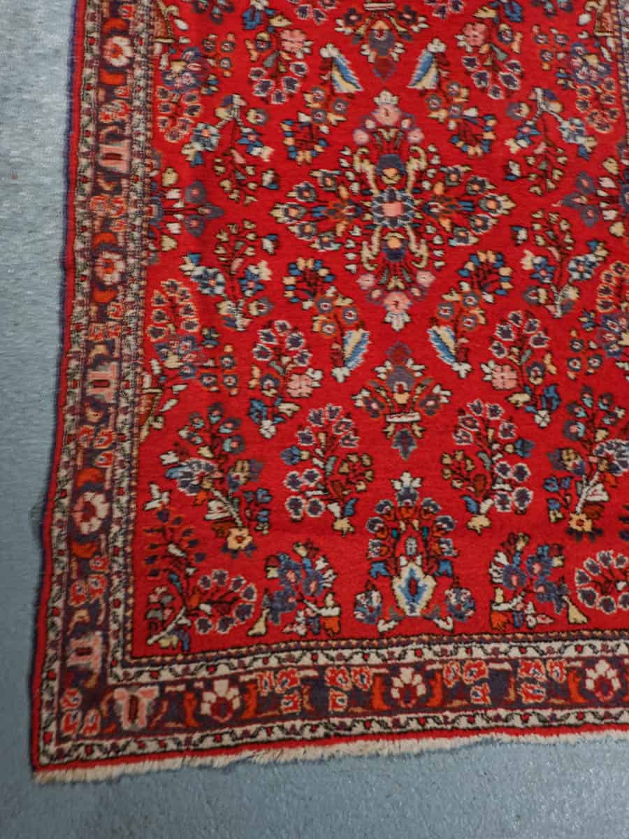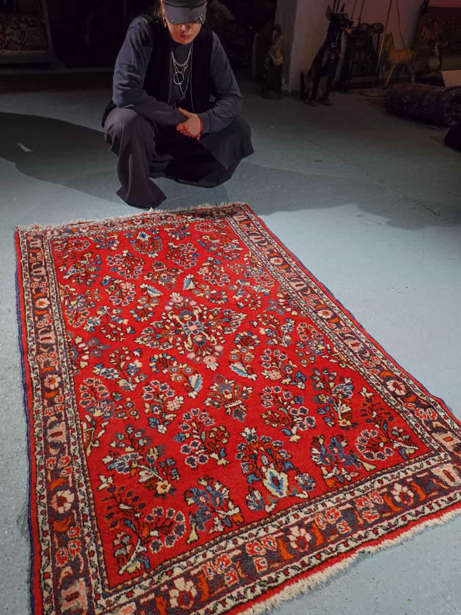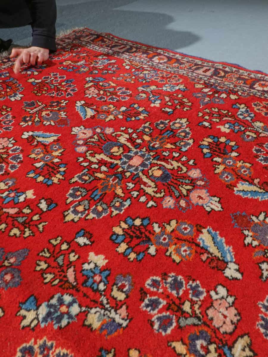 Sievä Sarouk punaisella väriteemalla ja visuaaliseasti selkeällä kukkaiskuvioinnilla. Käsinsolmittu villasta.