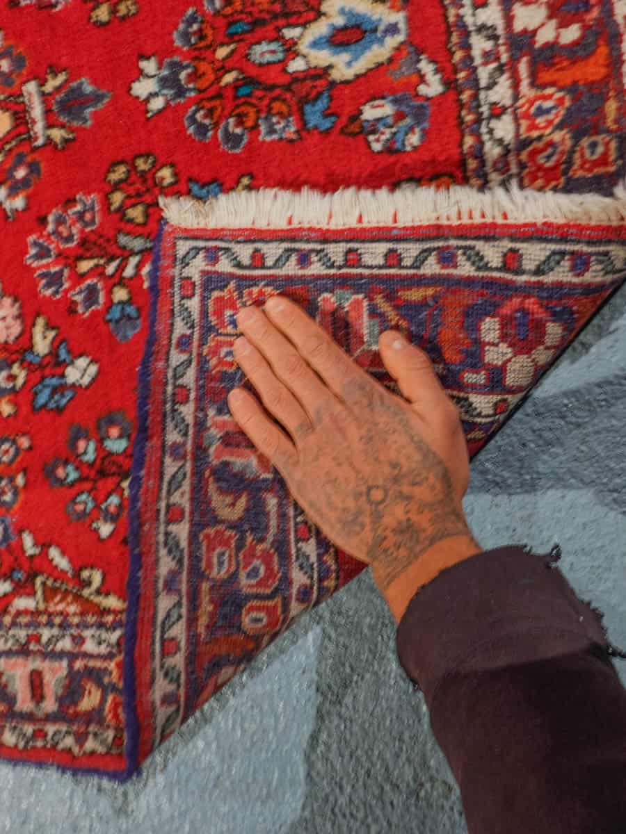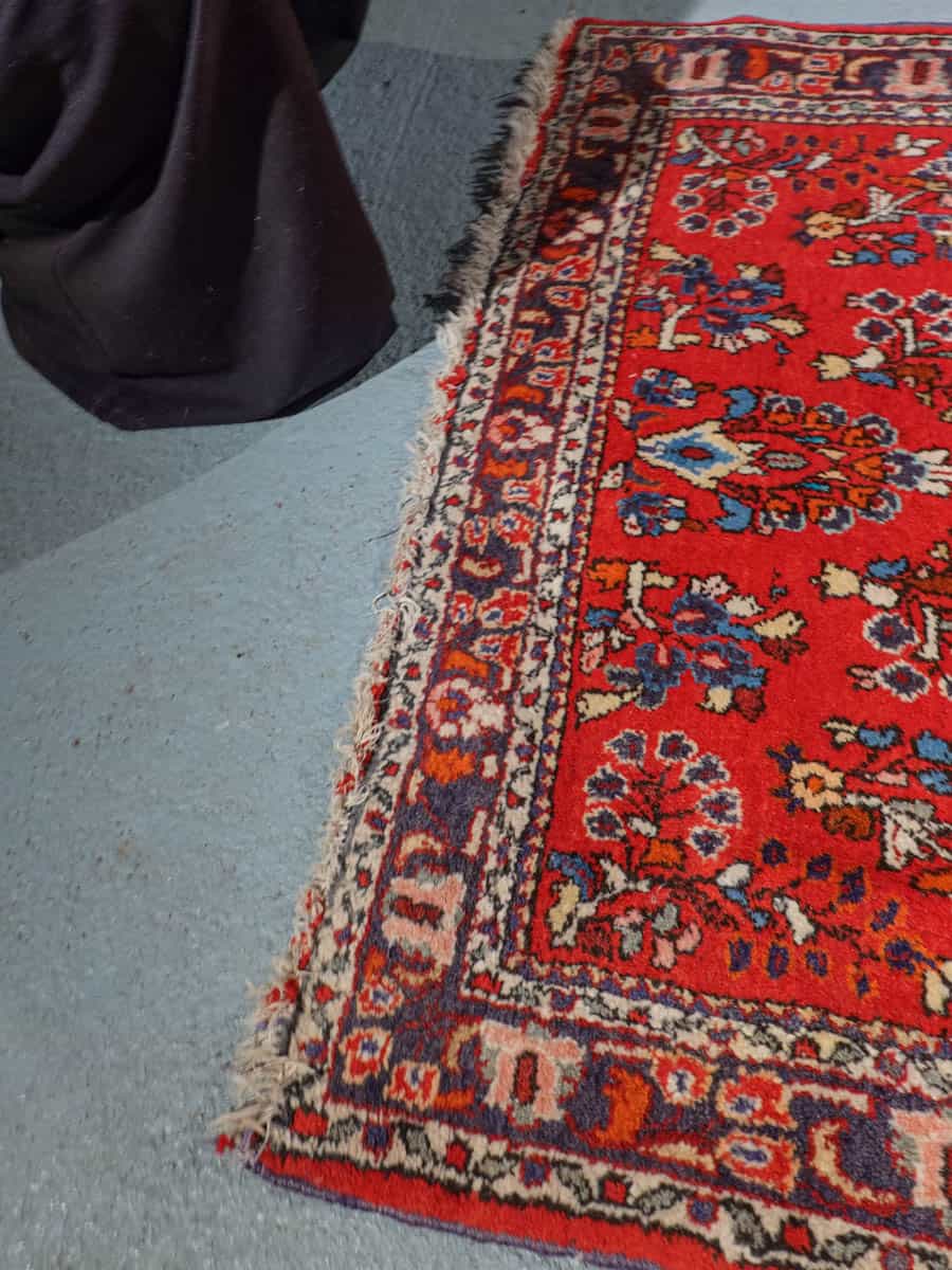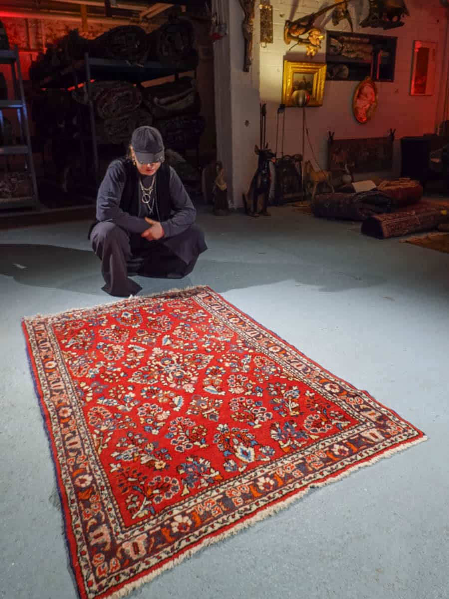 Sievä Sarouk punaisella väriteemalla ja visuaaliseasti selkeällä kukkaiskuvioinnilla. Käsinsolmittu villasta.