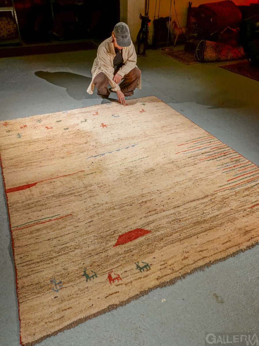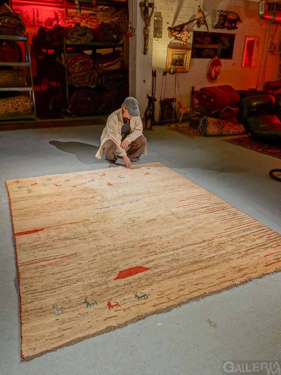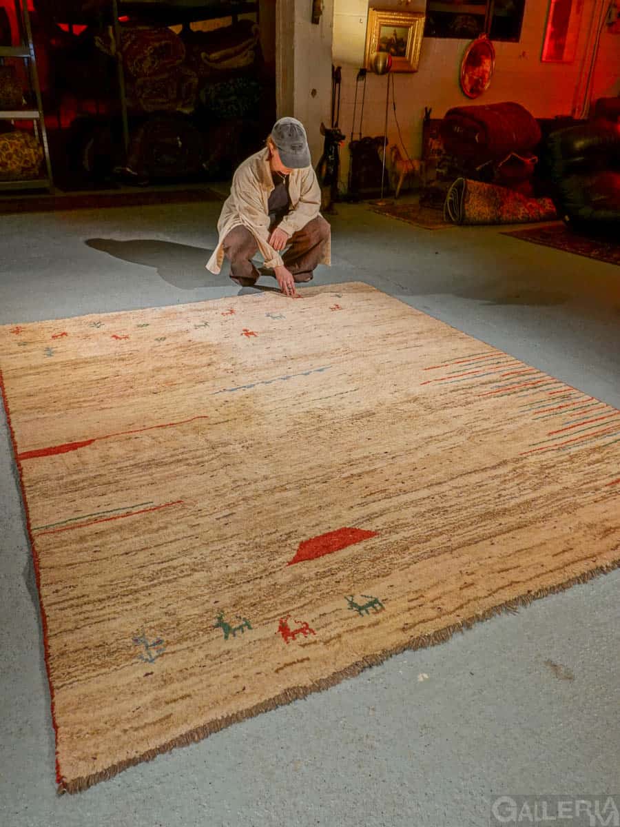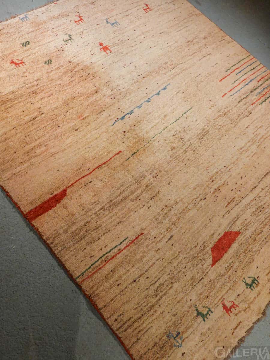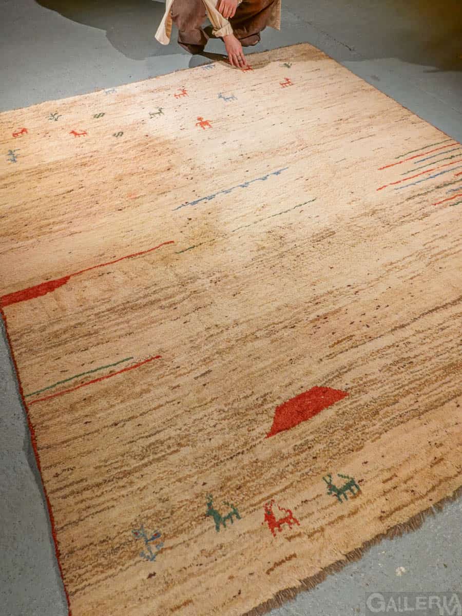 Ihastuttava vintage-Gabbeh sievän minimalistisella kuvioinnilla ja vaalealla värimaailmalla. Käsinsolmittu villasta villaloimelle.