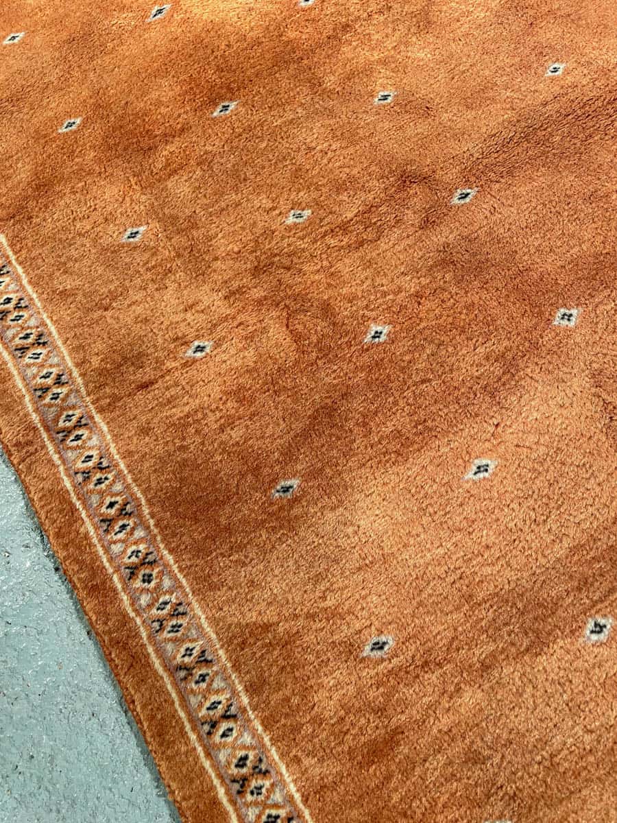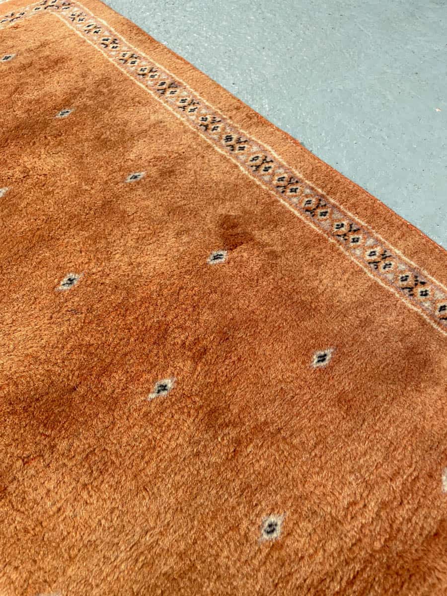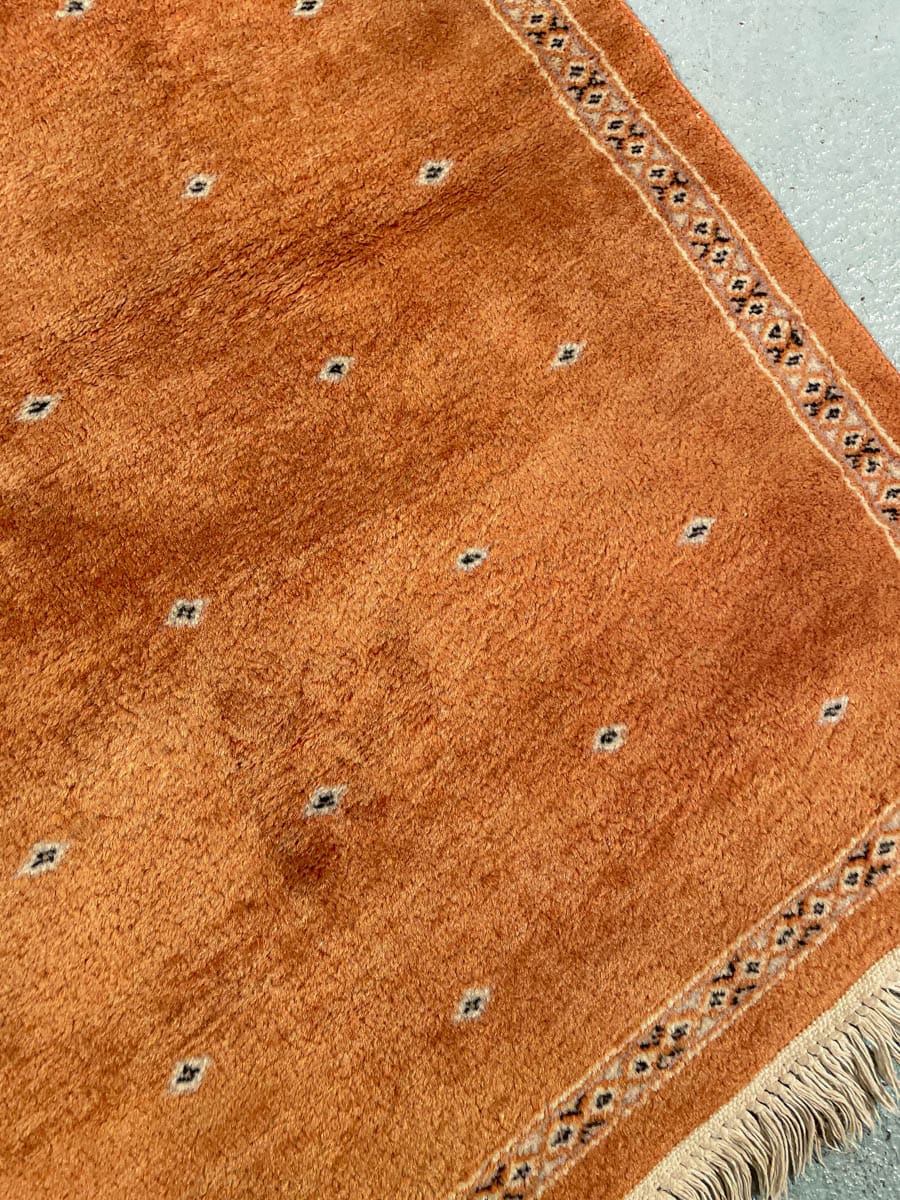 Ihastuttava vintage-Gabbeh minimalistisella kuvioinnilla ja kodikkaan murretulla oranssilla värillä. Käsinsolmittu villasta.