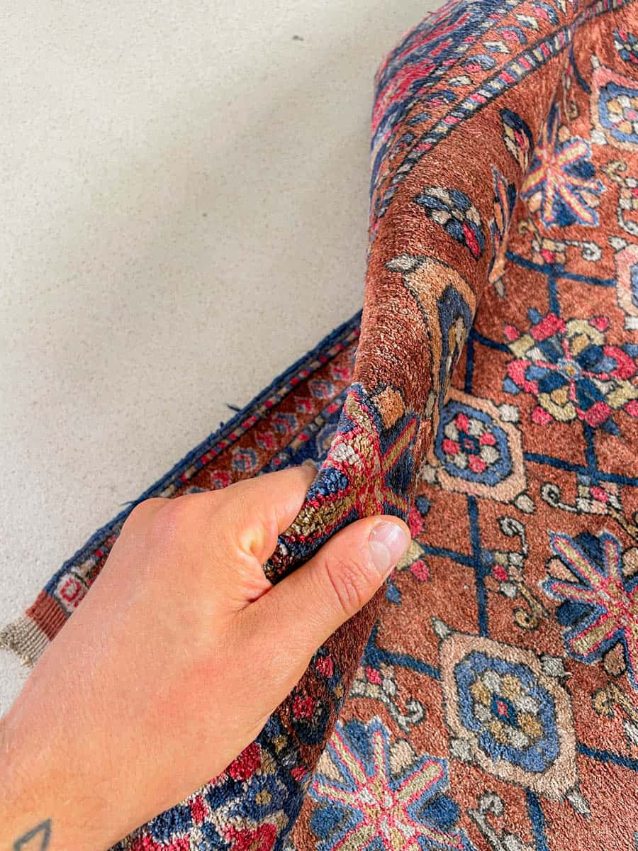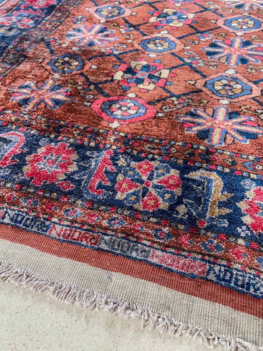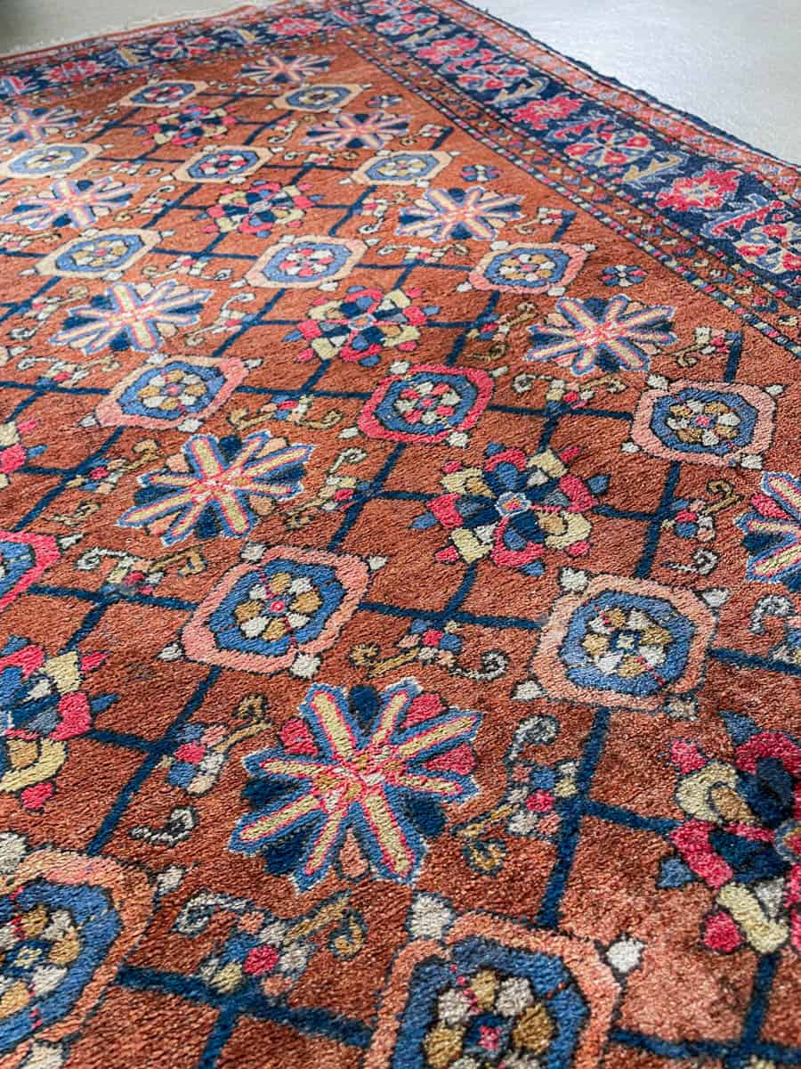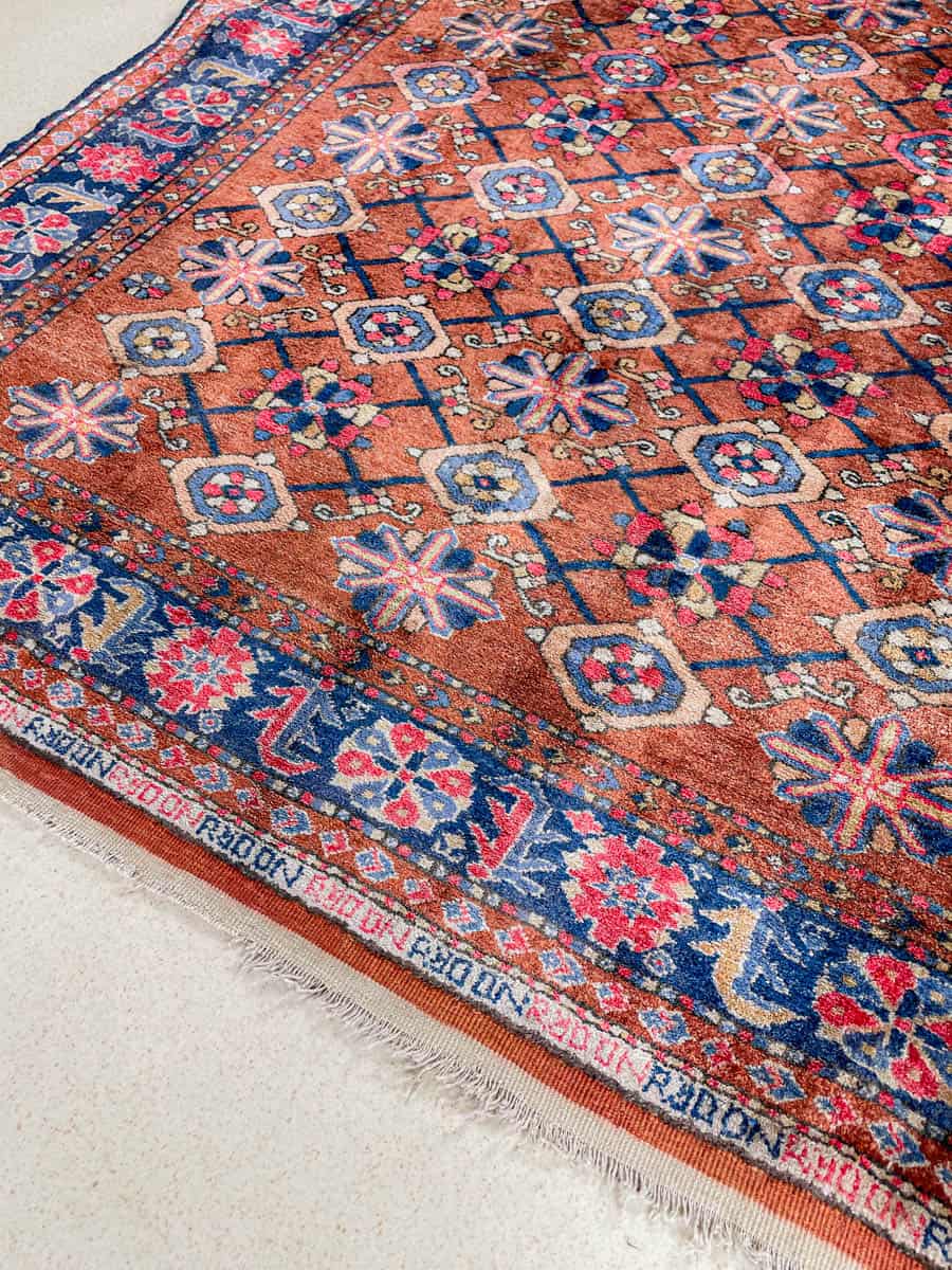 Tämä matto sijaitsee Töölön varastollamme – jos haluat tulla katsomaan sitä paikan päälle, sovithan näytön viestitse tai puhelimitse.