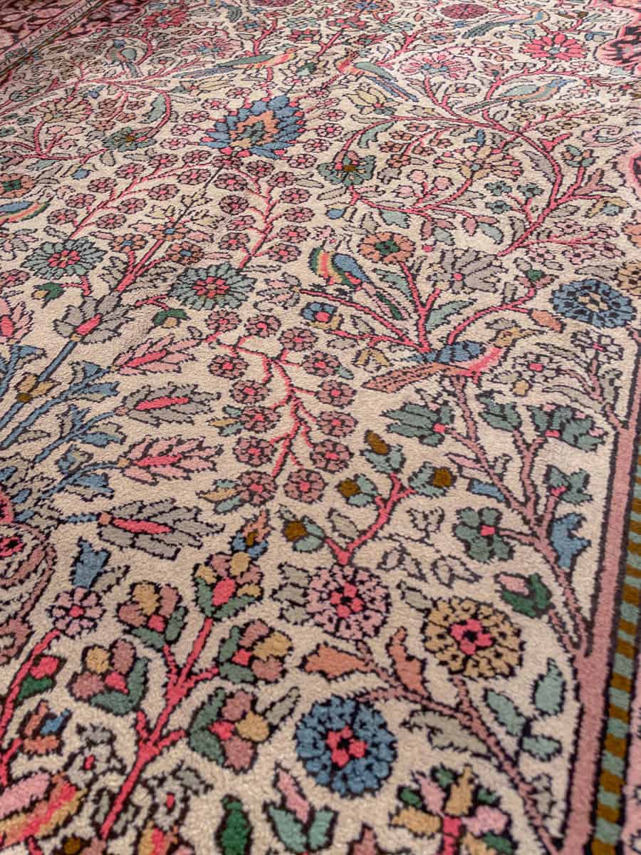 Kaunis ja perinteinen Kasmir-silkkimatto värikkäillä yksityiskohdilla ja kukkaiskuvioinneilla.