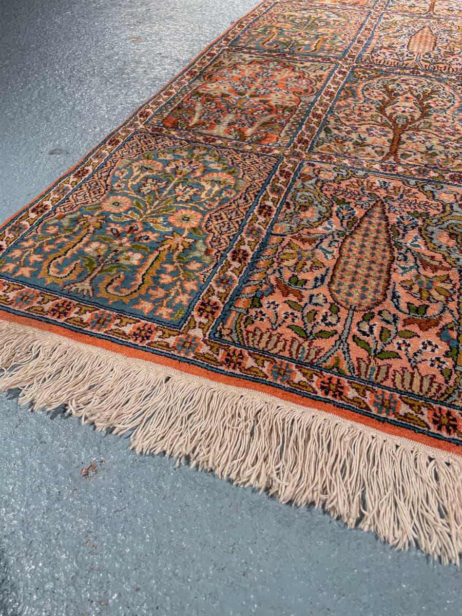 Tyrmäävä ja yksityiskohtainen Kasmir-silkkimatto hämmästyttävän tyylikkäällä puutarhakuvioinnilla.