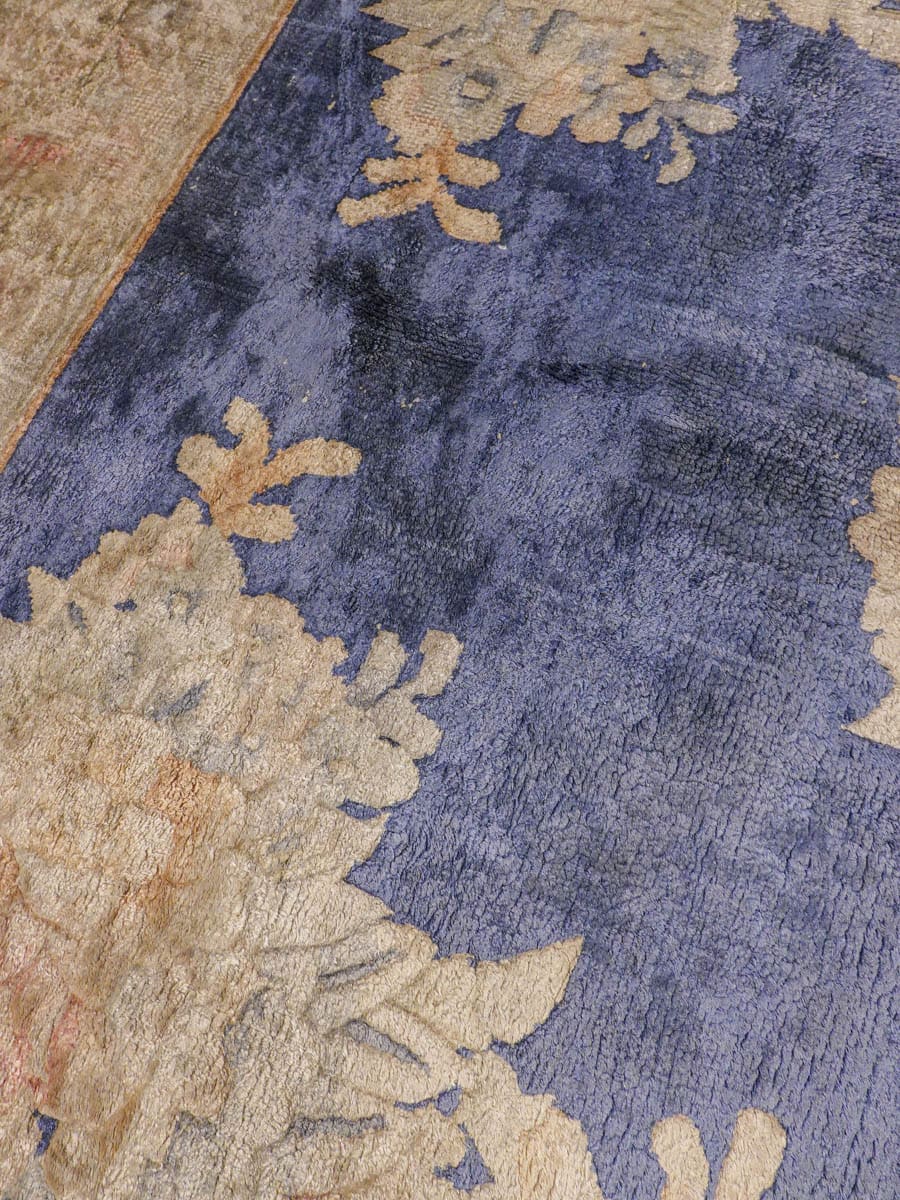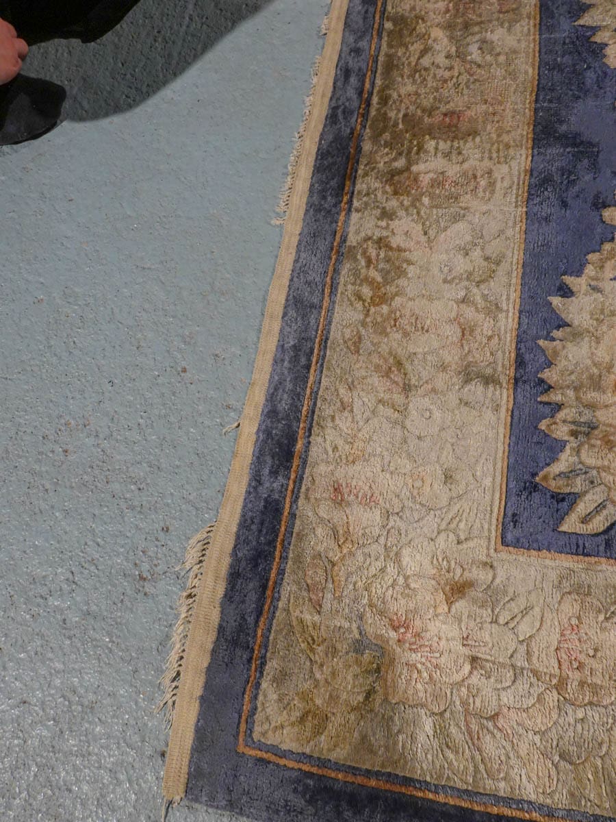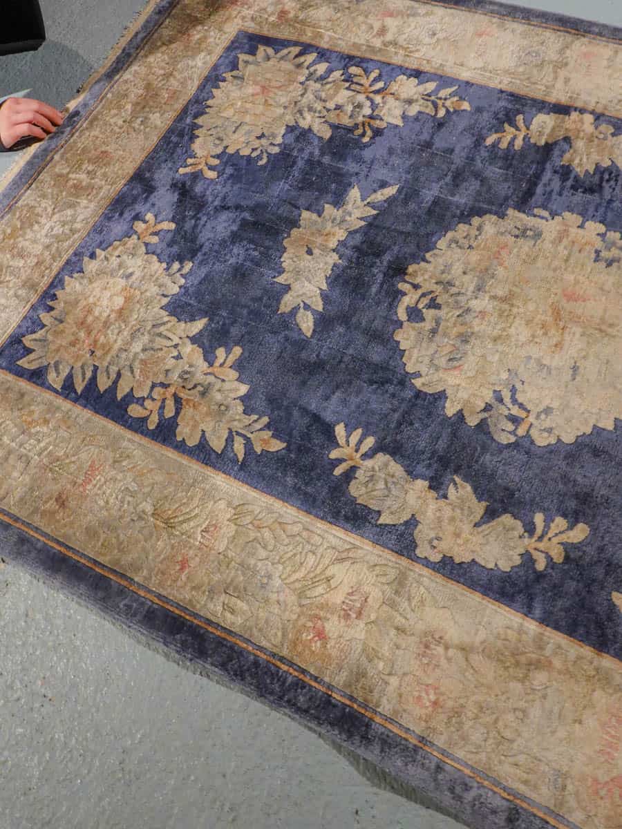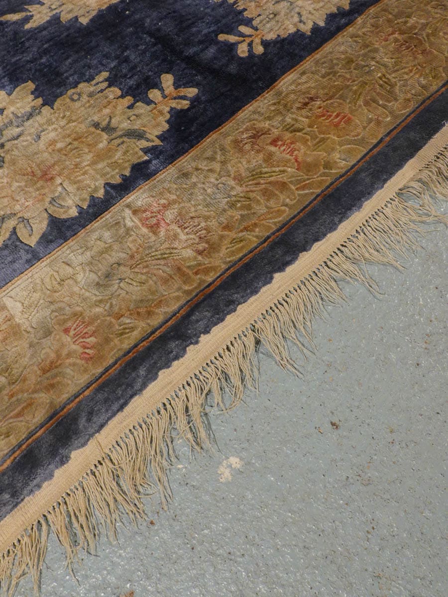 Kaunis Aubusson sinisellä pohjalla ja ihastuttavilla kukkakuvioinneilla. Upeasti säilynyt silkin kiilto.