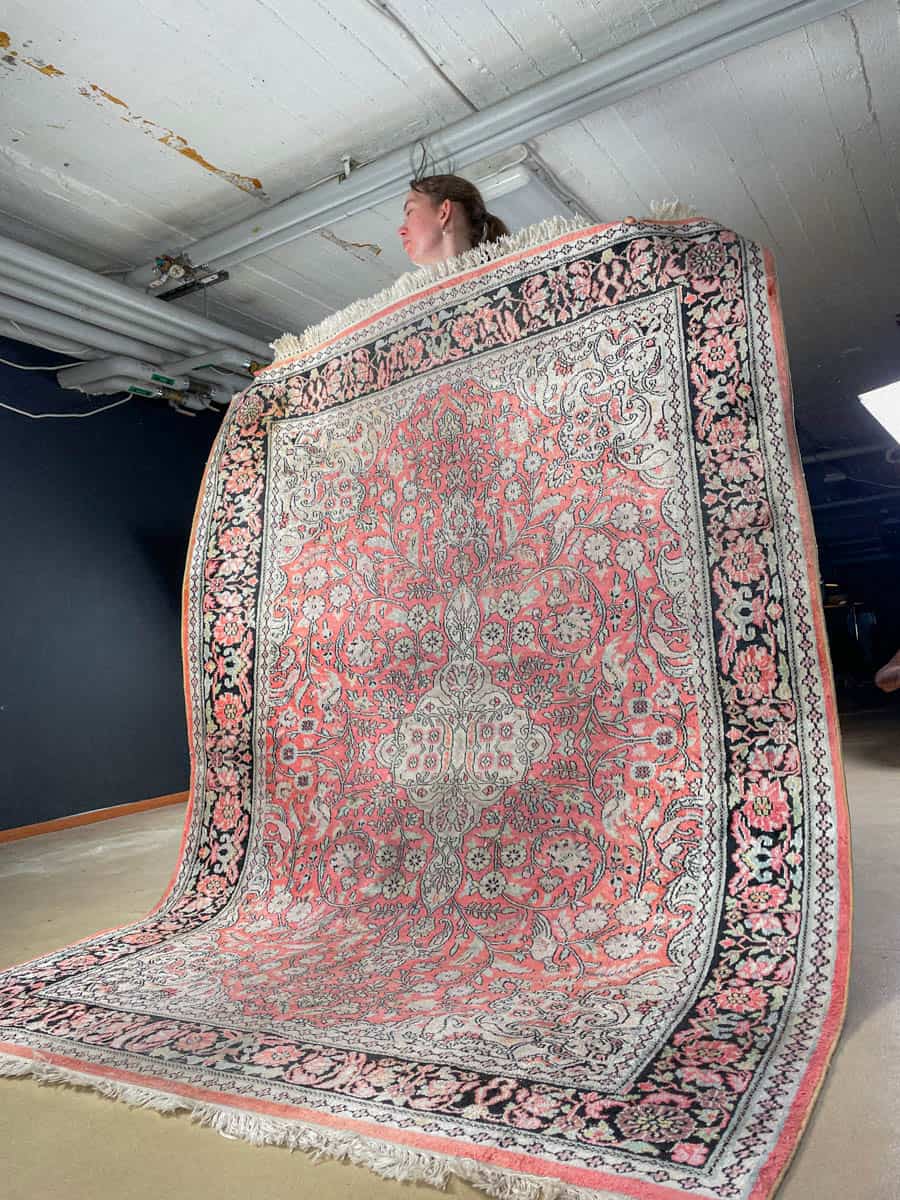 Tämä matto sijaitsee Töölön varastollamme – jos haluat tulla katsomaan sitä paikan päälle, sovithan näytön viestitse tai puhelimitse.