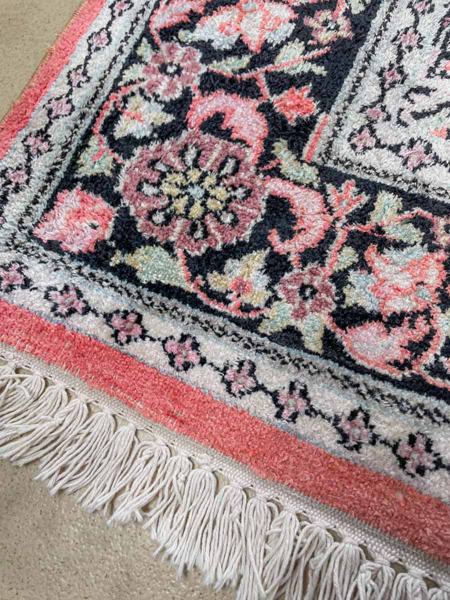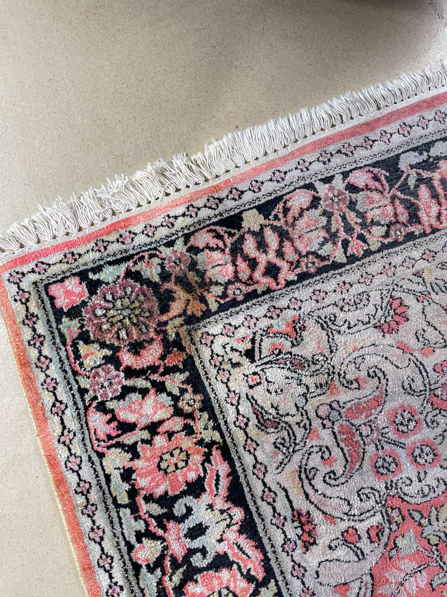 Koristeellisen herkkä vaaleanpunainen silkkimatto orgaanisilla kukkakuvioinneilla ja lintuaiheilla. Käsinsolmittu silkistä puuvillaloimelle.