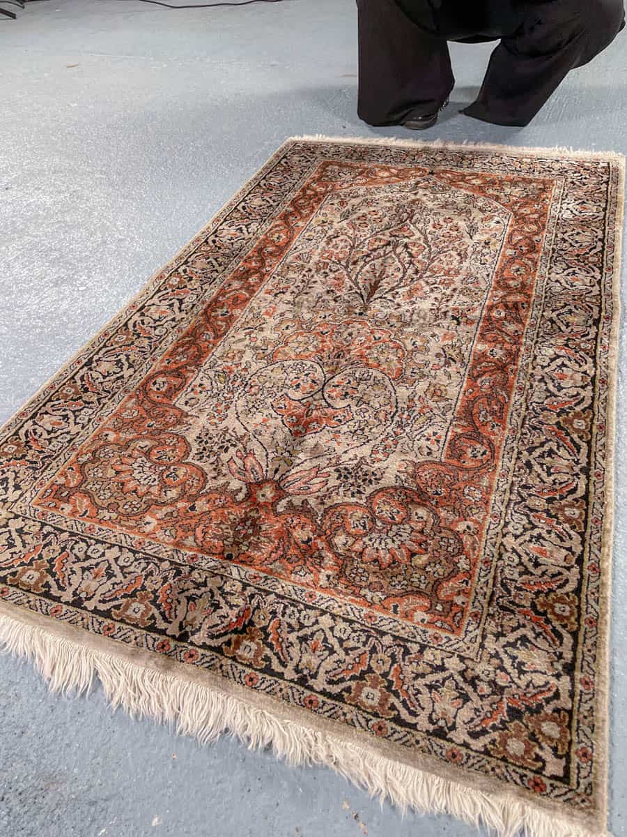 Upea maanläheinen Kasmir-silkkimatto yksityiskohtaisilla kuvioinneilla. Käsinsolmittu silkistä puuvillaloimelle.