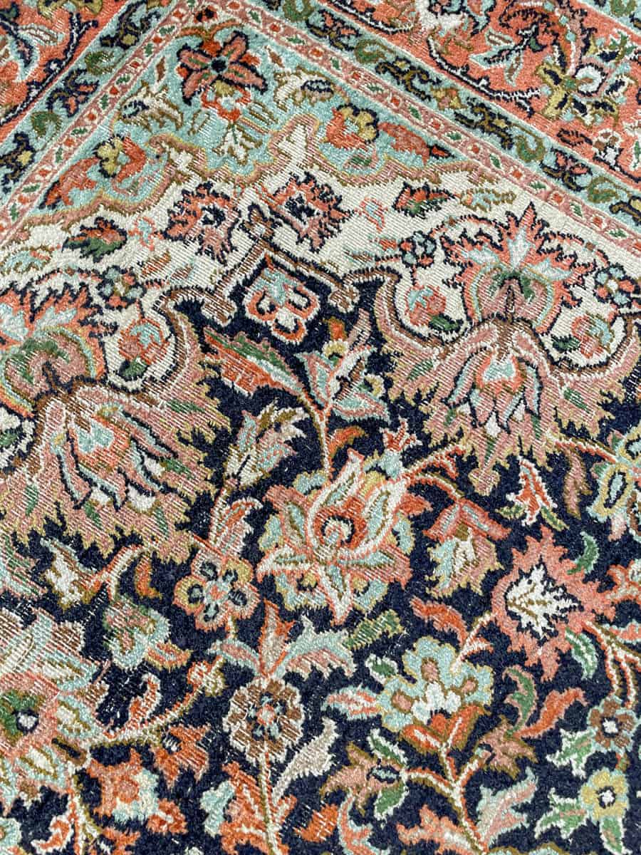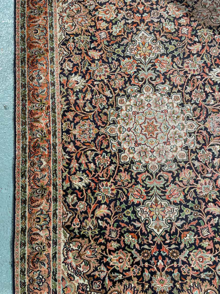 Tämän uskomattoman taidokkaasti käsinsolmitun Kasmir-silkkimaton väripaletti on poikkeuksellisen kaunis. Keskikentän tumma pohja toimii dramaattisena taustana, jolta nousevat esiin vehmaat vihreät, lämpimän orannsin, maanläheisen ruskean ja ja kauniin taivaansinisen sävyjä hillitysti sommiteltuina ja silkin luonnollisen kiillon korostamina. Reunojen murretun oranssi tausta ja hillitty kukkaiskuvio kehystää mattoa klassisella mutta voimakkaalla otteella.