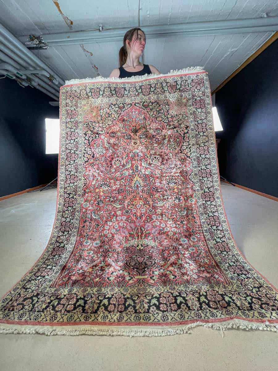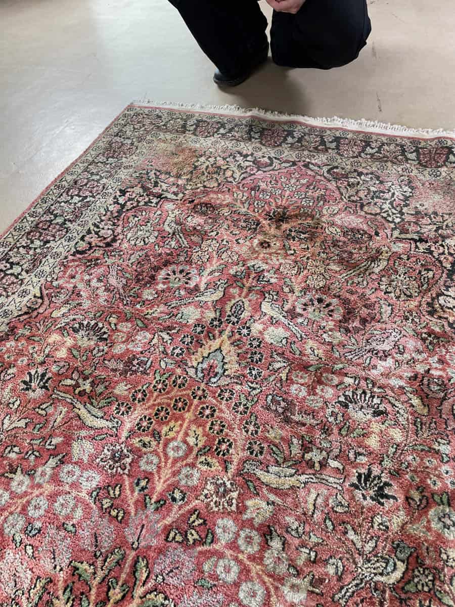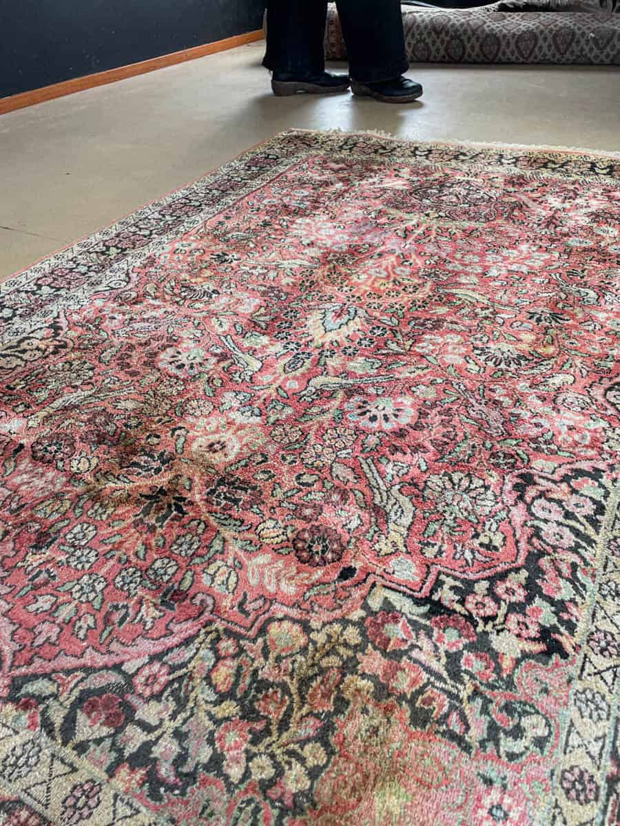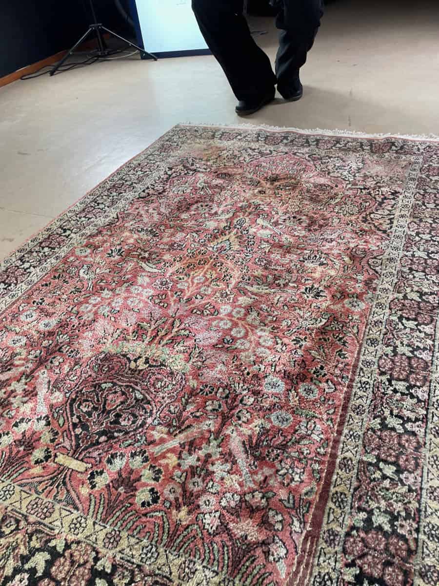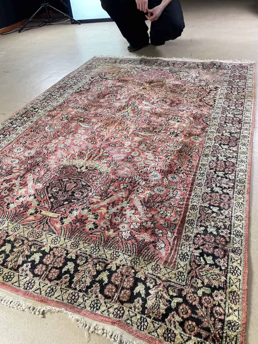 Tämä matto sijaitsee Töölön varastollamme – jos haluat tulla katsomaan sitä paikan päälle, sovithan näytön viestitse tai puhelimitse.
