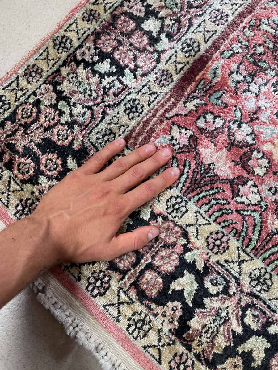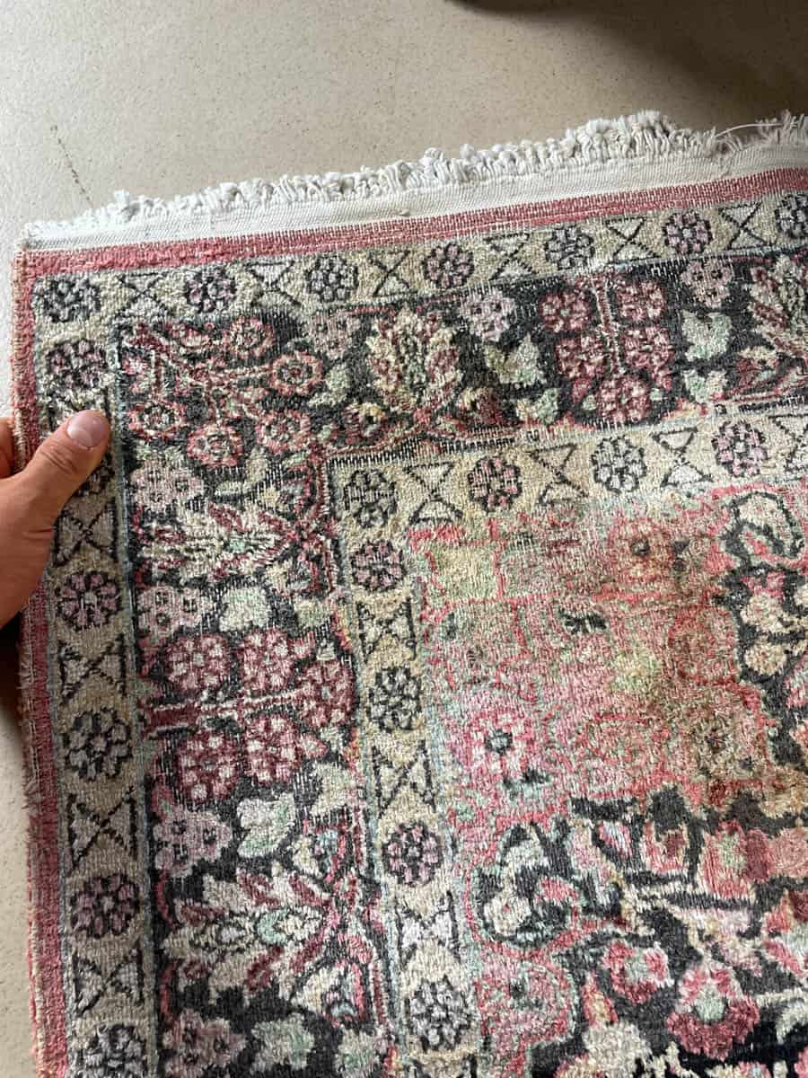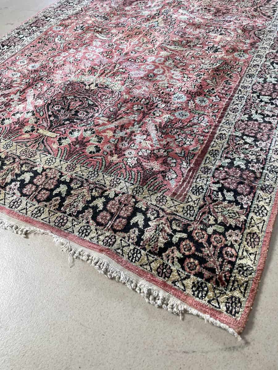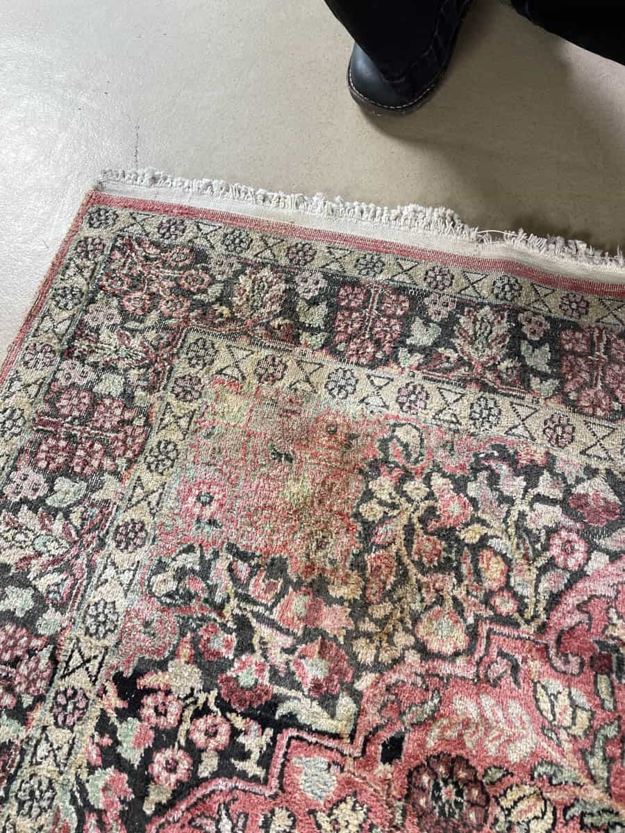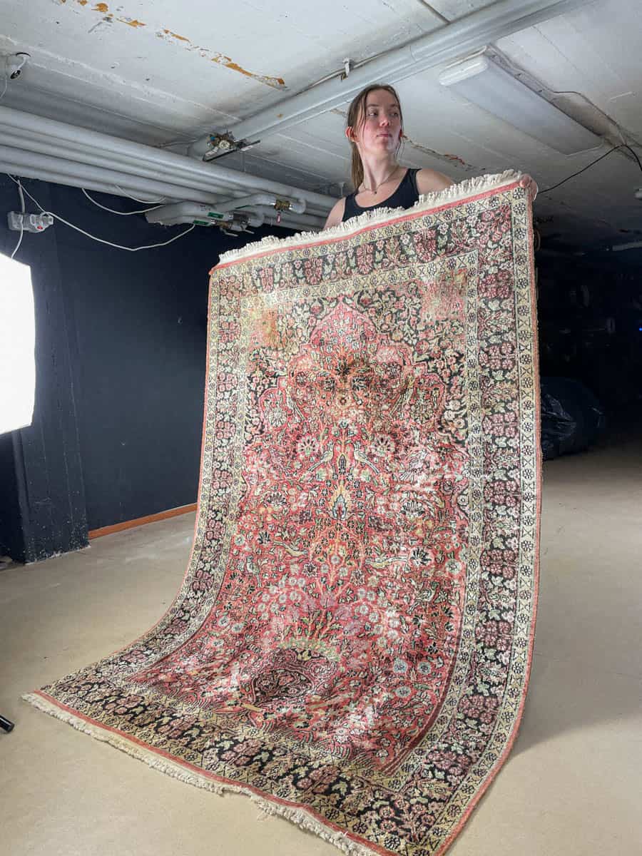 Tämä matto sijaitsee Töölön varastollamme – jos haluat tulla katsomaan sitä paikan päälle, sovithan näytön viestitse tai puhelimitse.
