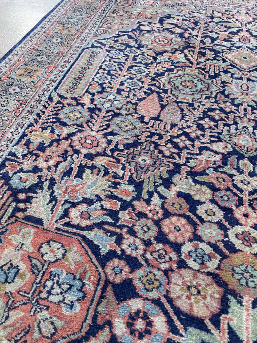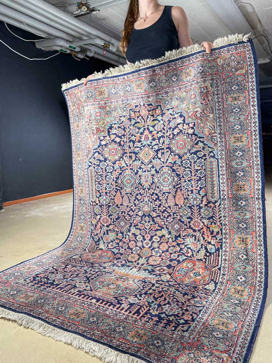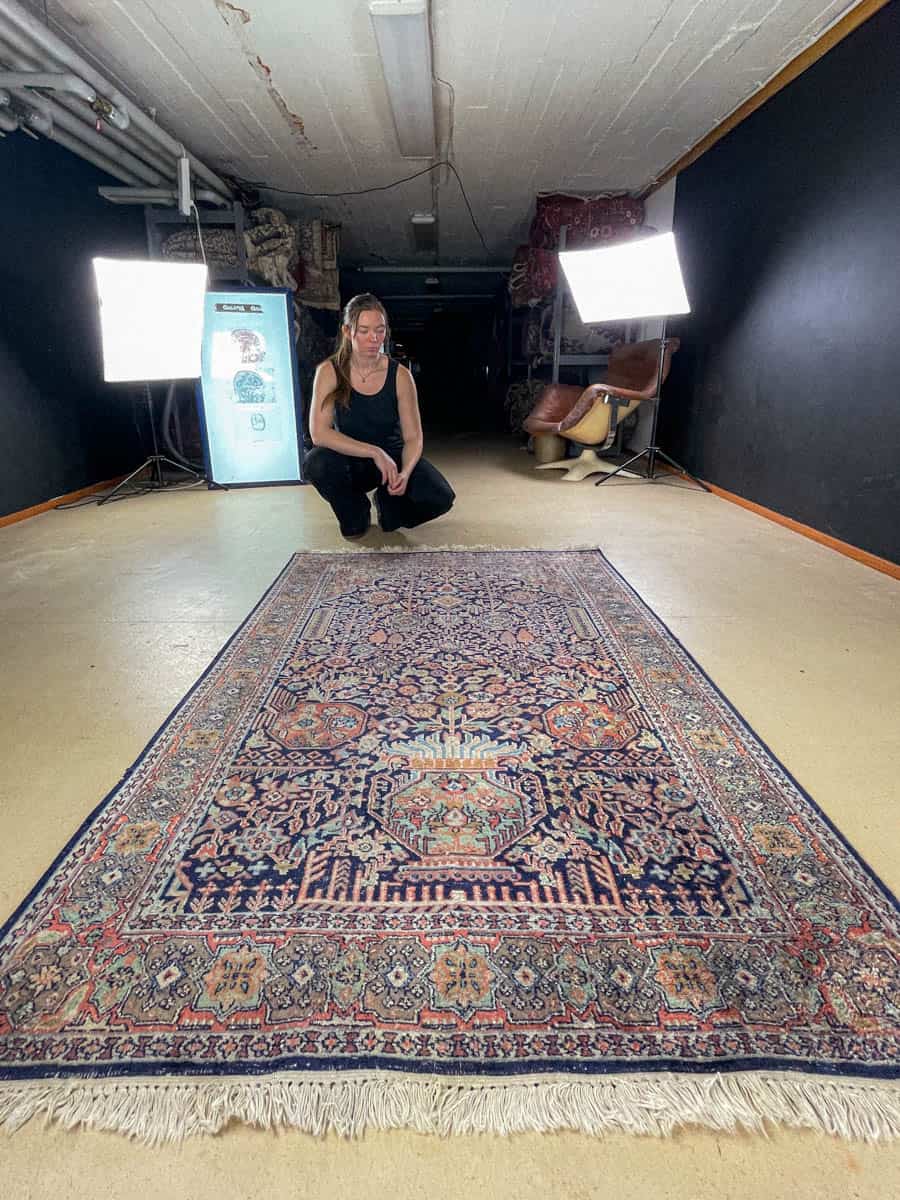 Tämä matto sijaitsee Töölön varastollamme – jos haluat tulla katsomaan sitä paikan päälle, sovithan näytön viestitse tai puhelimitse.