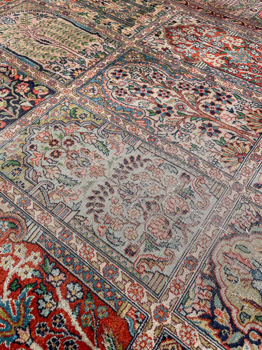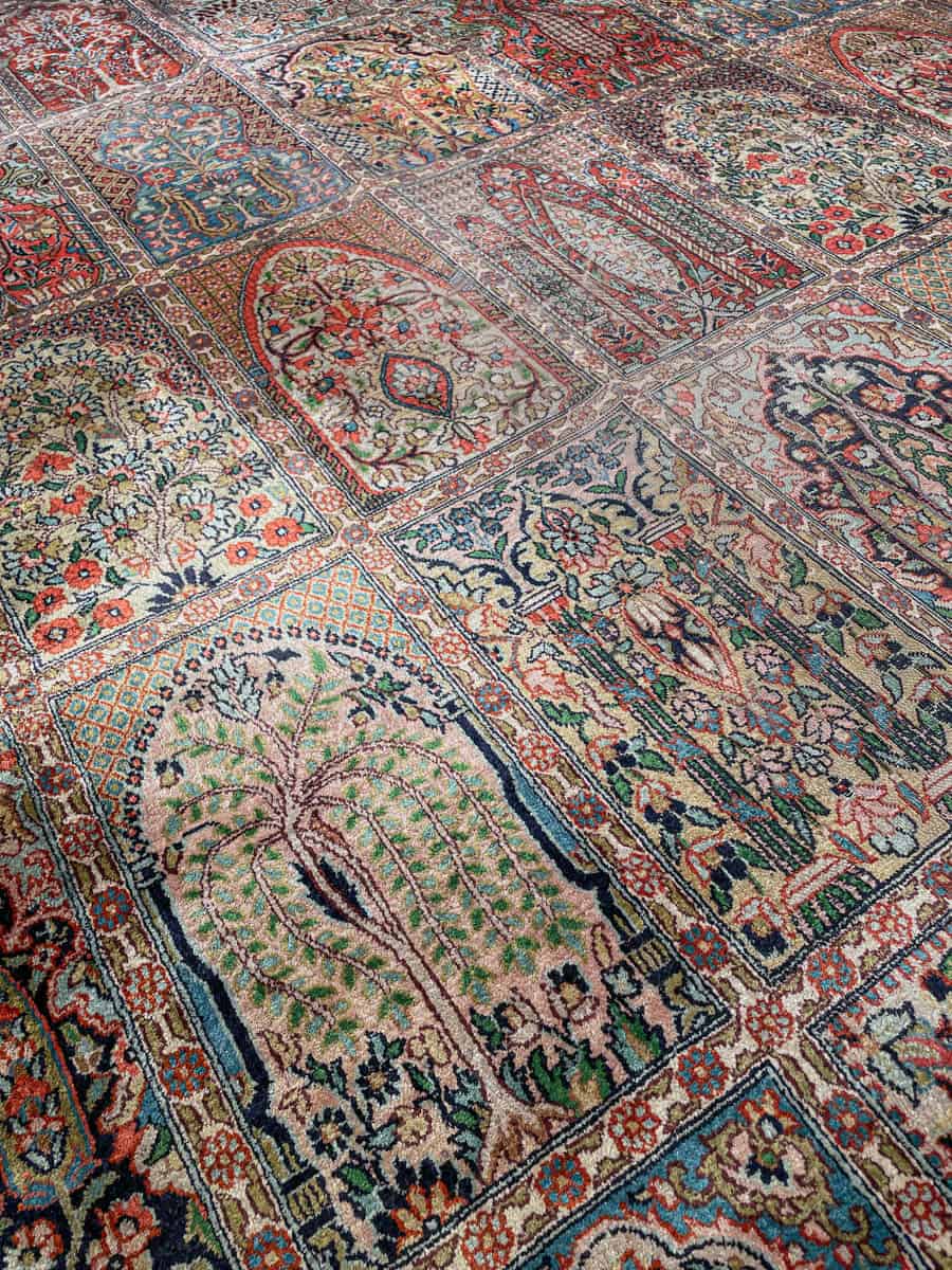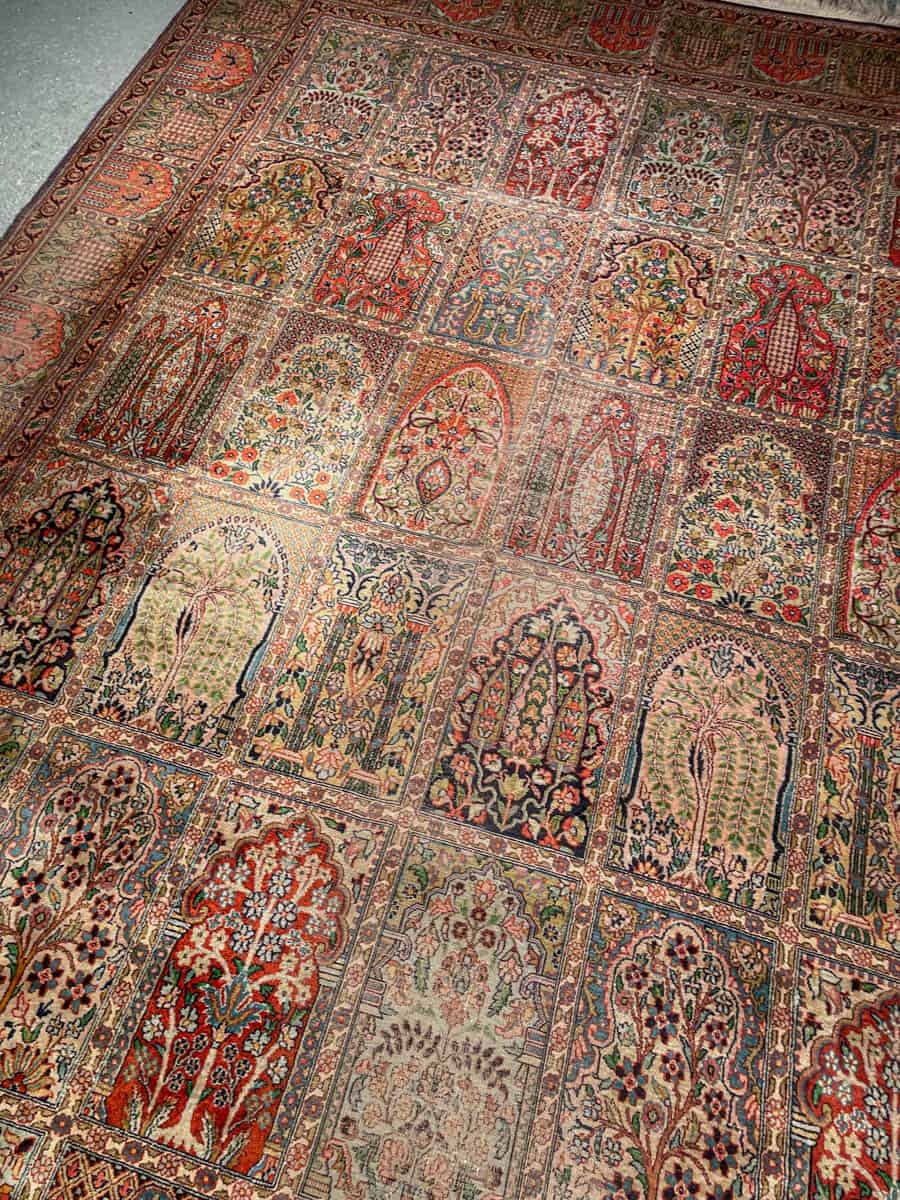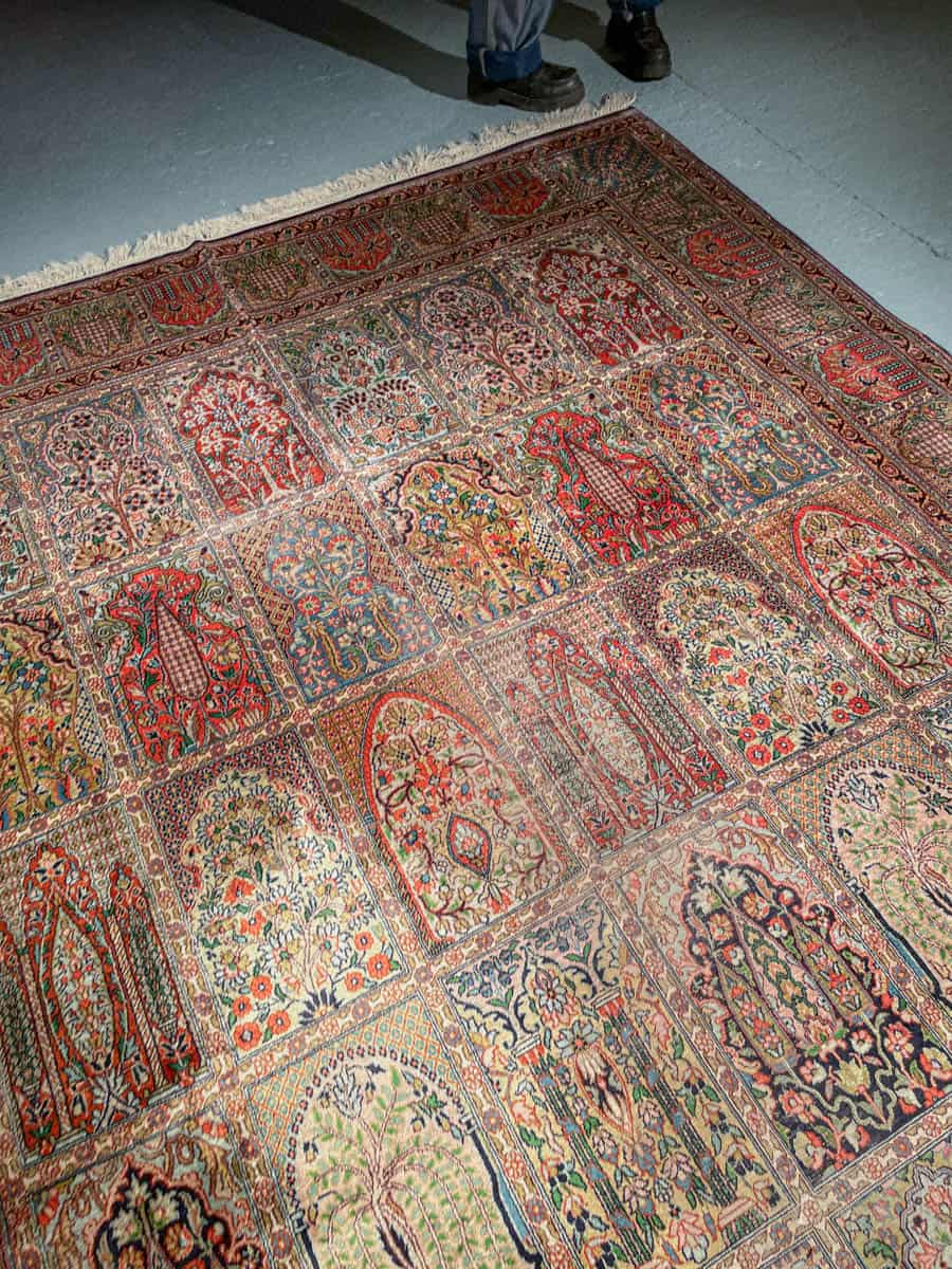 Äärimmäisen taidokkaasti käsinsolmittu Kasmir, jonka kenttää hallitsee tyrmäävä persialainen puutarha-paratiisiaiheinen sommitelma. Elegantille pastelliselle pohjalle rakennetussa kentässä kukkivat lukemattomat pienet ikkunat.