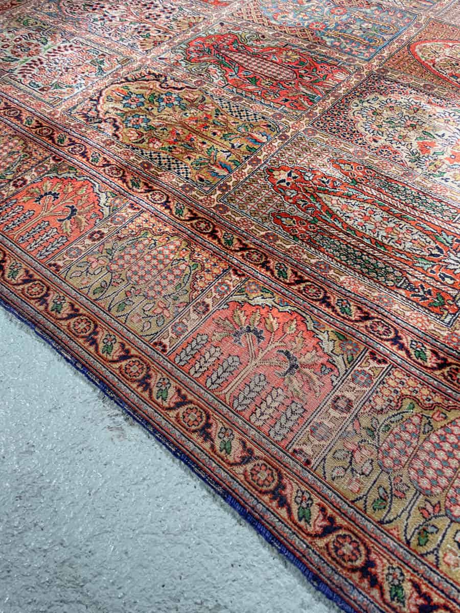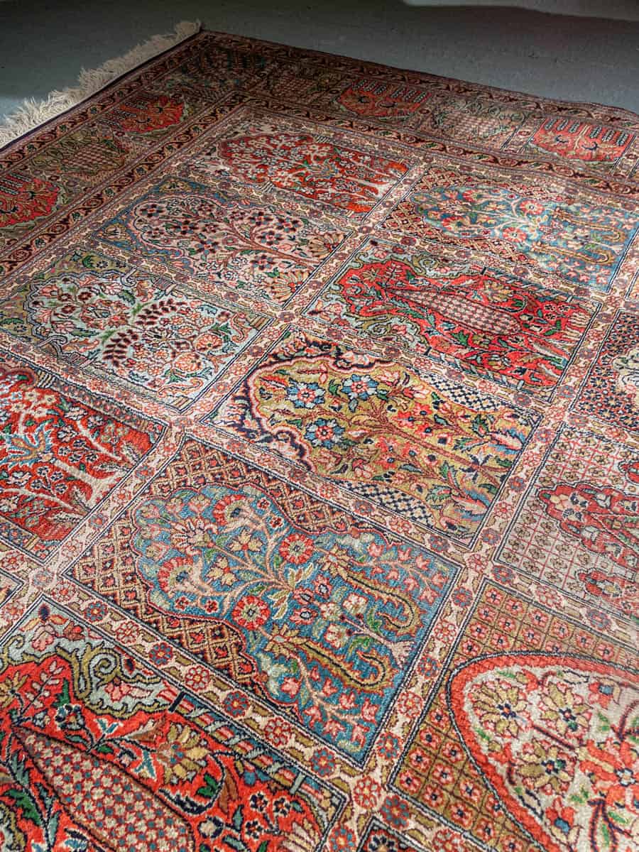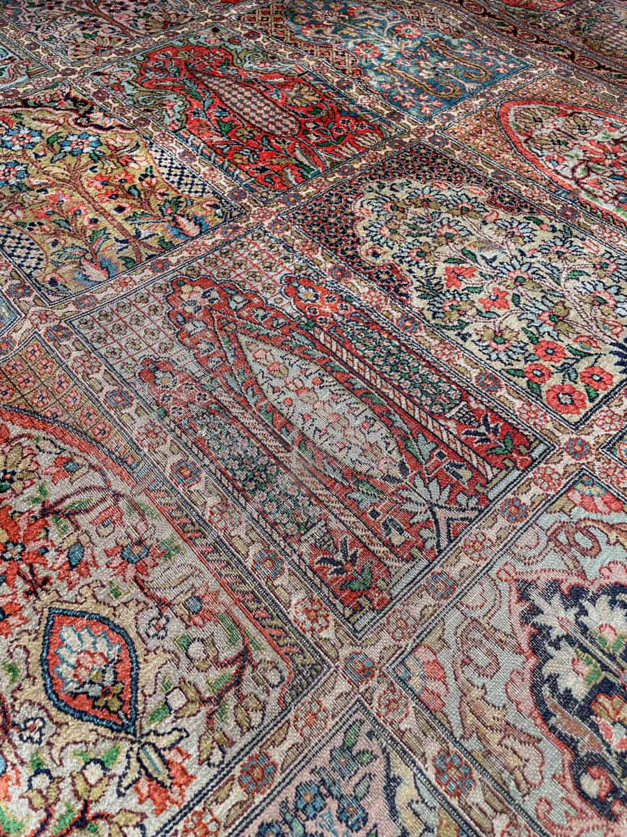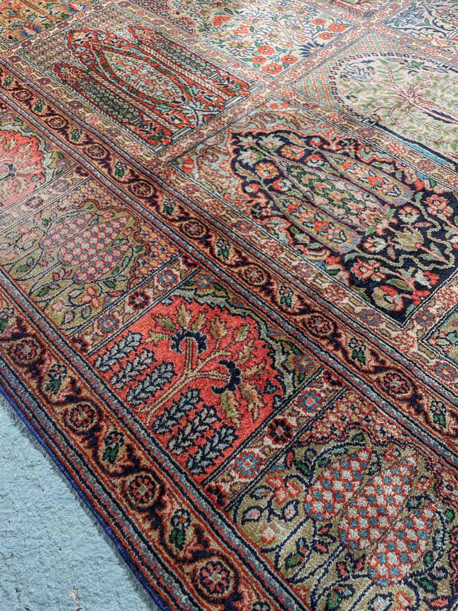 Äärimmäisen taidokkaasti käsinsolmittu Kasmir, jonka kenttää hallitsee tyrmäävä persialainen puutarha-paratiisiaiheinen sommitelma. Elegantille pastelliselle pohjalle rakennetussa kentässä kukkivat lukemattomat pienet ikkunat.
