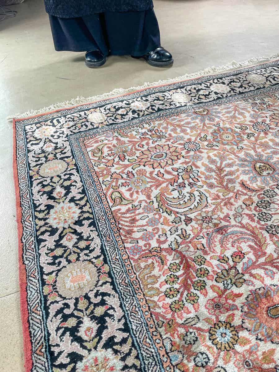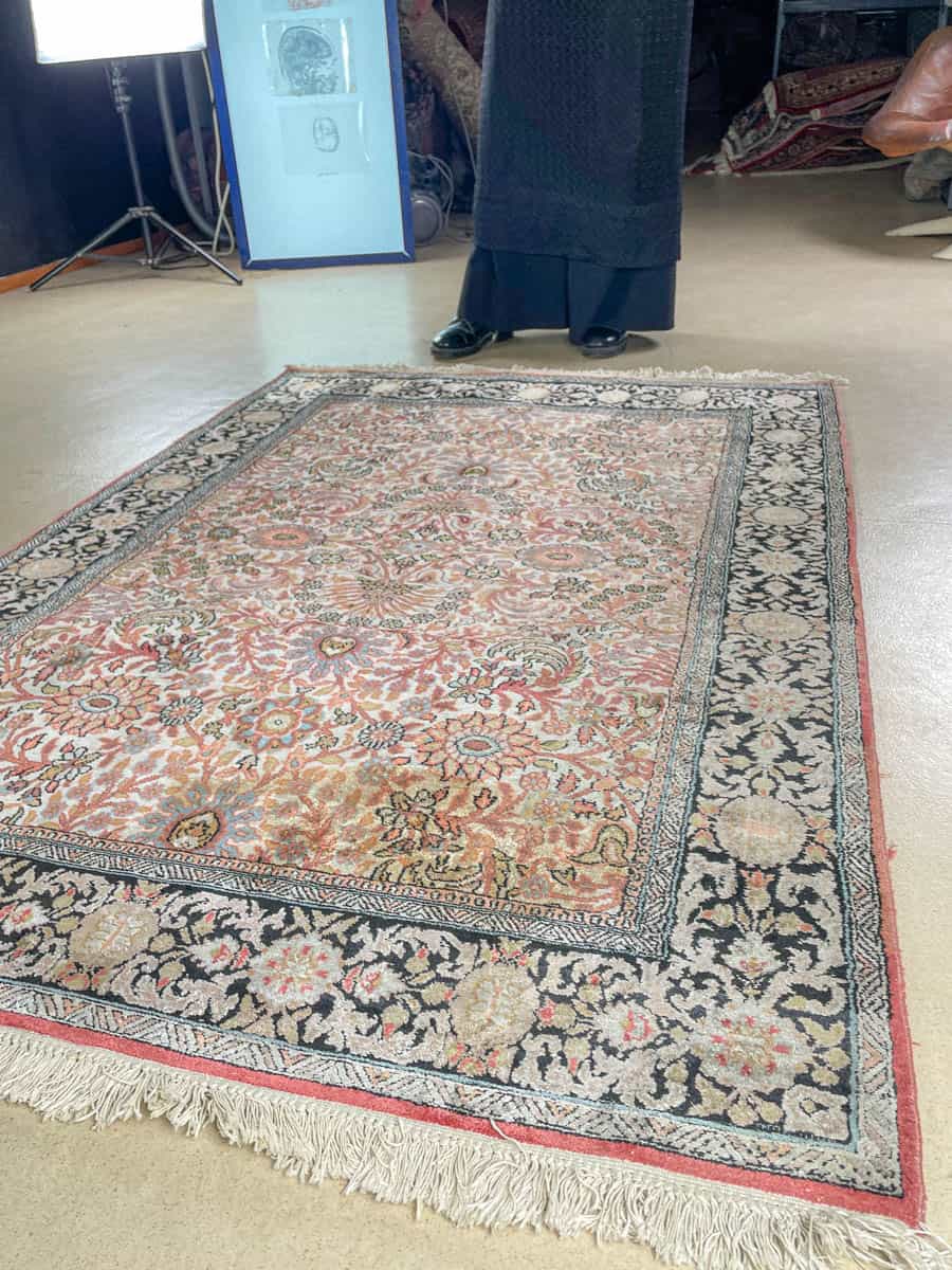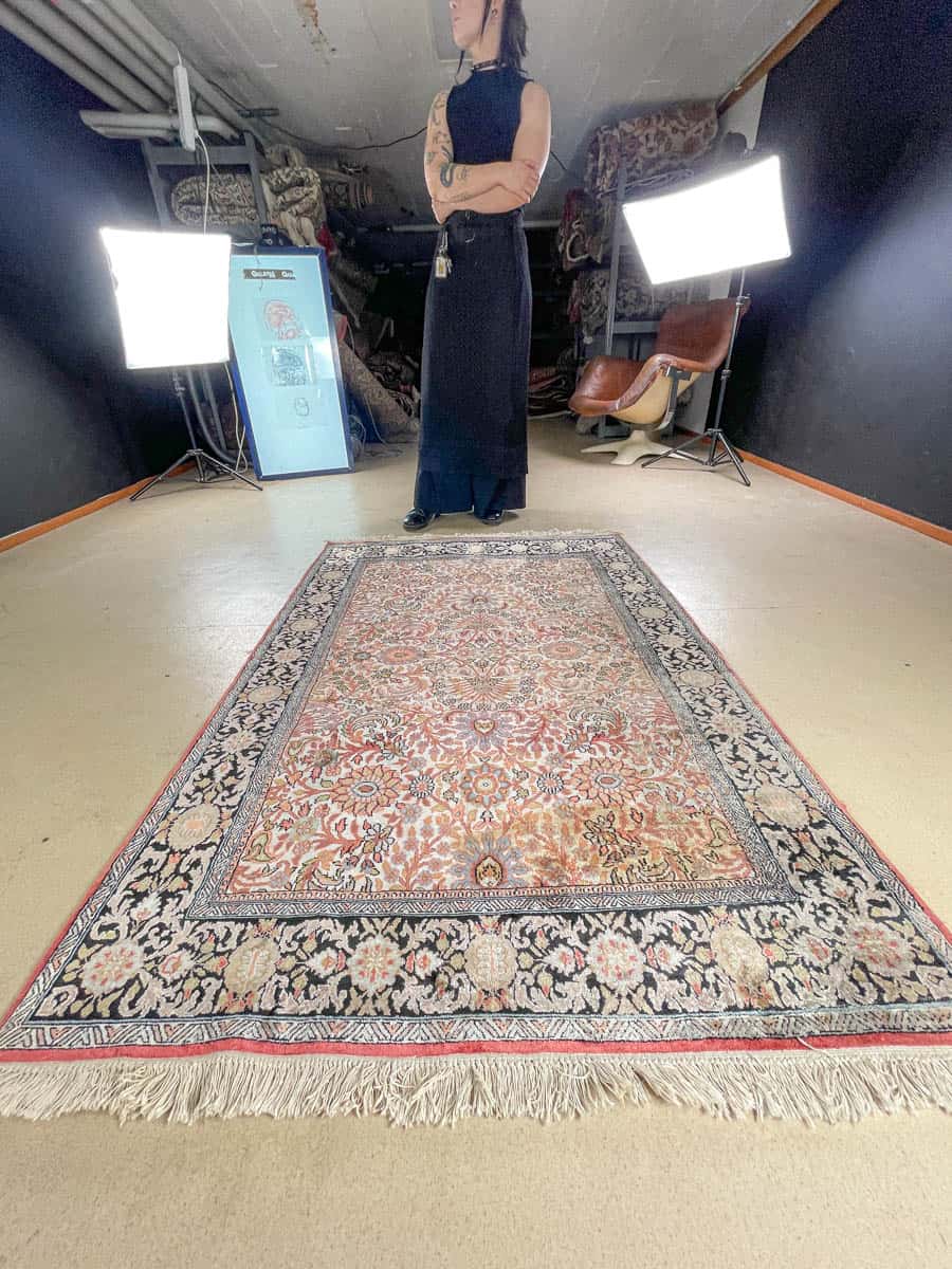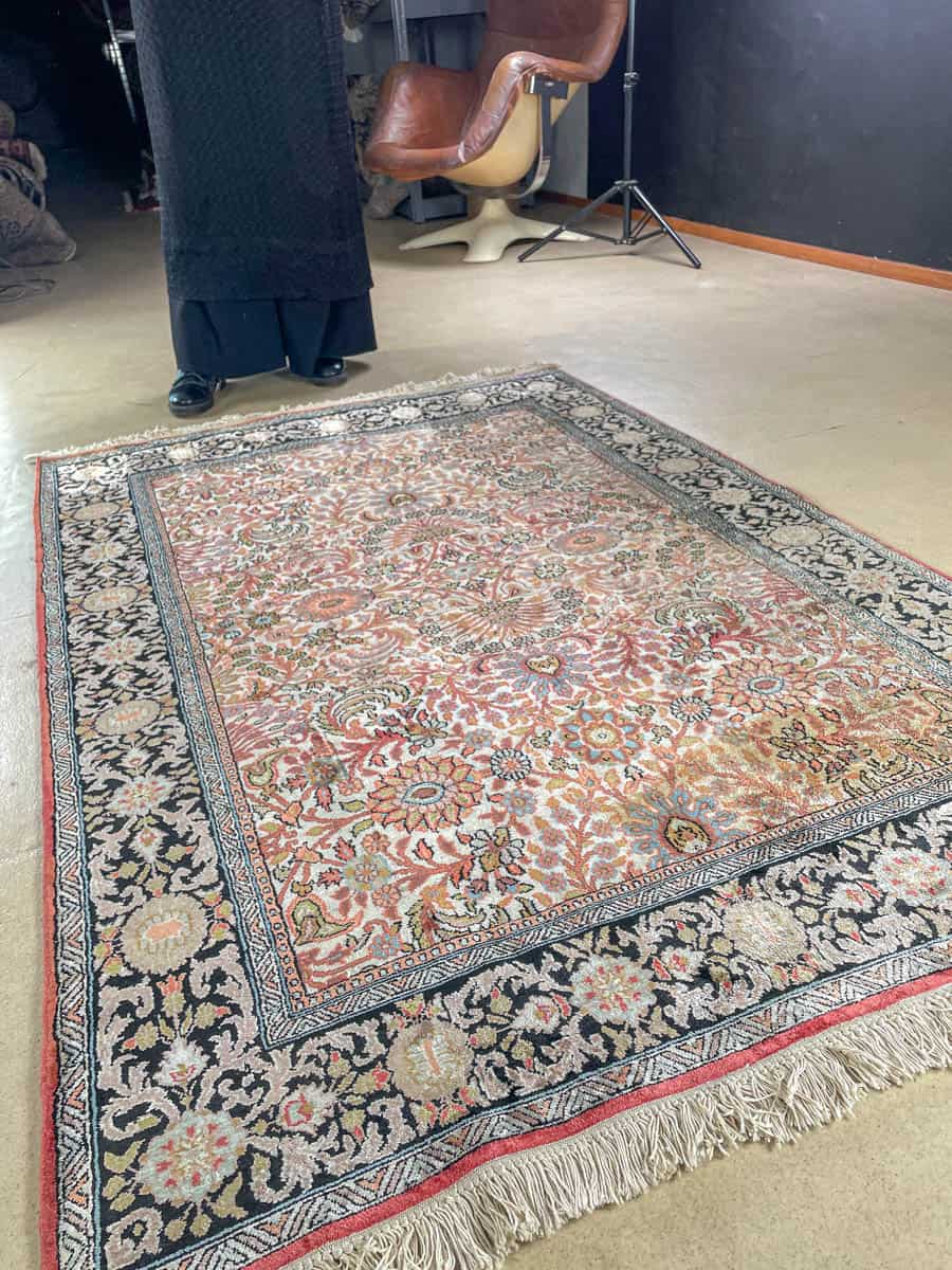 Tämä matto sijaitsee Töölön varastollamme – jos haluat tulla katsomaan sitä paikan päälle, sovithan näytön viestitse tai puhelimitse (Instagram @galleriamhelsinki, galleria@galleriam.fi, 0504394400).