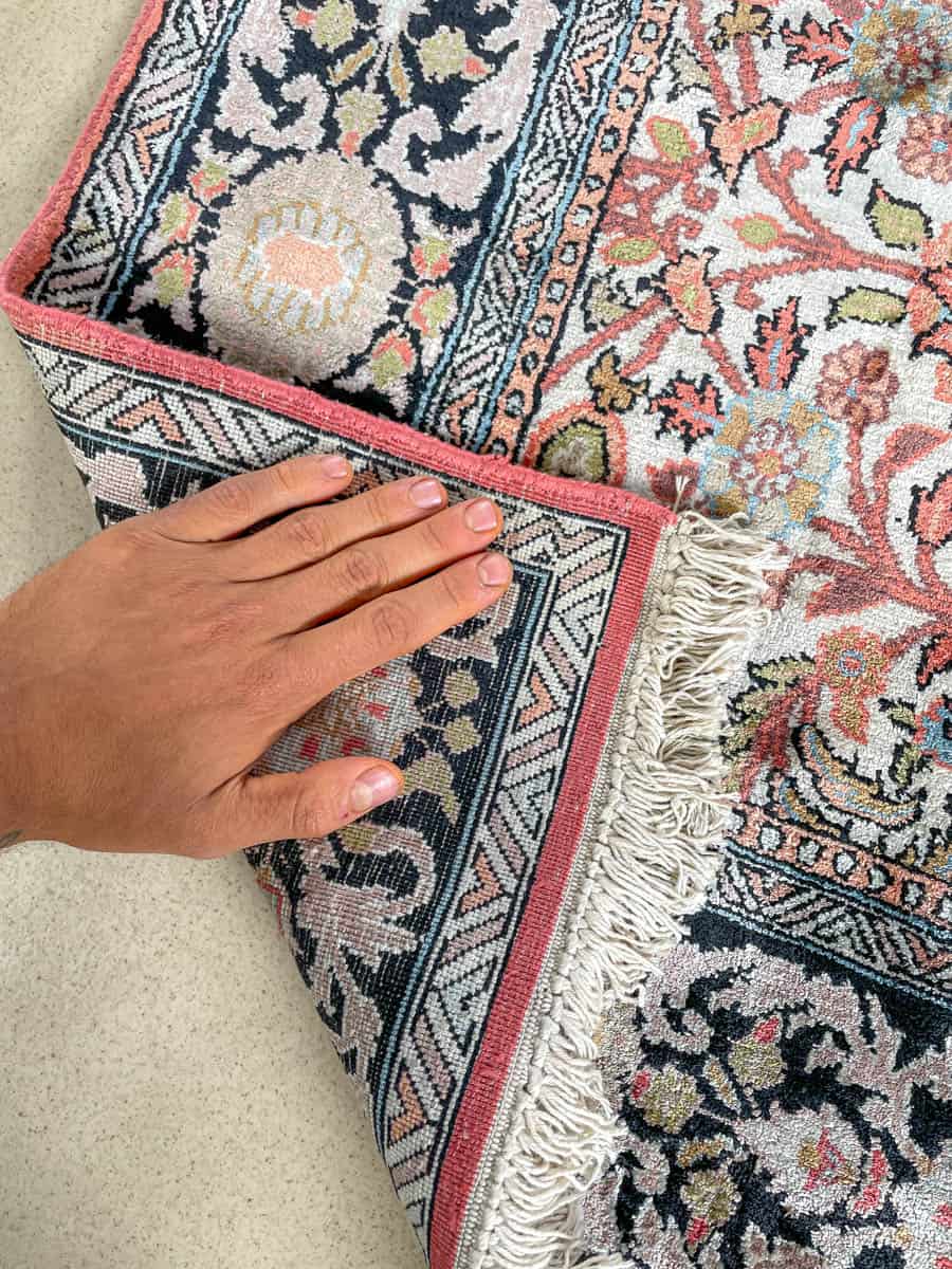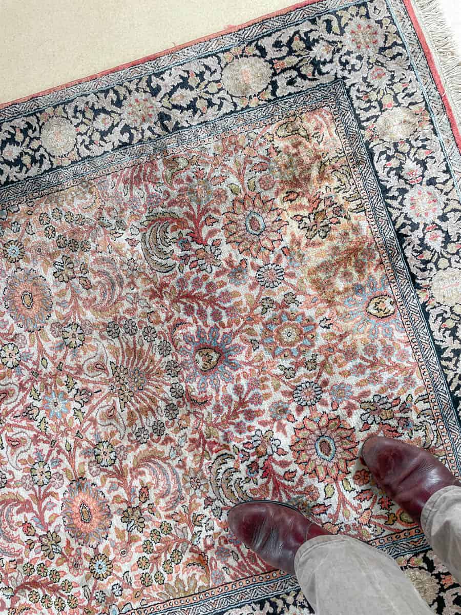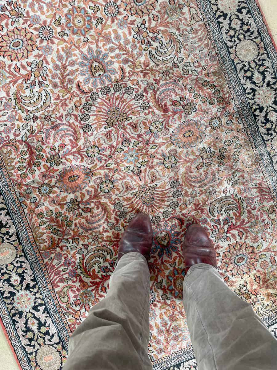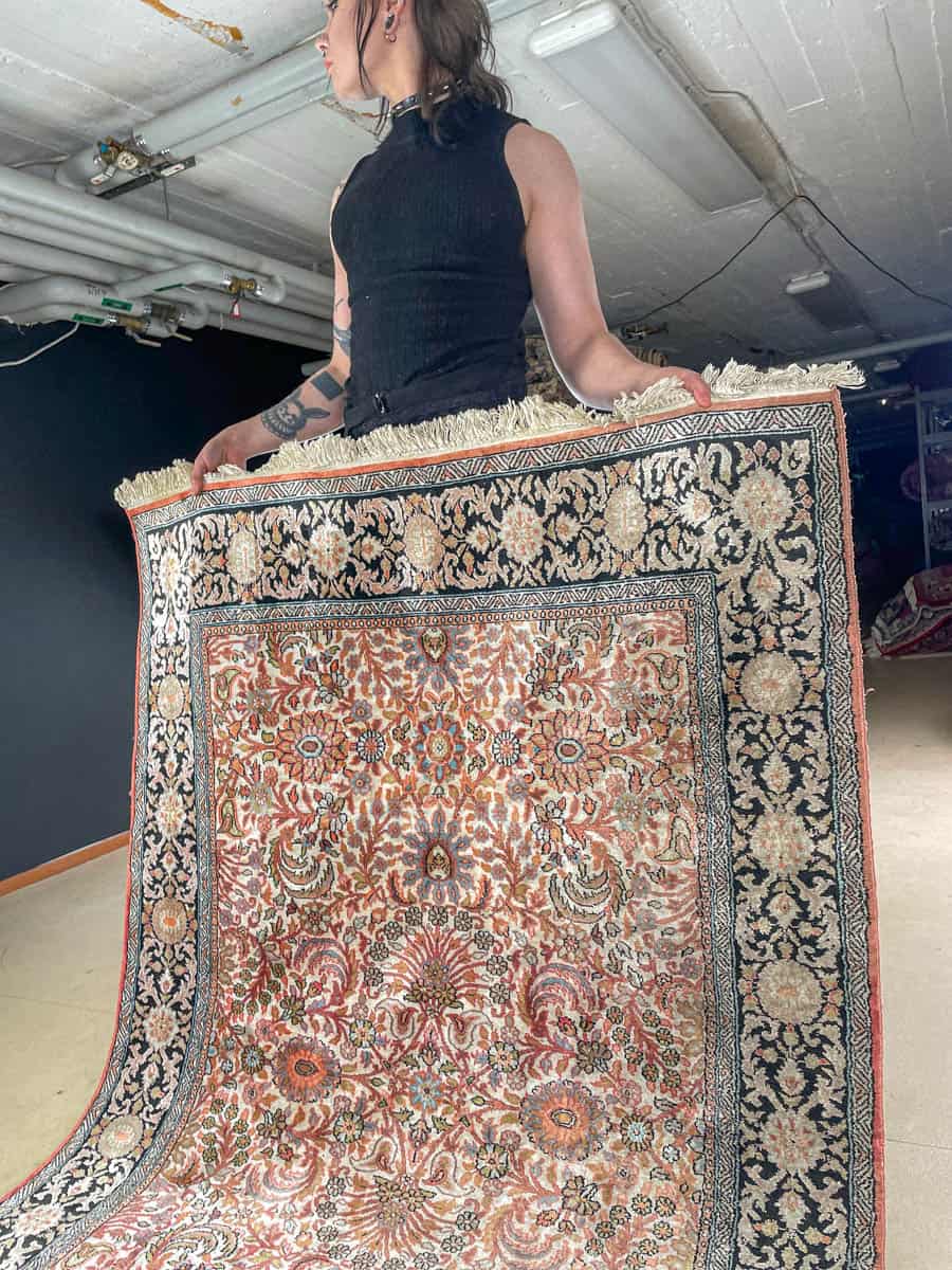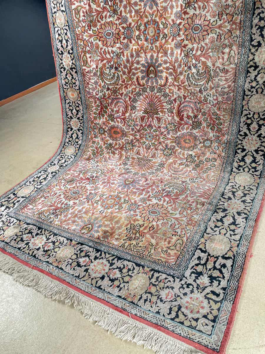 Tämä matto sijaitsee Töölön varastollamme – jos haluat tulla katsomaan sitä paikan päälle, sovithan näytön viestitse tai puhelimitse (Instagram @galleriamhelsinki, galleria@galleriam.fi, 0504394400).