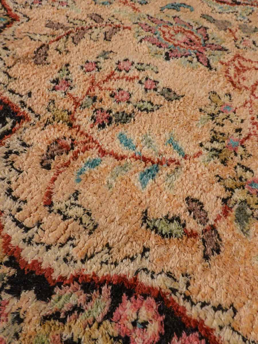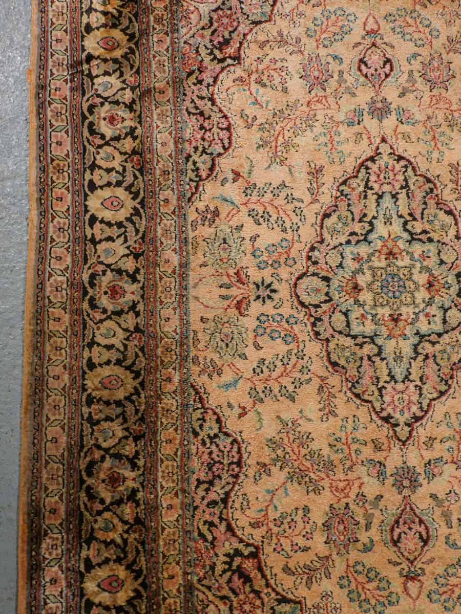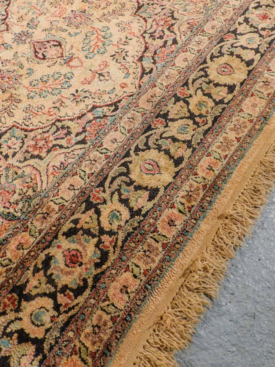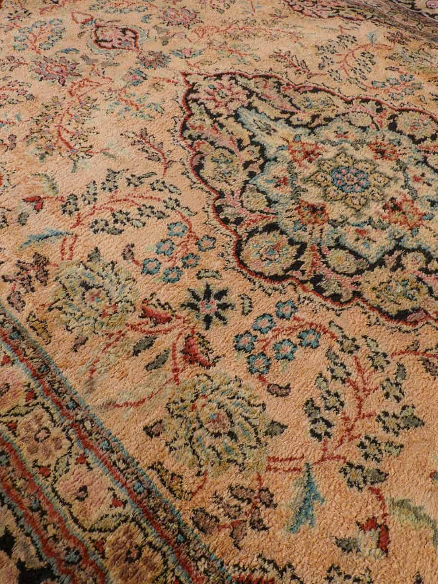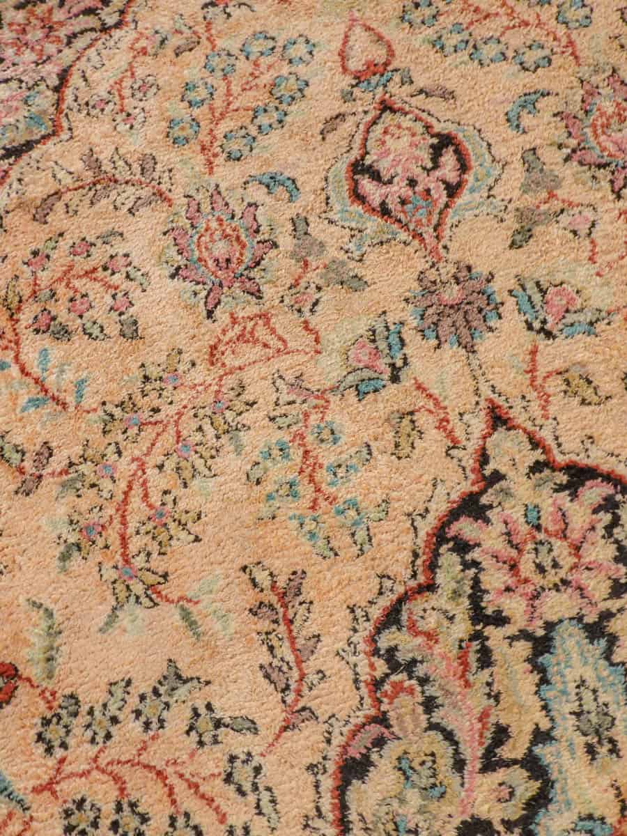 Perinteinen Kasmir-silkkimatto lämpimän sävykkäällä sävymaailmalla ja yksityiskohtaisilla kukkaiskuvioinneilla.