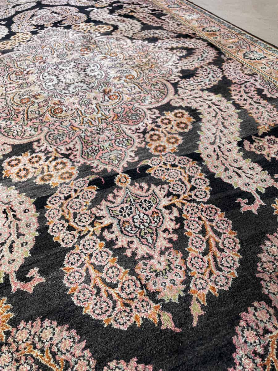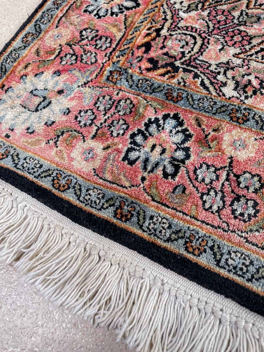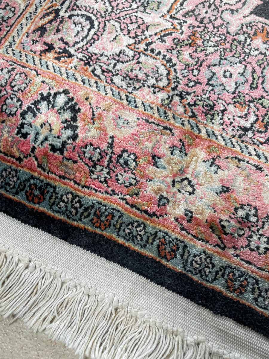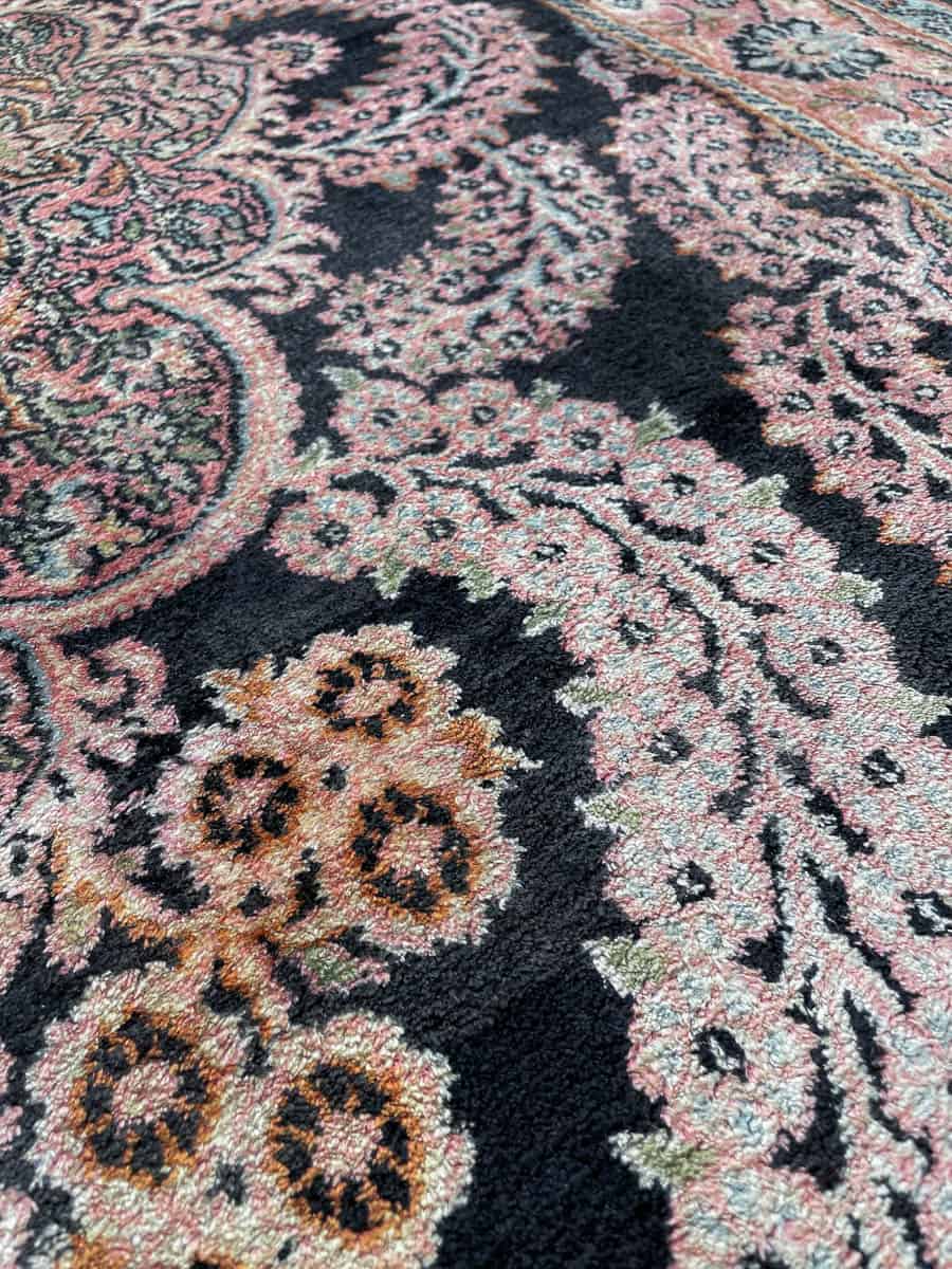 Henkeäsalpaava Kasmir-silkkimatto, jonka tumma tausta korostaa heleitä pastellisävyjä ja runsaita kukkakiehkuroita, tehden kuvioinnista lähes kolmiulotteisen. Lämpimät oranssin ja pinkin sävyt kiiltelevät silkillä kauniisti.