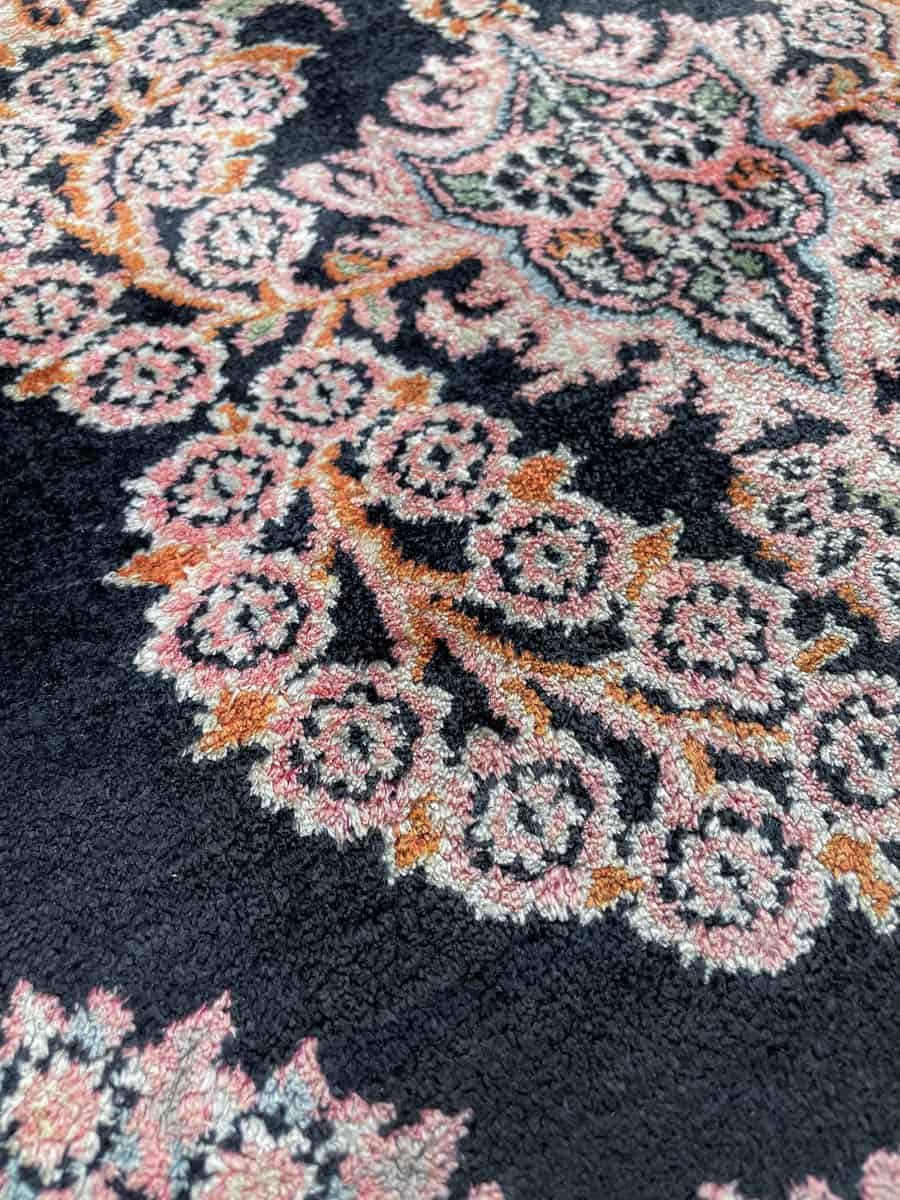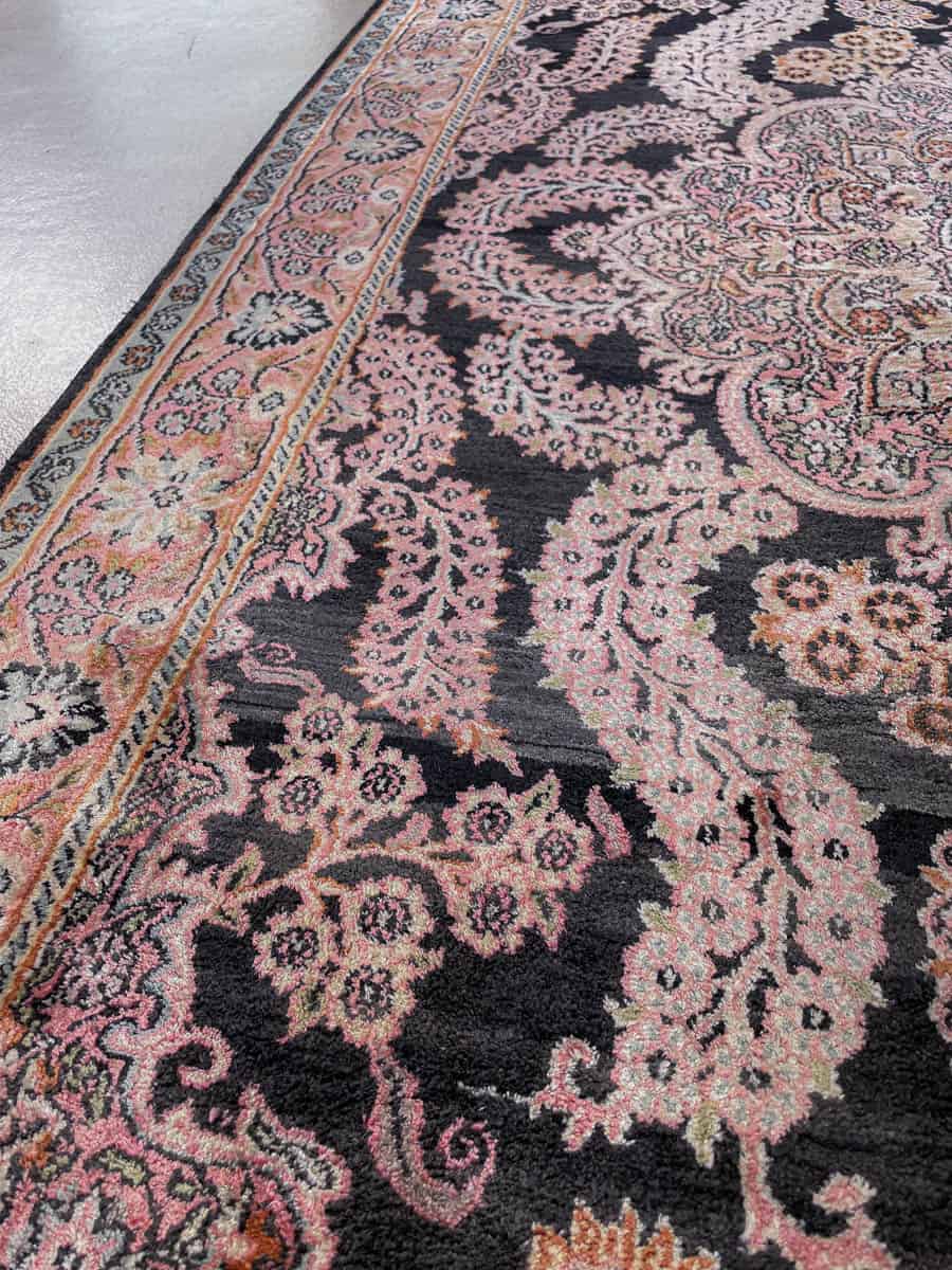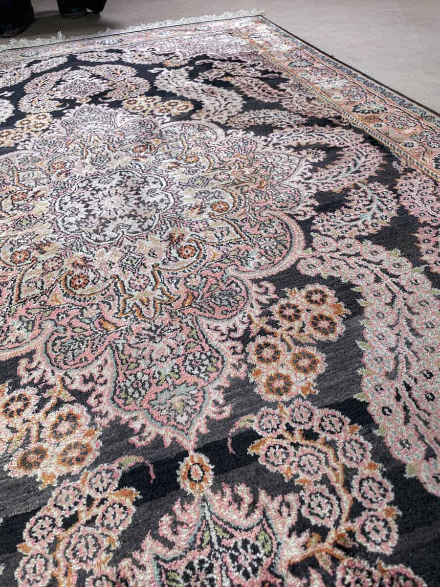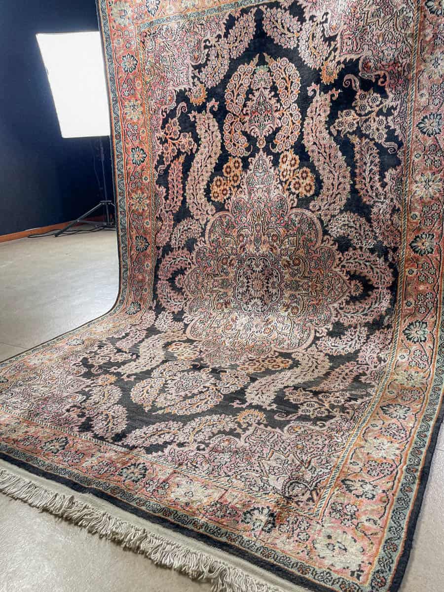 Henkeäsalpaava Kasmir-silkkimatto, jonka tumma tausta korostaa heleitä pastellisävyjä ja runsaita kukkakiehkuroita, tehden kuvioinnista lähes kolmiulotteisen. Lämpimät oranssin ja pinkin sävyt kiiltelevät silkillä kauniisti.