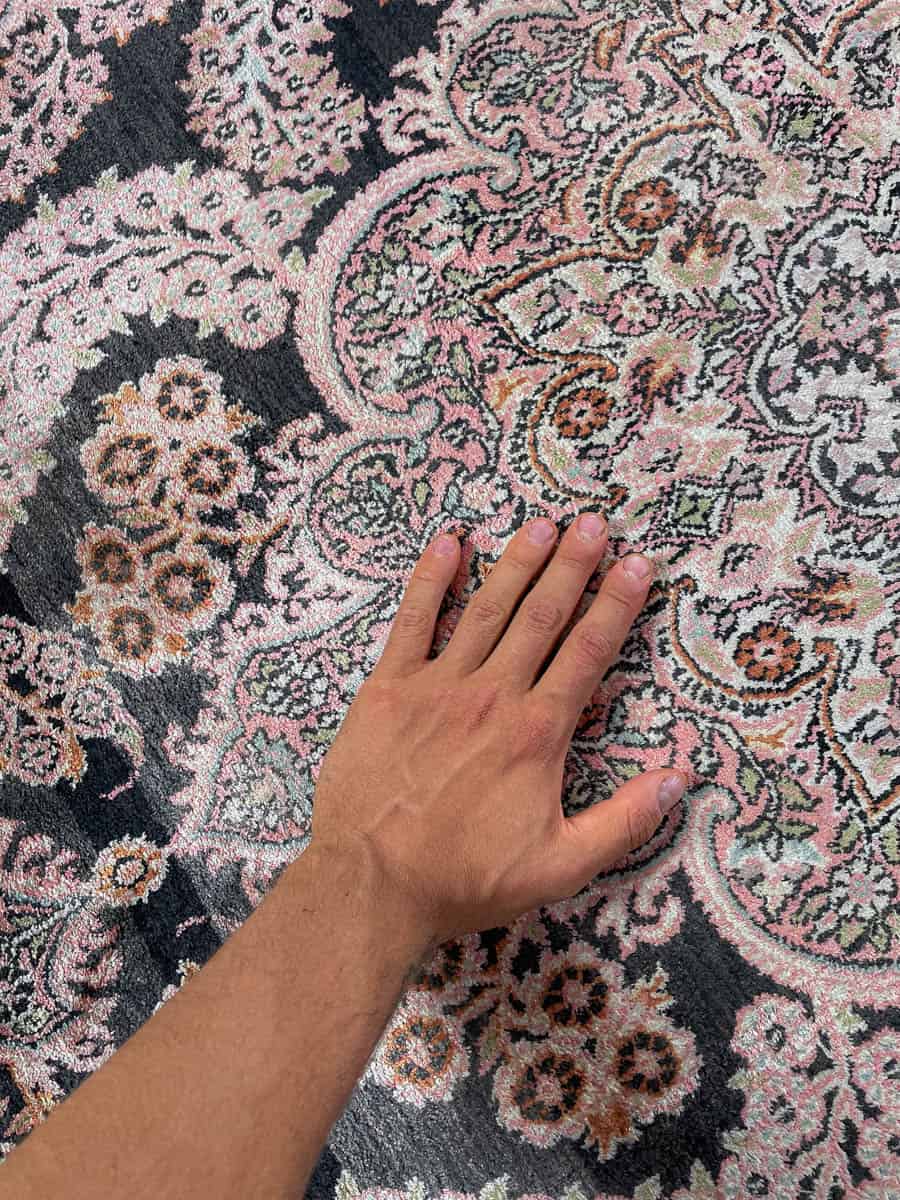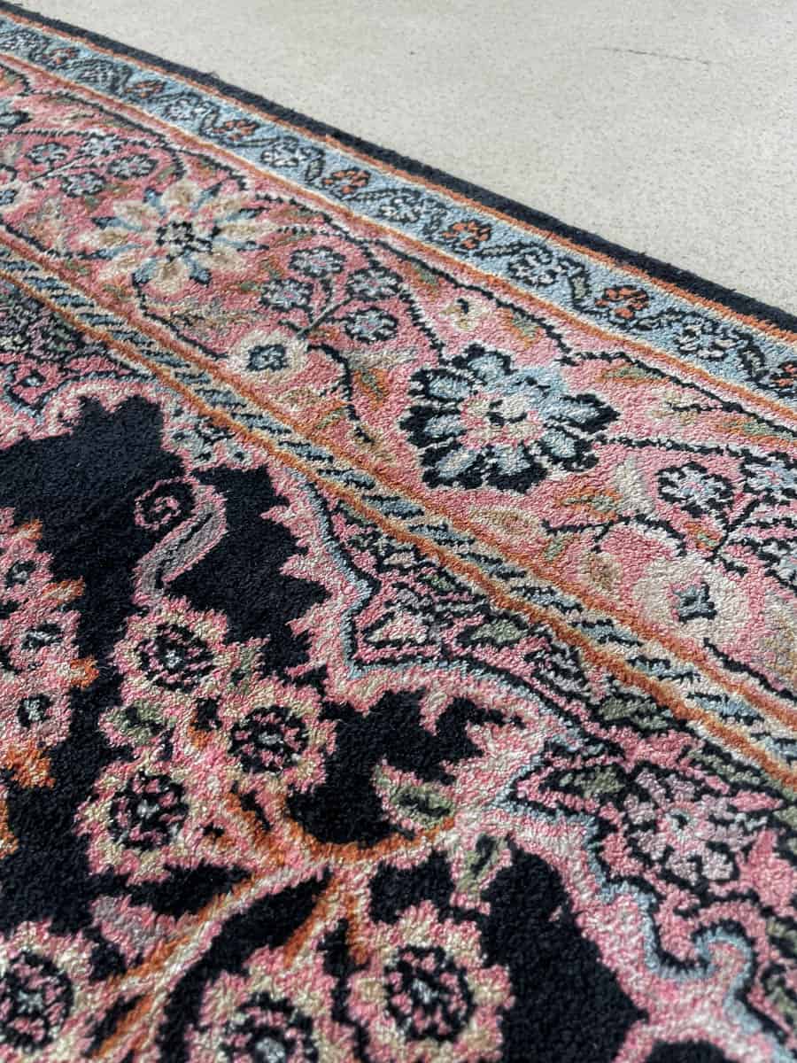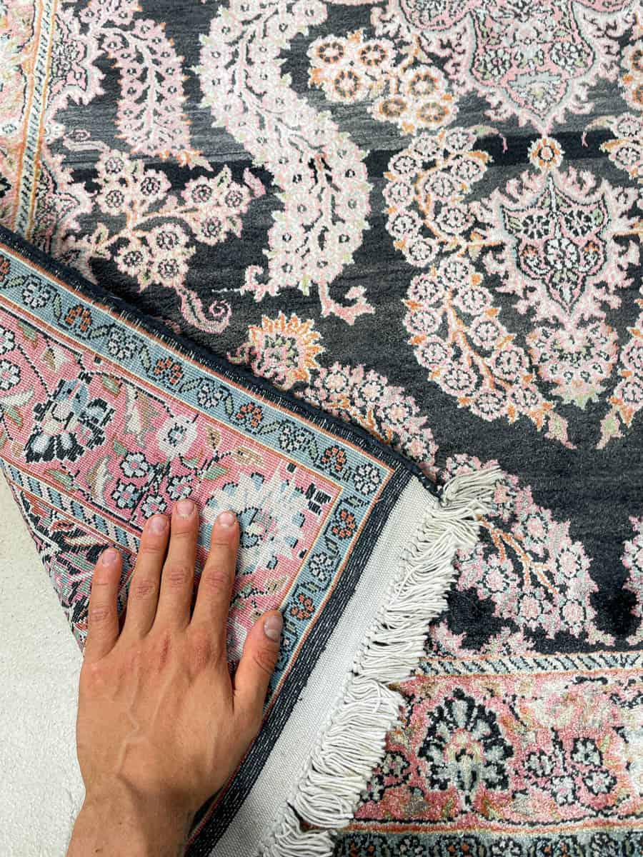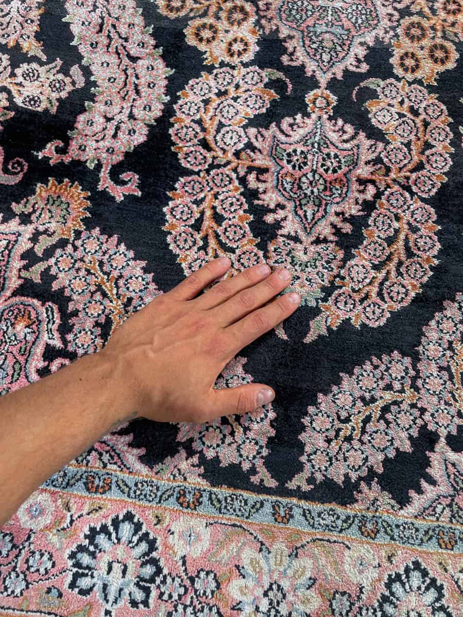 Henkeäsalpaava Kasmir-silkkimatto, jonka tumma tausta korostaa heleitä pastellisävyjä ja runsaita kukkakiehkuroita, tehden kuvioinnista lähes kolmiulotteisen. Lämpimät oranssin ja pinkin sävyt kiiltelevät silkillä kauniisti.