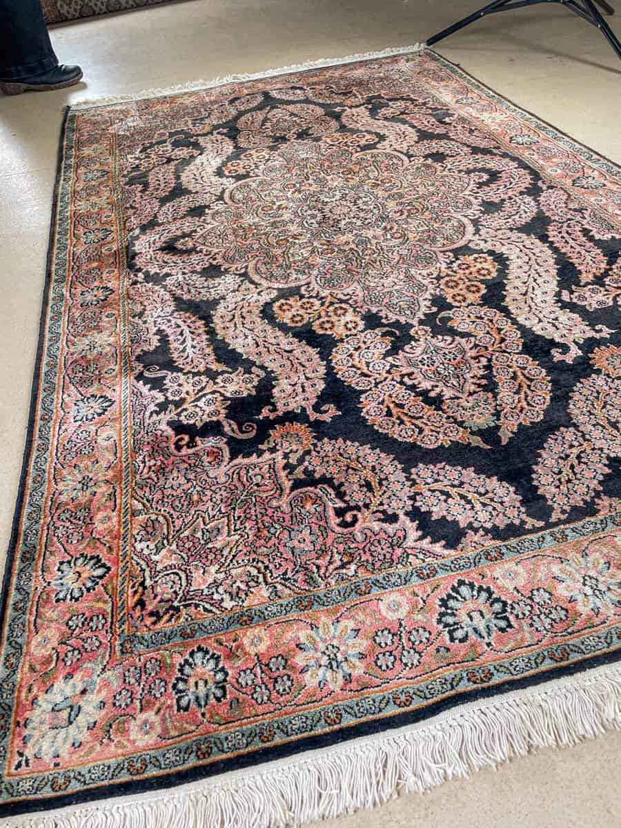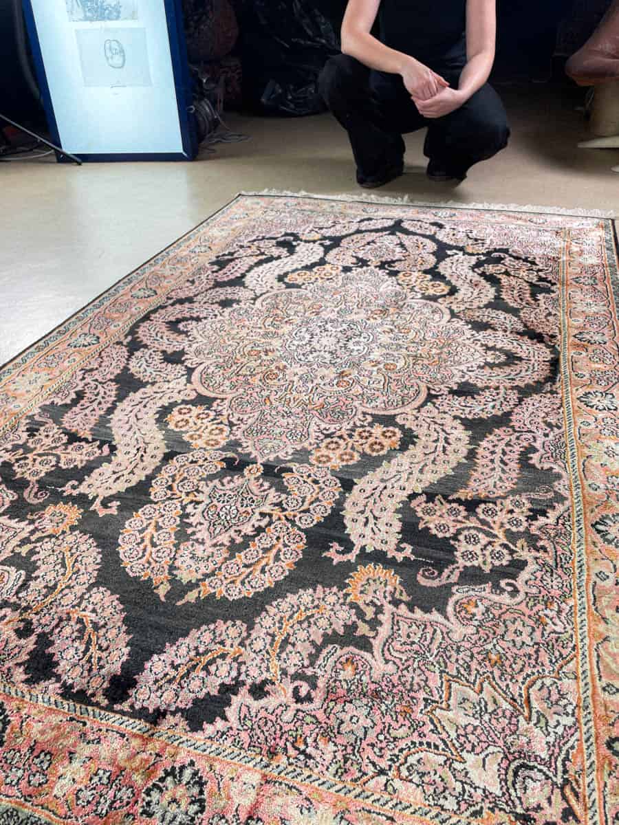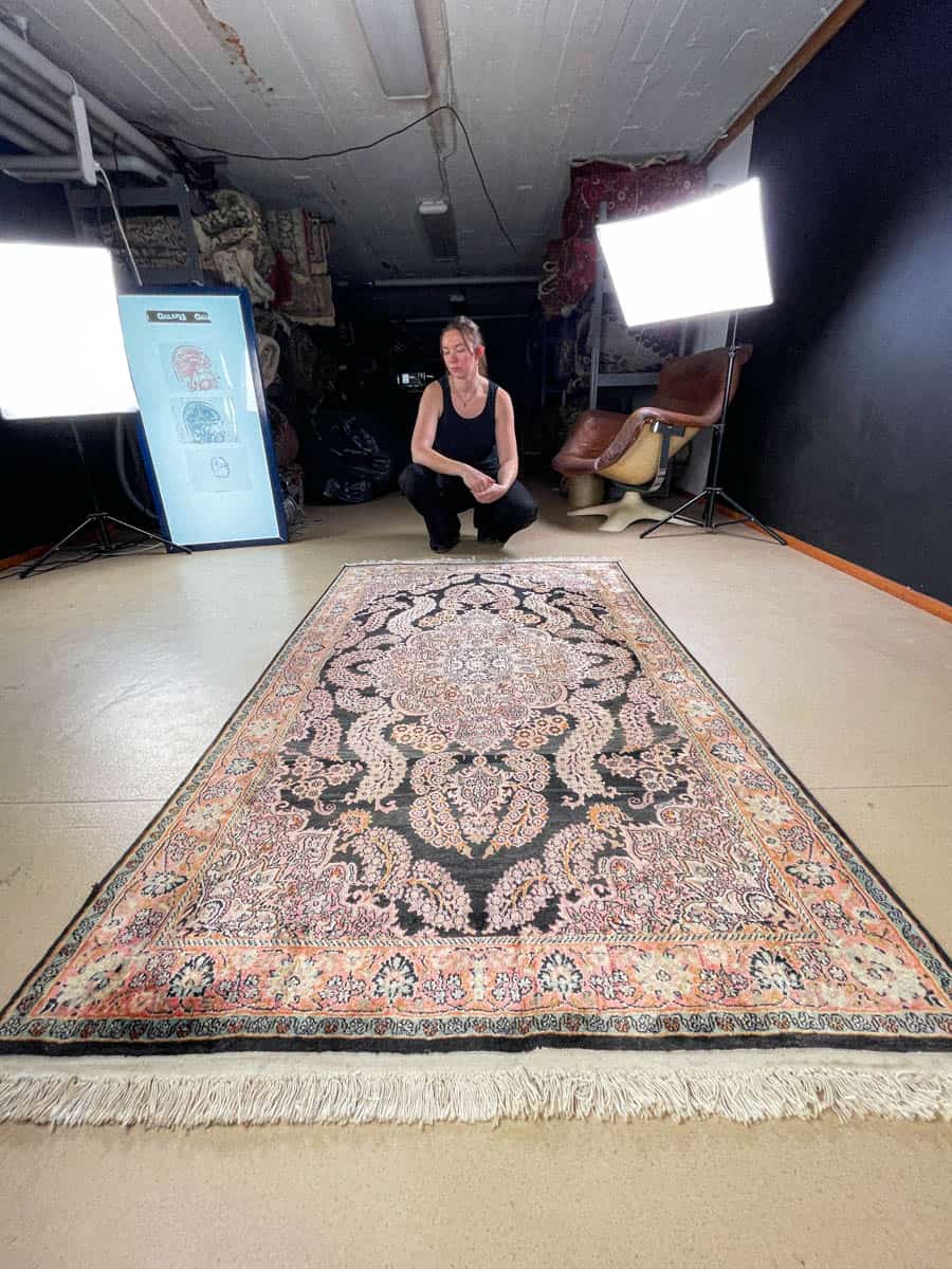 Tämä matto sijaitsee Töölön varastollamme – jos haluat tulla katsomaan sitä paikan päälle, sovithan näytön viestitse tai puhelimitse.