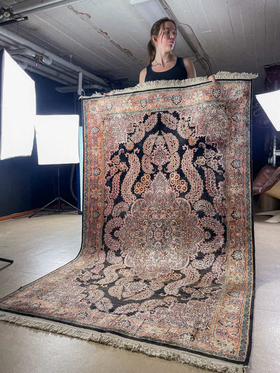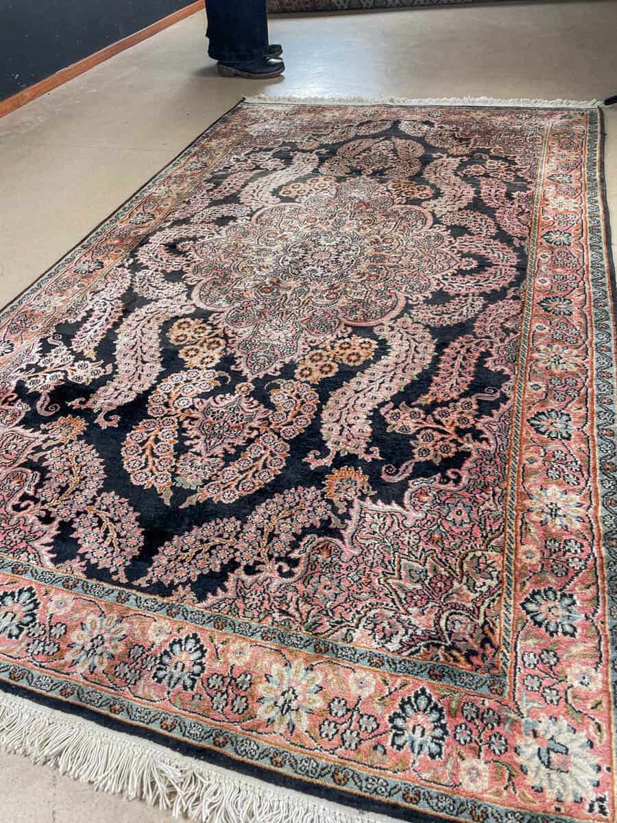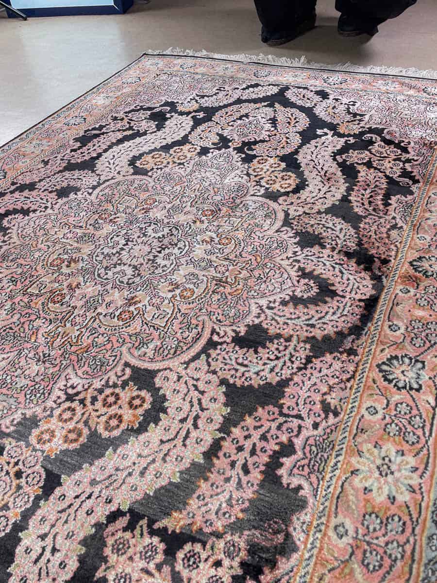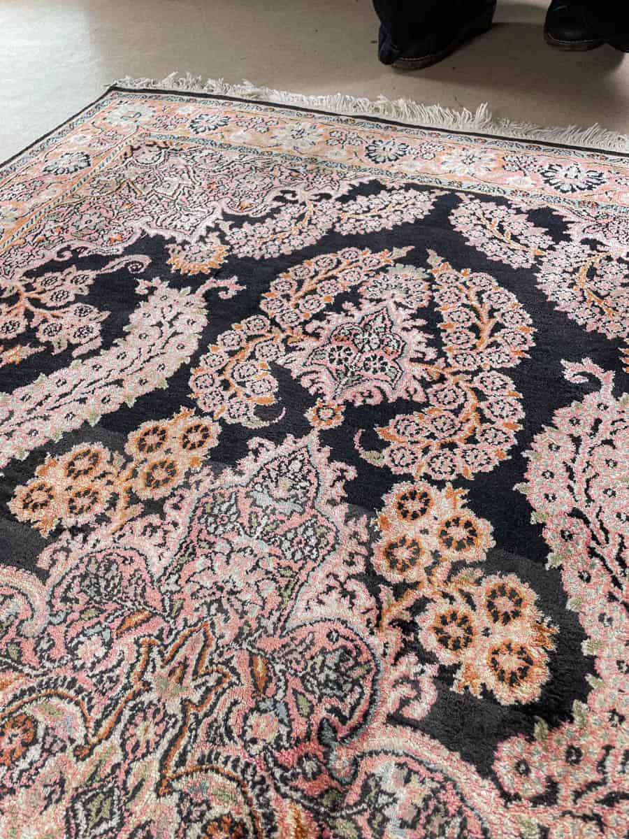 Tämä matto sijaitsee Töölön varastollamme – jos haluat tulla katsomaan sitä paikan päälle, sovithan näytön viestitse tai puhelimitse.
