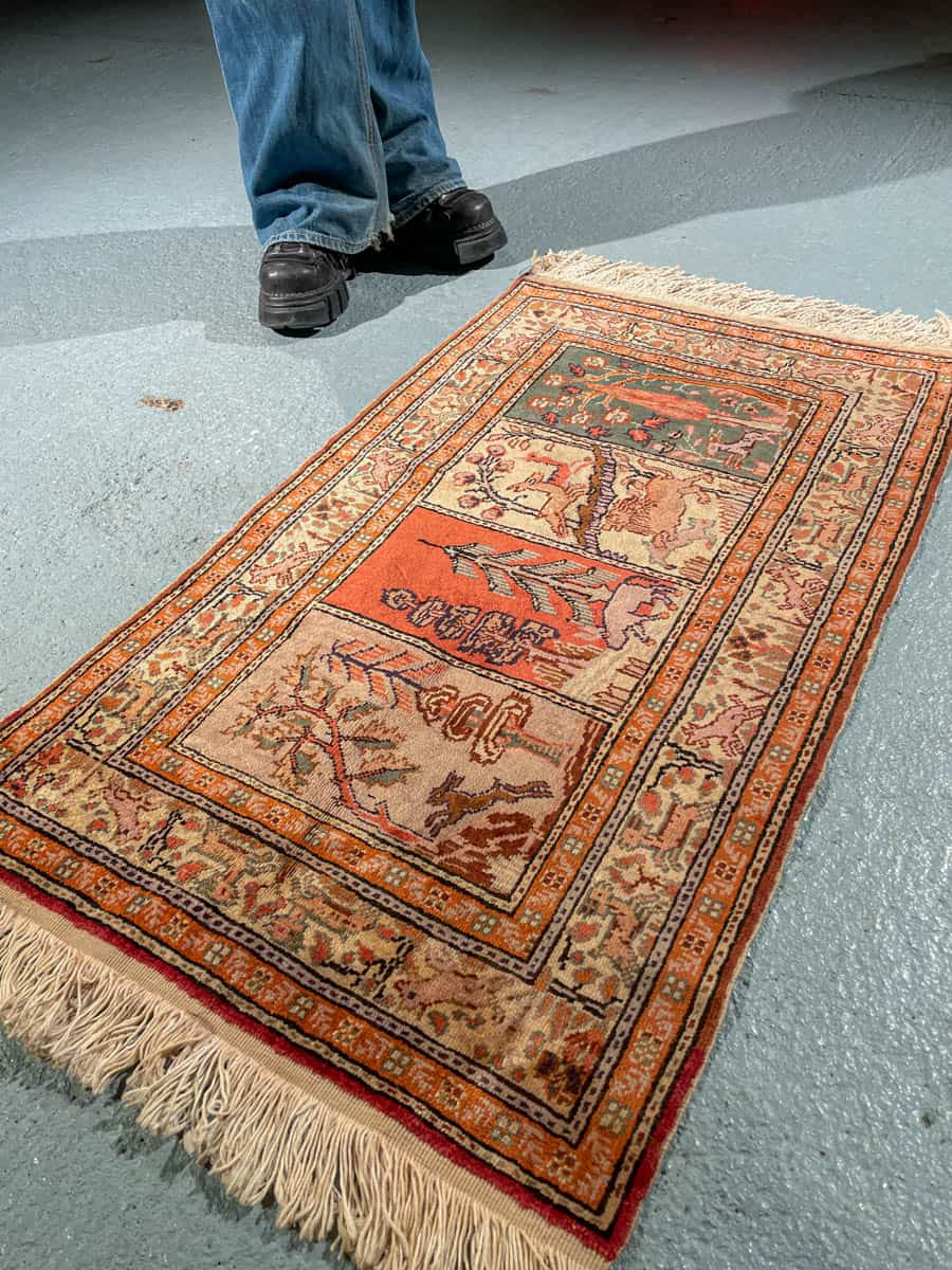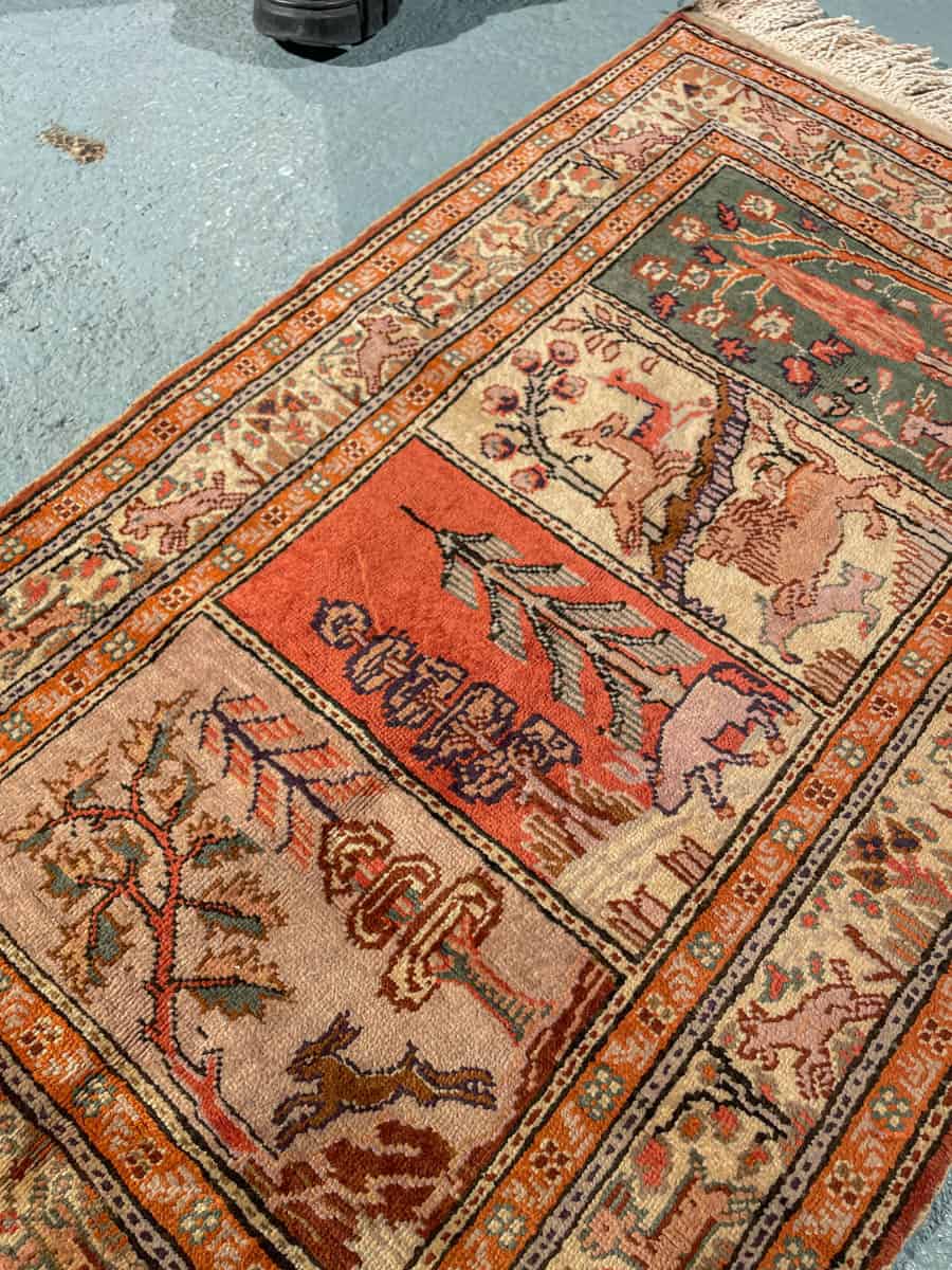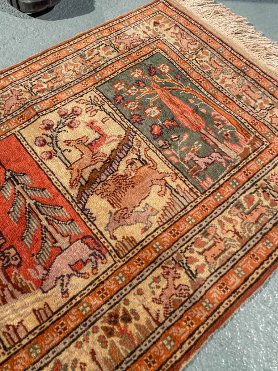 Upea pieni Kayseri-silkkimatto hillityn harmonisella väriteemalla ja uniikilla eläinaiheisella kuvioinnilla. Käsinsolmittu silkistä puuvillaloimelle.
