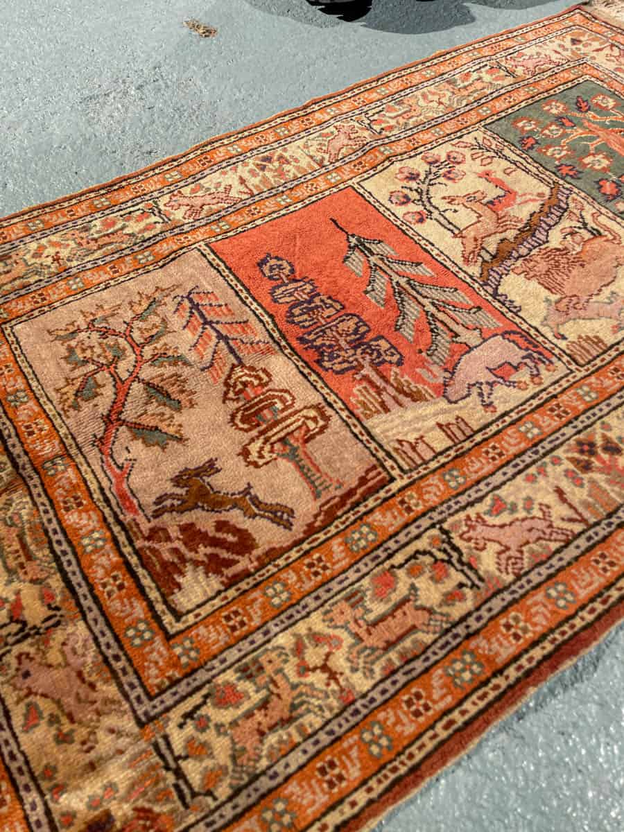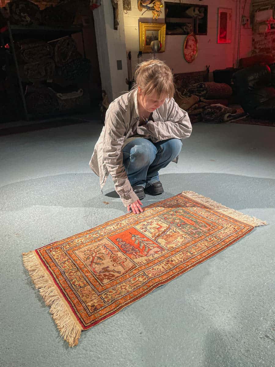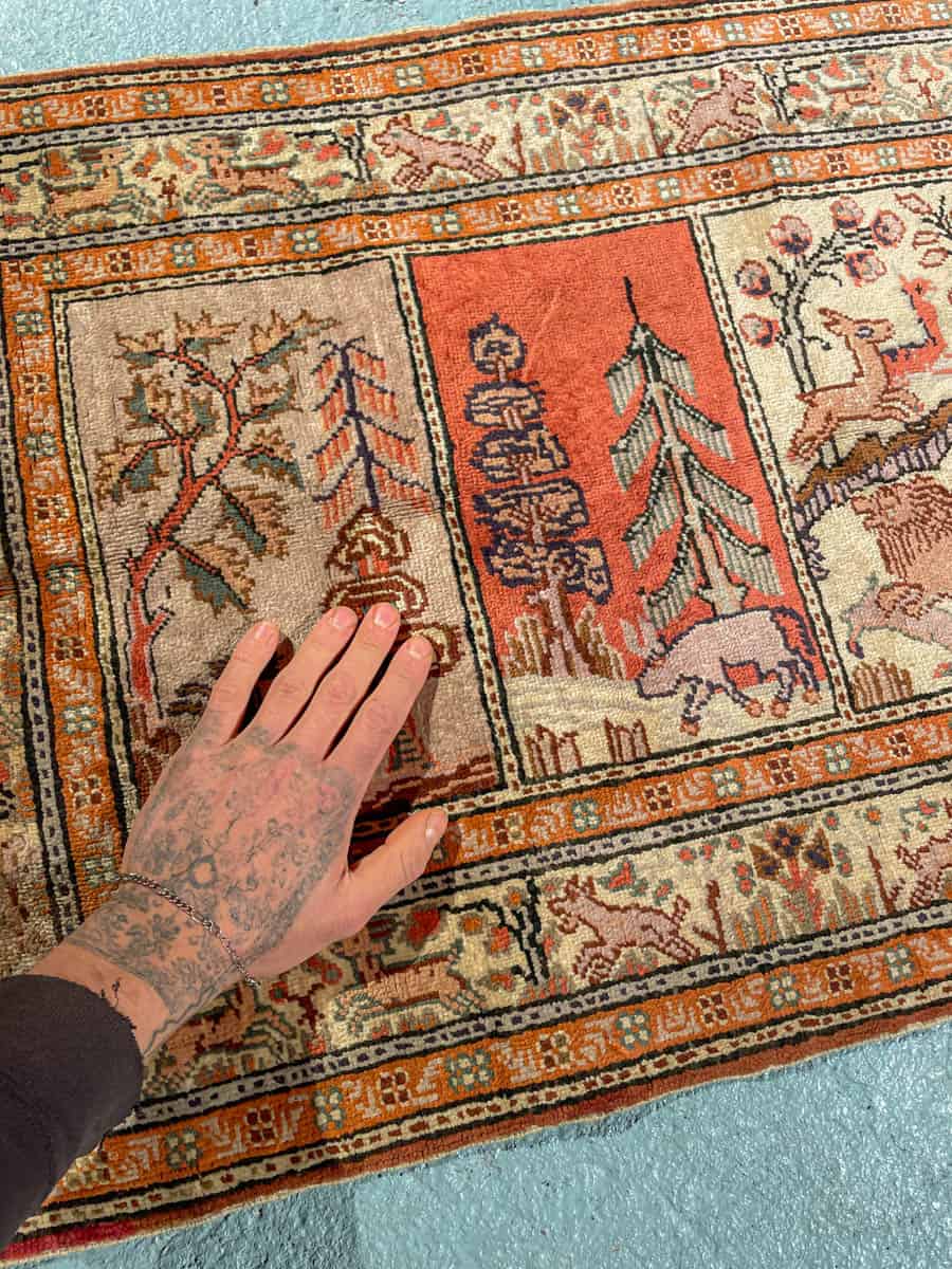 Upea pieni Kayseri-silkkimatto hillityn harmonisella väriteemalla ja uniikilla eläinaiheisella kuvioinnilla. Käsinsolmittu silkistä puuvillaloimelle.