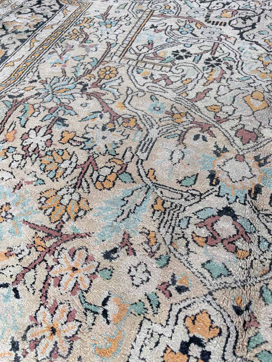 Rauhoittavan vaalea ja yksityiskohtainen Kasmir-silkkimatto. Uniikki ja juhlallinen kuviointi. Solmittu silkistä puuvillaloimelle.