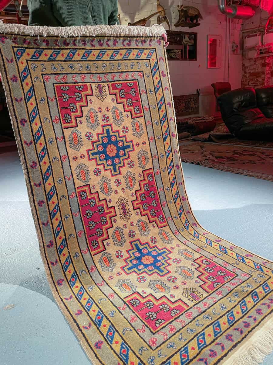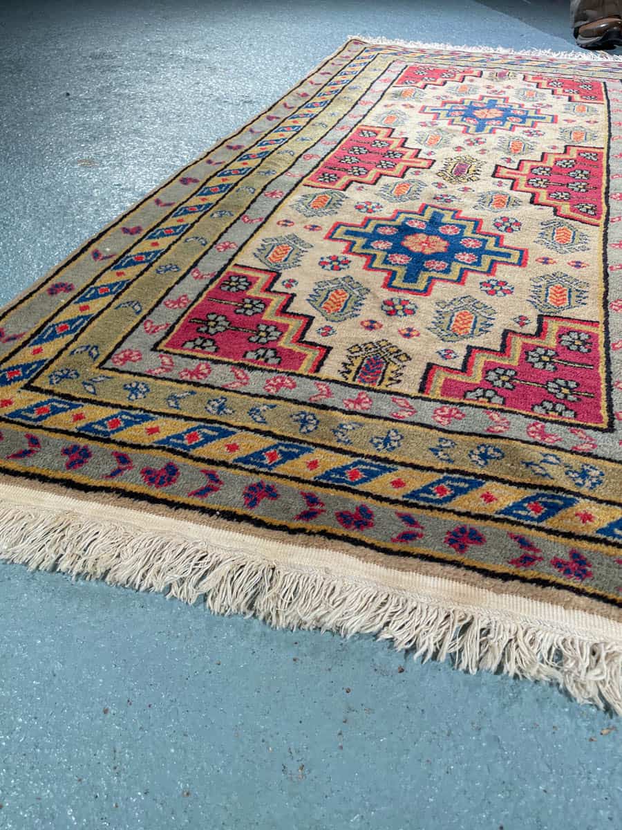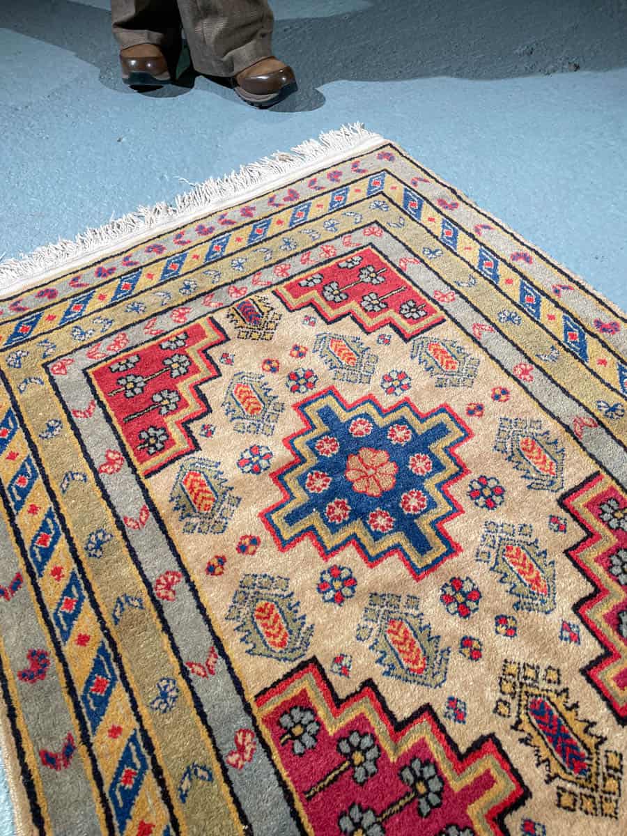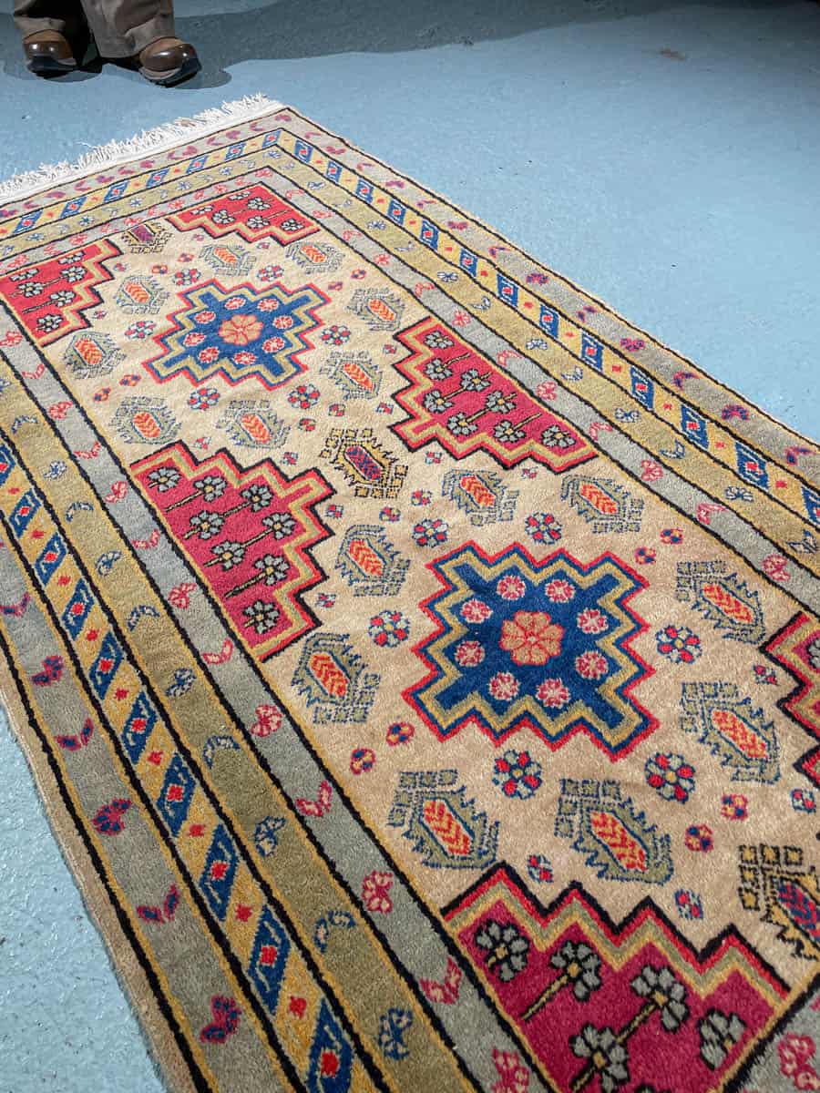 Soma kazakkimatto rauhoittavalla värimaailmalla ja geometrisella kuvioinnilla. Käsinsolmittu villasta.