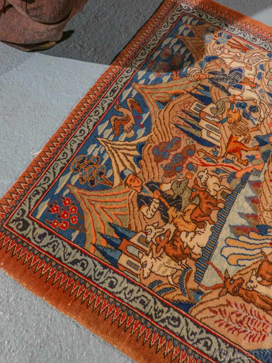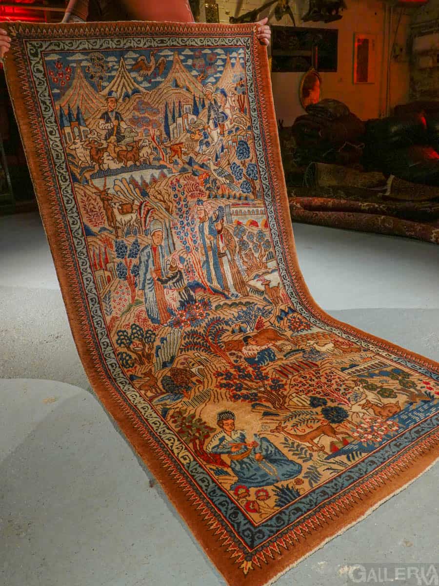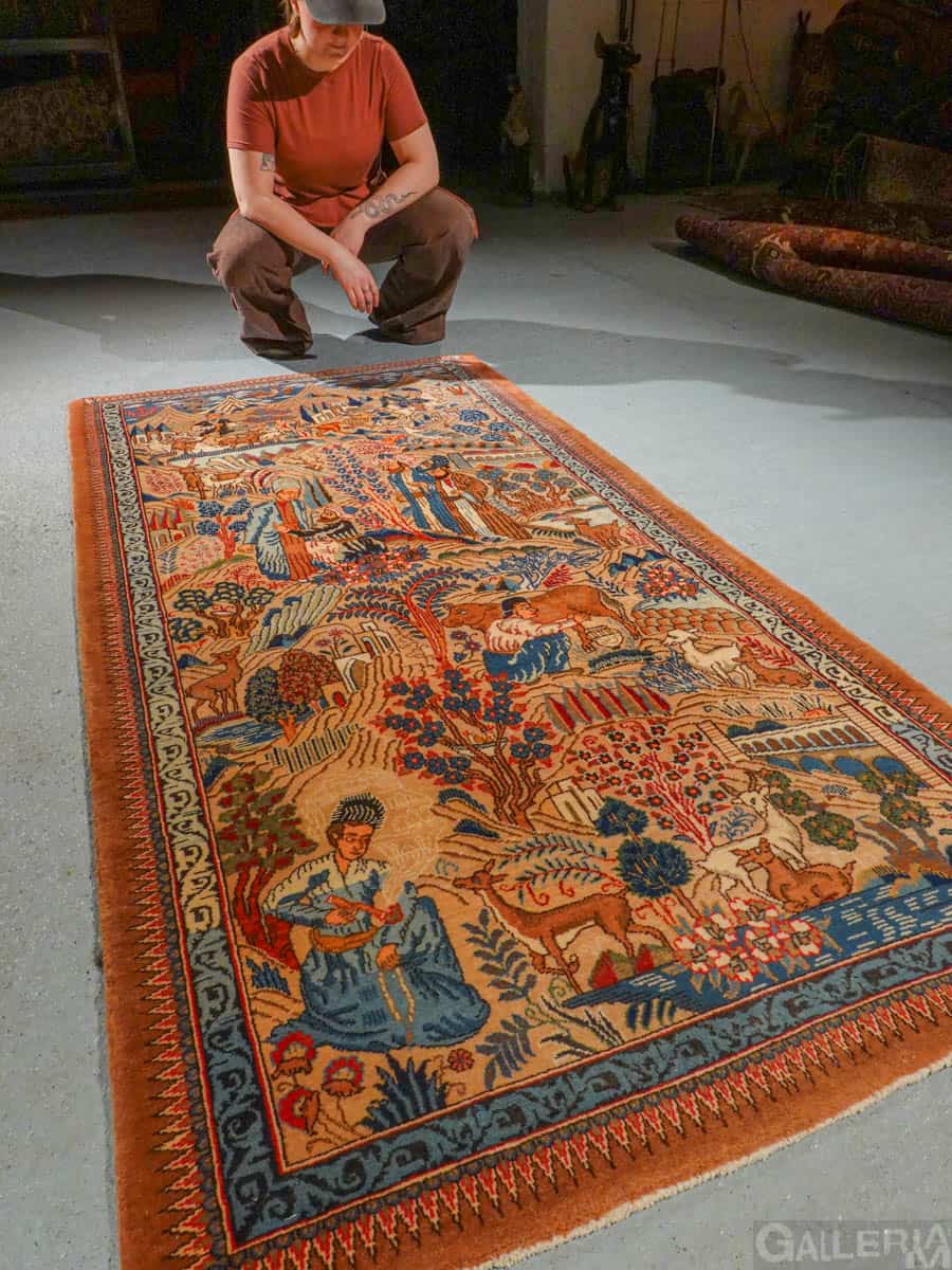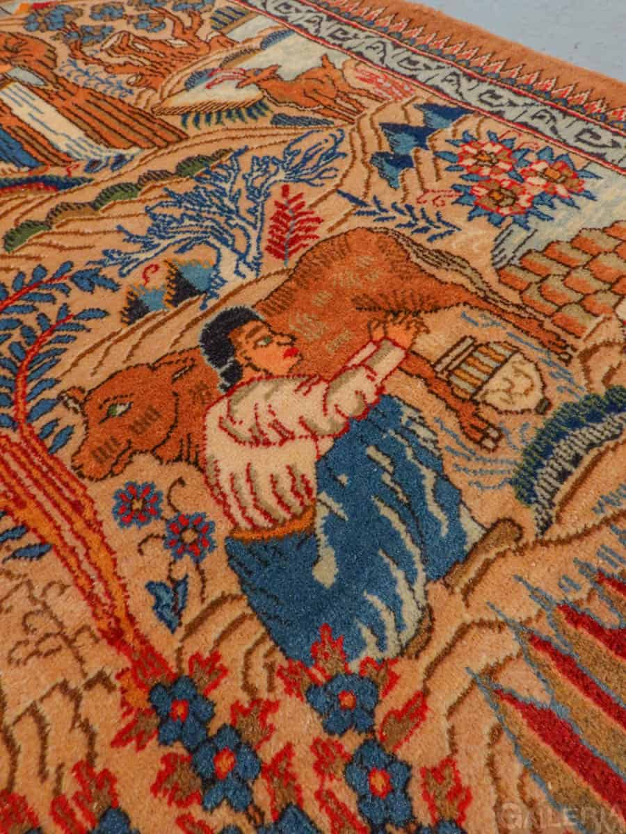 Koristeellinen Kashmar upealla tarinallisella kuvioinnilla jossa esiintyy sekä ihmisiä, eläimiä että kasvillisuutta näyttävänä kokonaisuutena. Uniikki väripaletti.