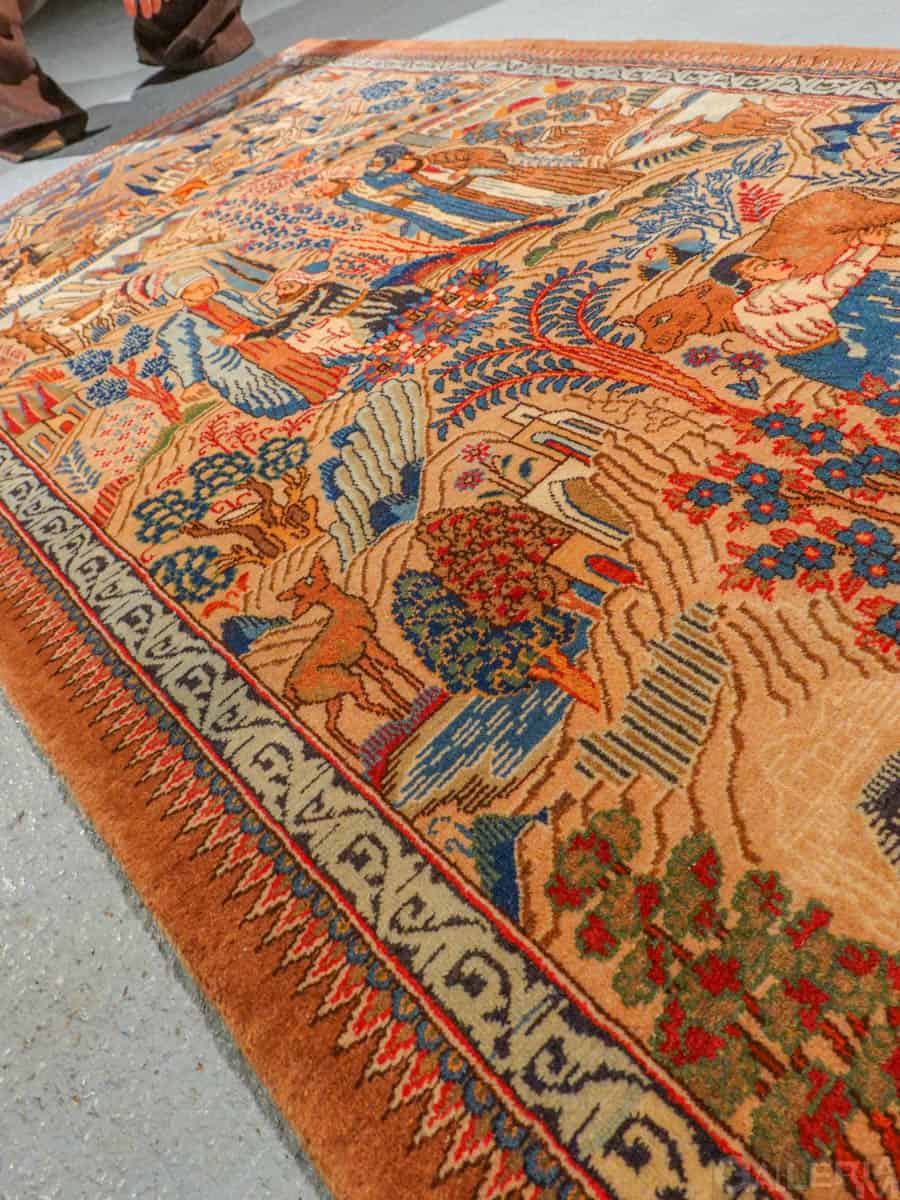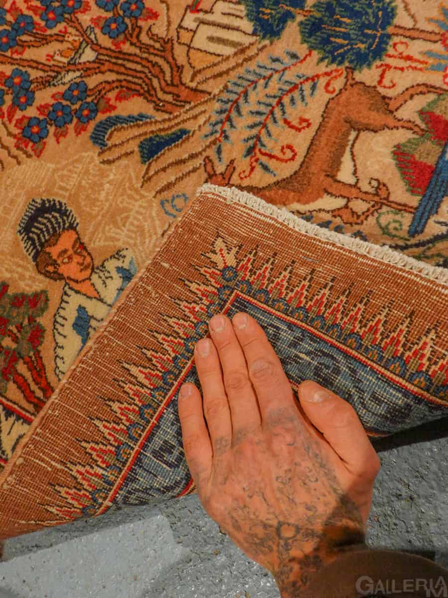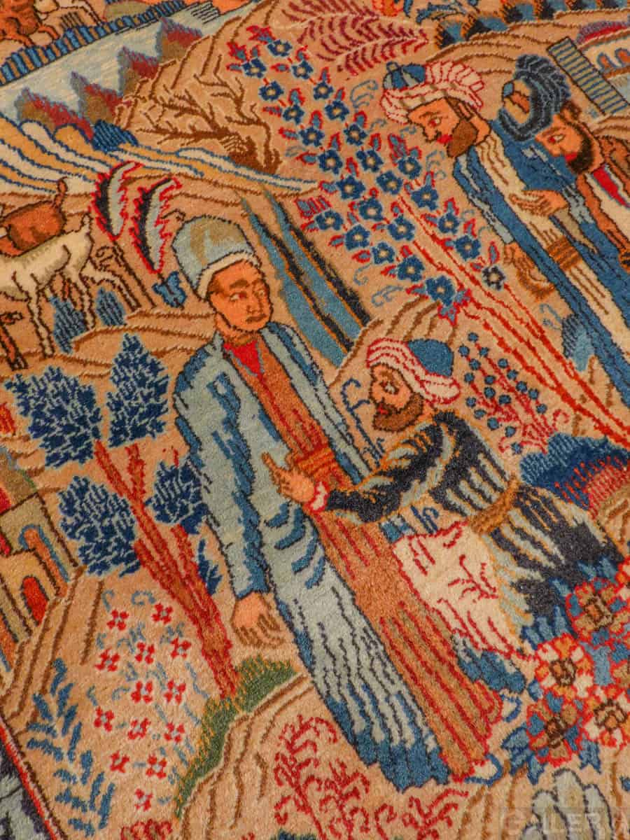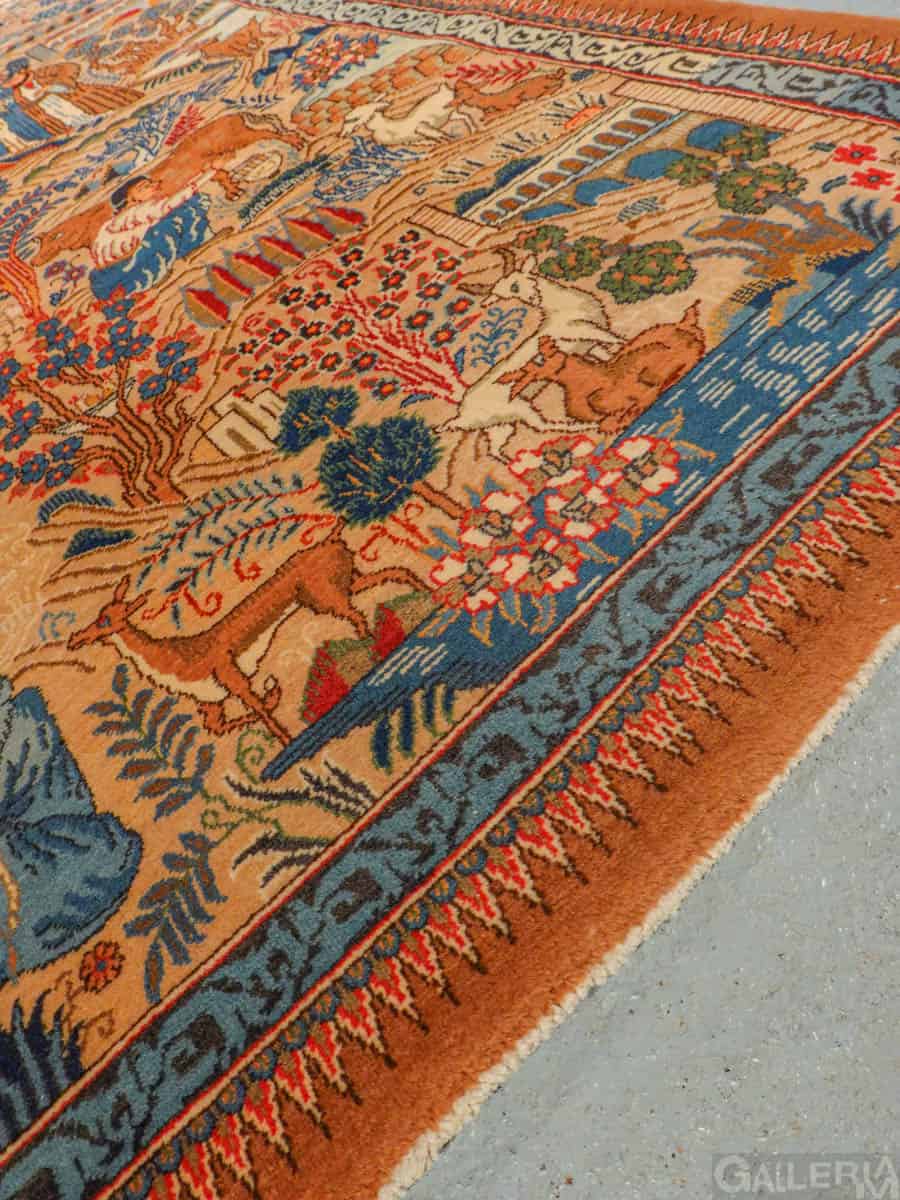 Koristeellinen Kashmar upealla tarinallisella kuvioinnilla jossa esiintyy sekä ihmisiä, eläimiä että kasvillisuutta näyttävänä kokonaisuutena. Uniikki väripaletti.