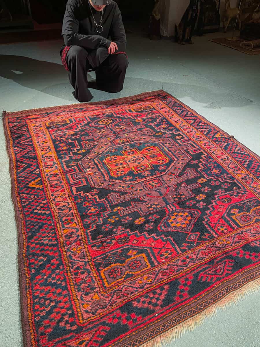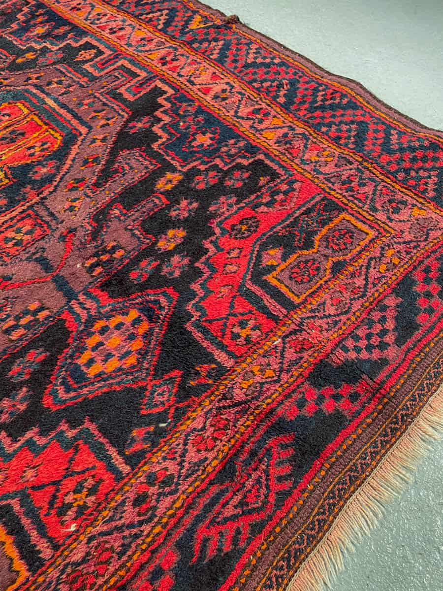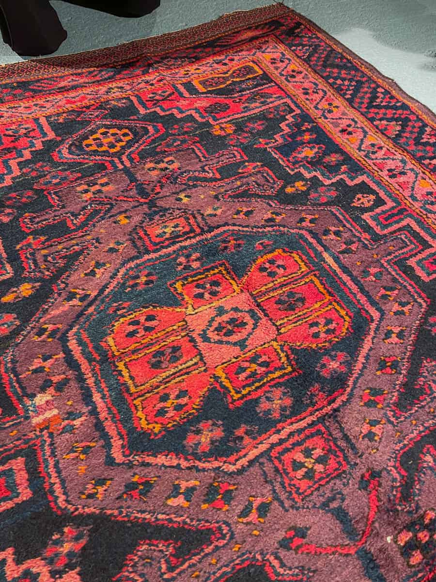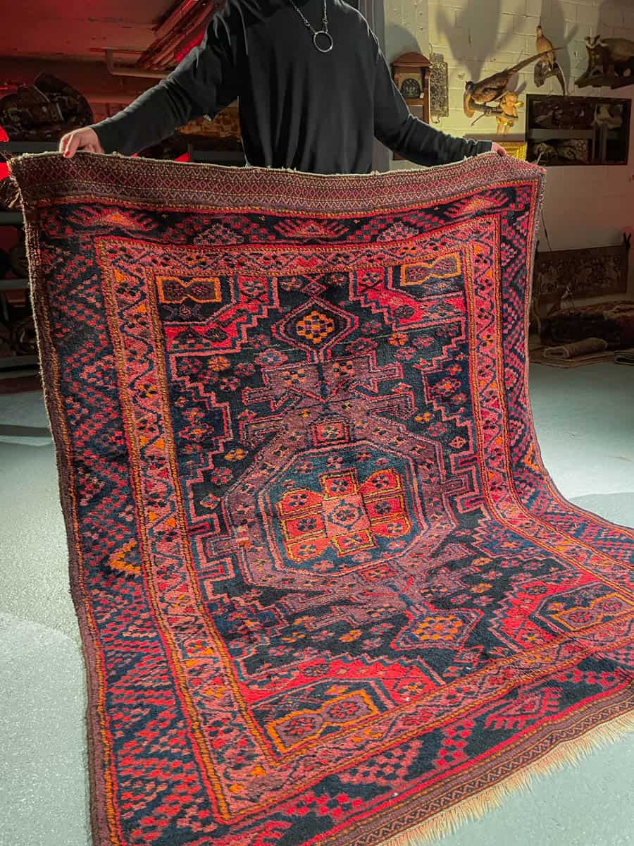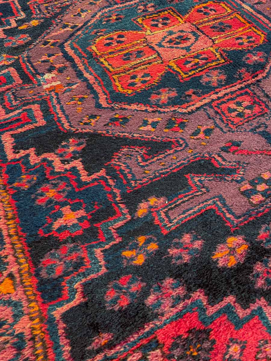 Tyylikäs Malayer geometrisella kuvioinnilla ja kauniin tummalla värimaailmalla. Käsinsolmittu villasta n. 1950-luvulla.