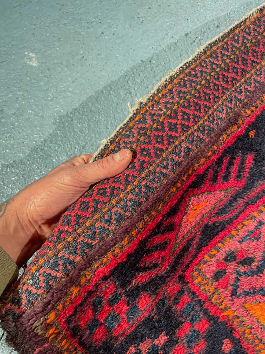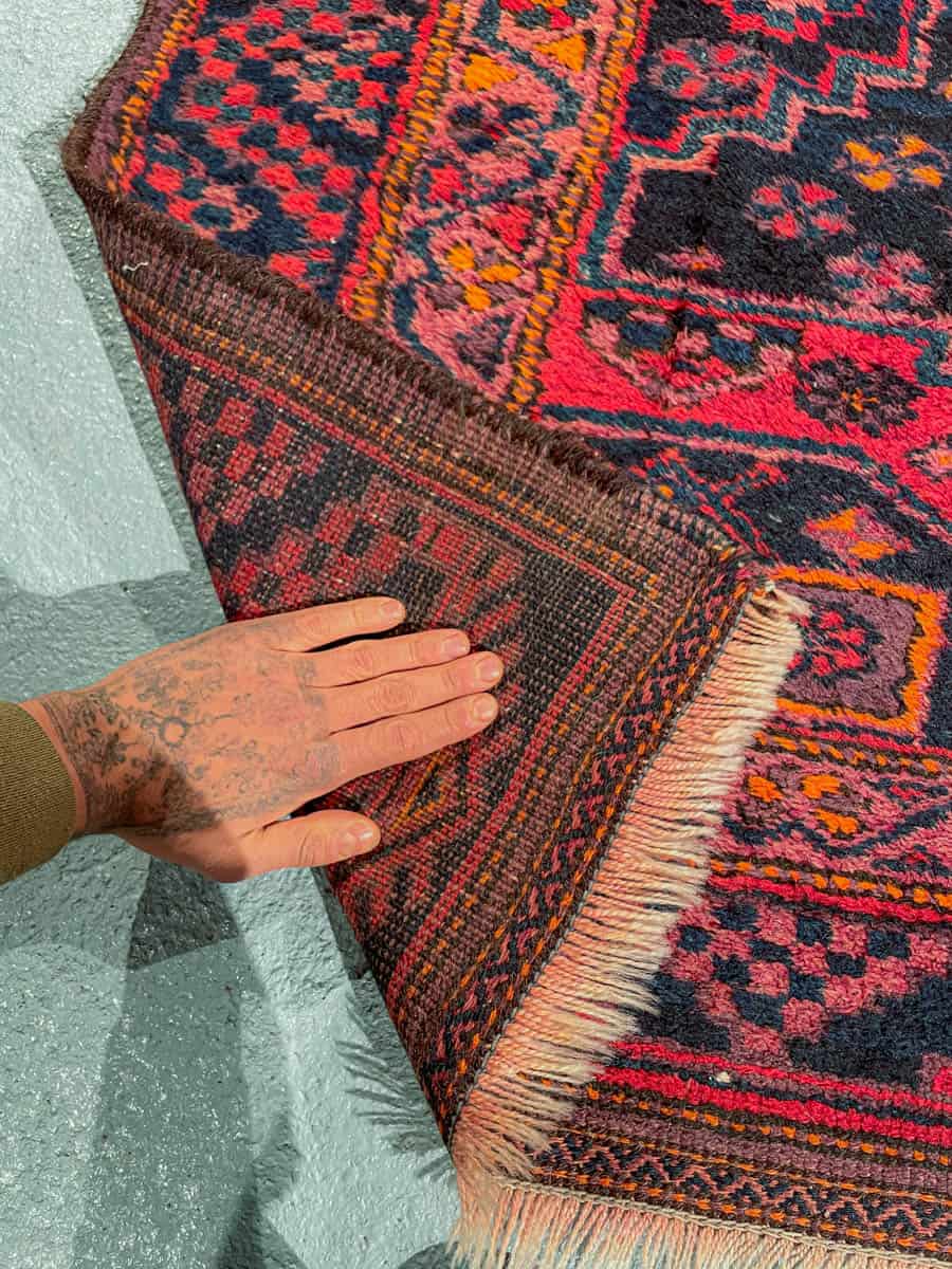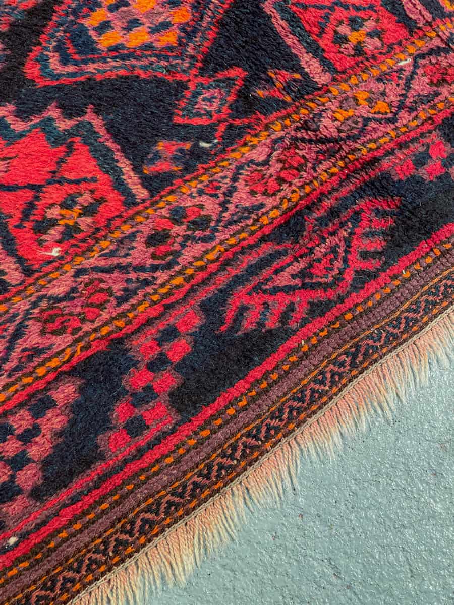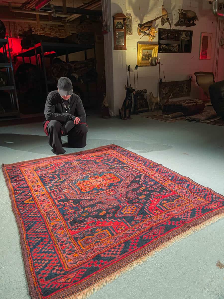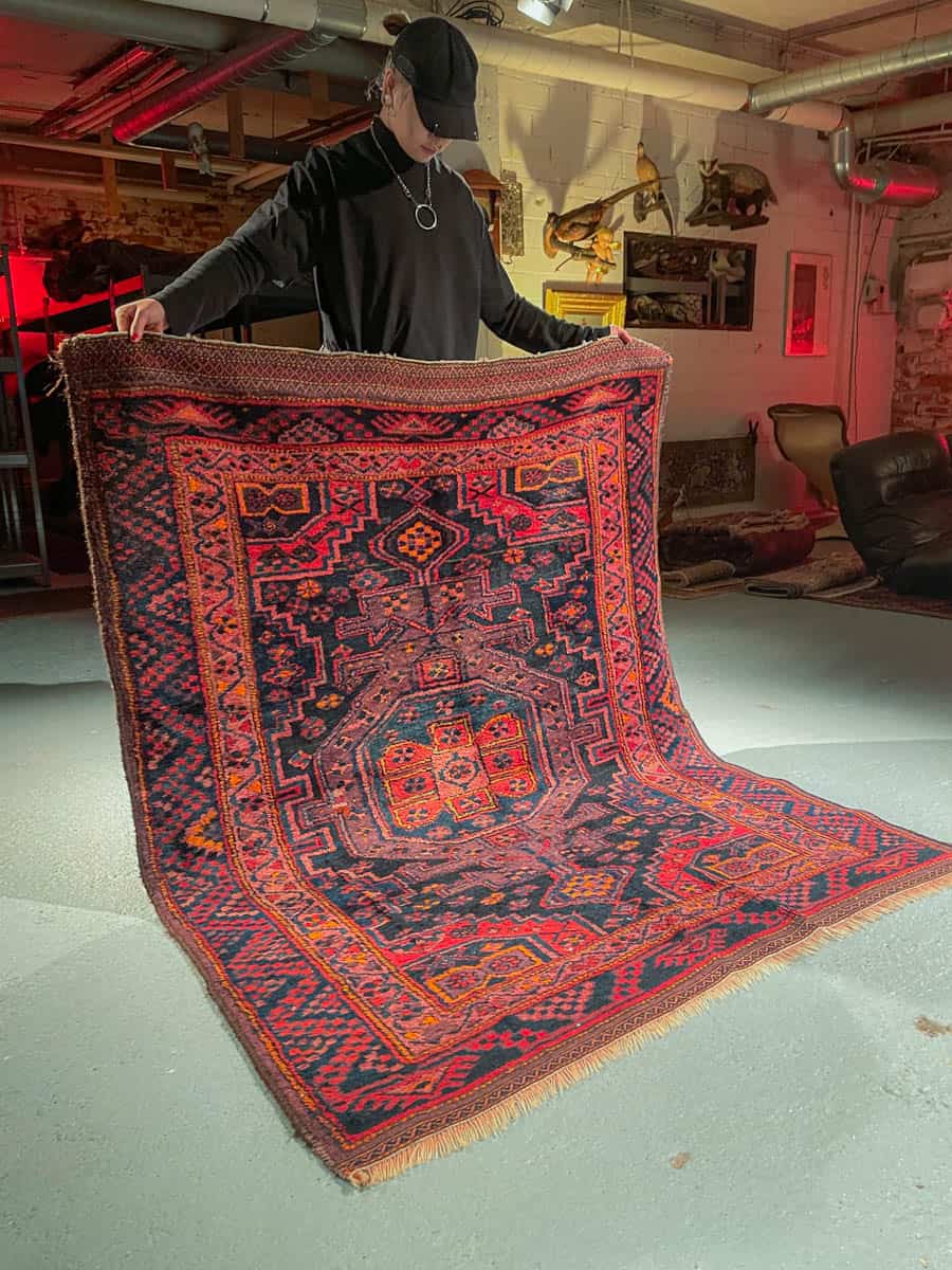 Tyylikäs Malayer geometrisella kuvioinnilla ja kauniin tummalla värimaailmalla. Käsinsolmittu villasta n. 1950-luvulla.