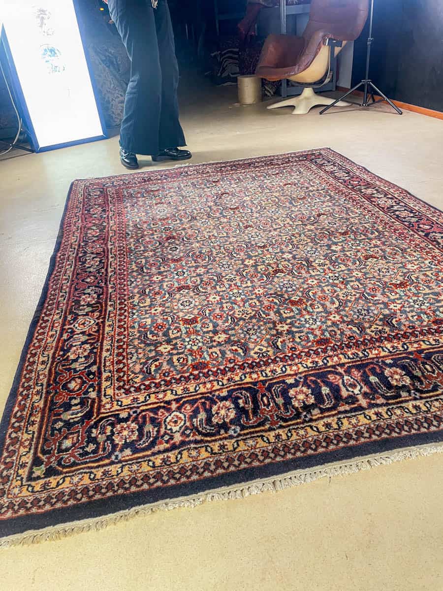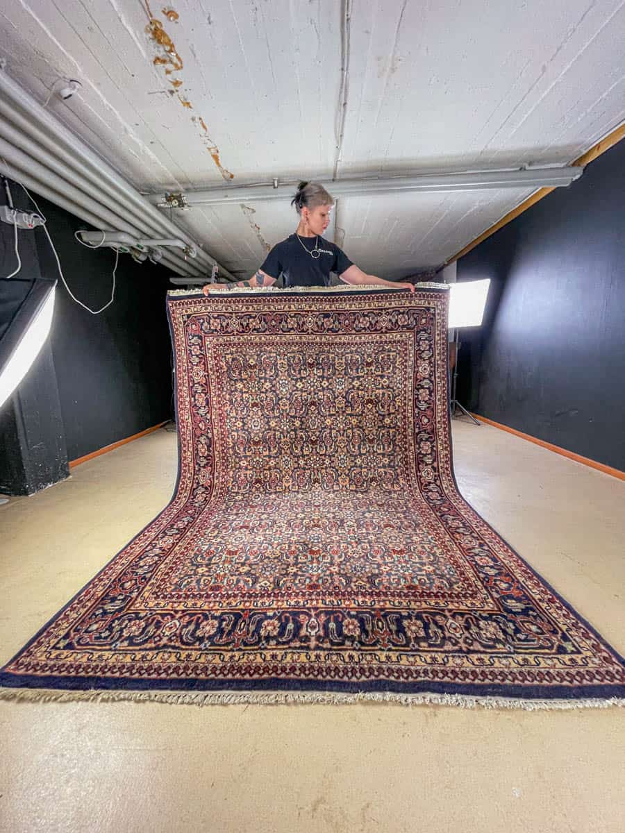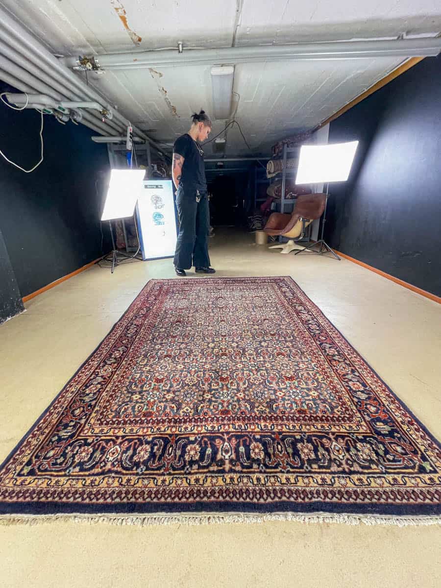 Tämä matto sijaitsee Töölön varastollamme – jos haluat tulla katsomaan sitä paikan päälle, sovithan näytön viestitse tai puhelimitse.