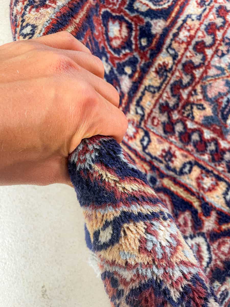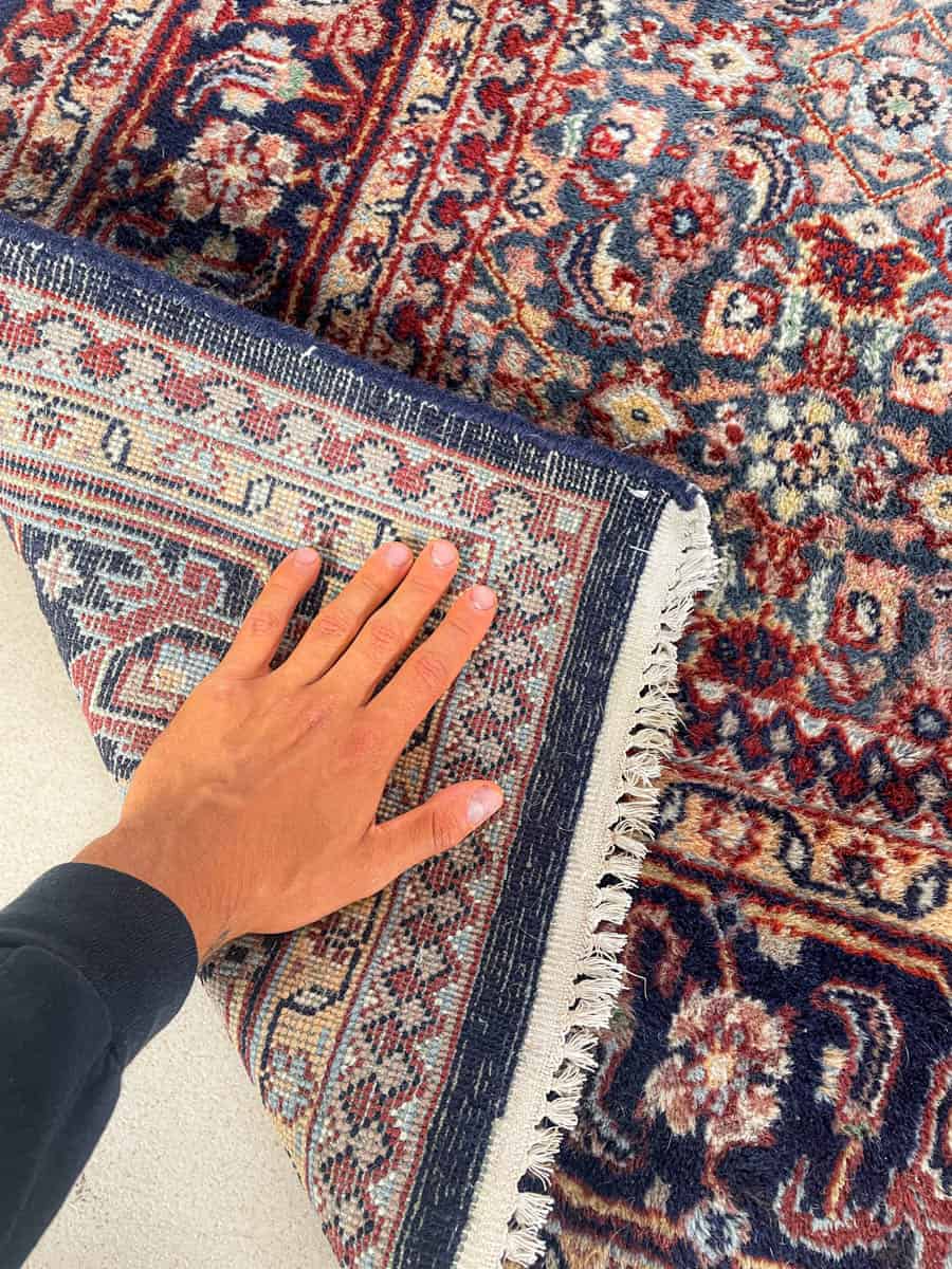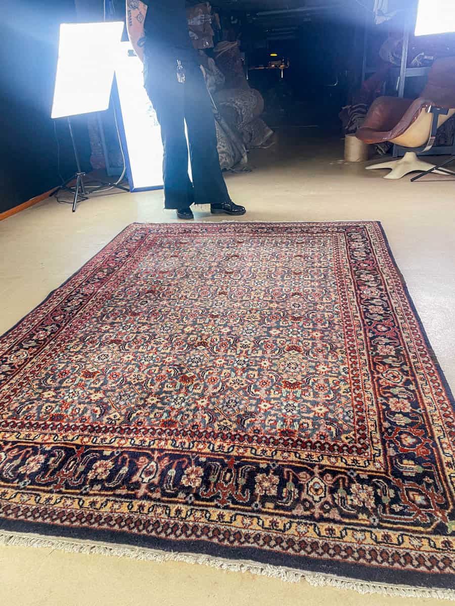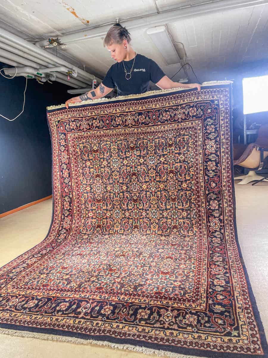 Tämä matto sijaitsee Töölön varastollamme – jos haluat tulla katsomaan sitä paikan päälle, sovithan näytön viestitse tai puhelimitse.