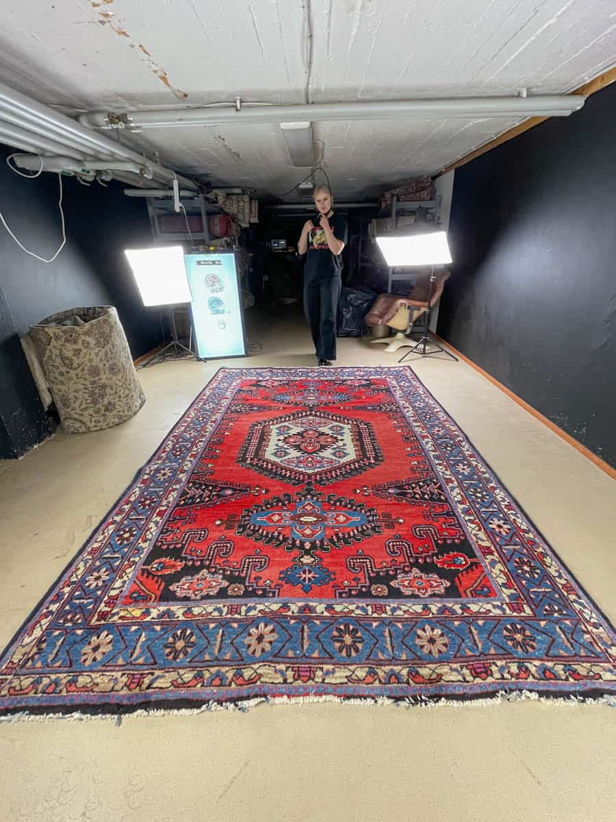 Tämä matto sijaitsee Töölön varastollamme – jos haluat tulla katsomaan sitä paikan päälle, sovithan näytön viestitse tai puhelimitse.