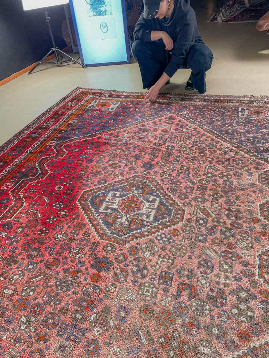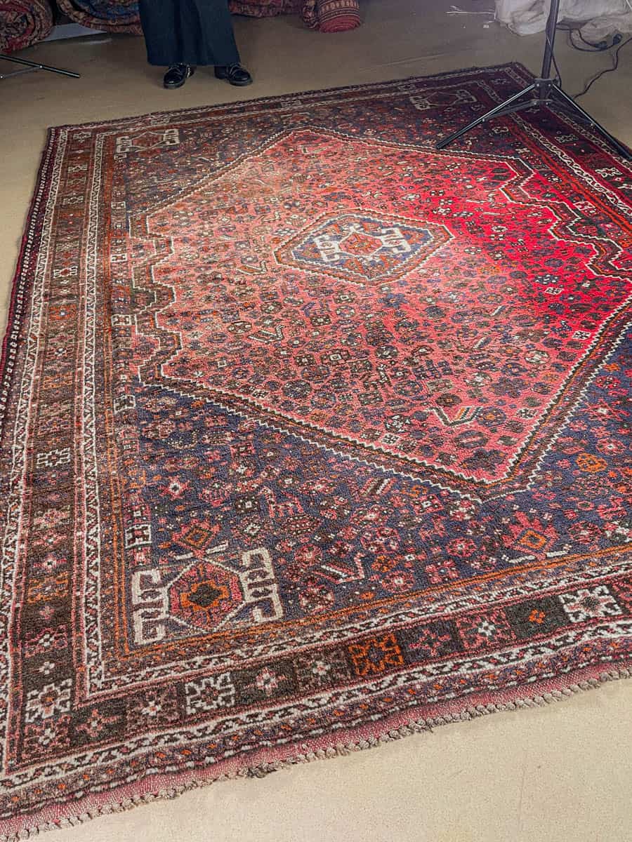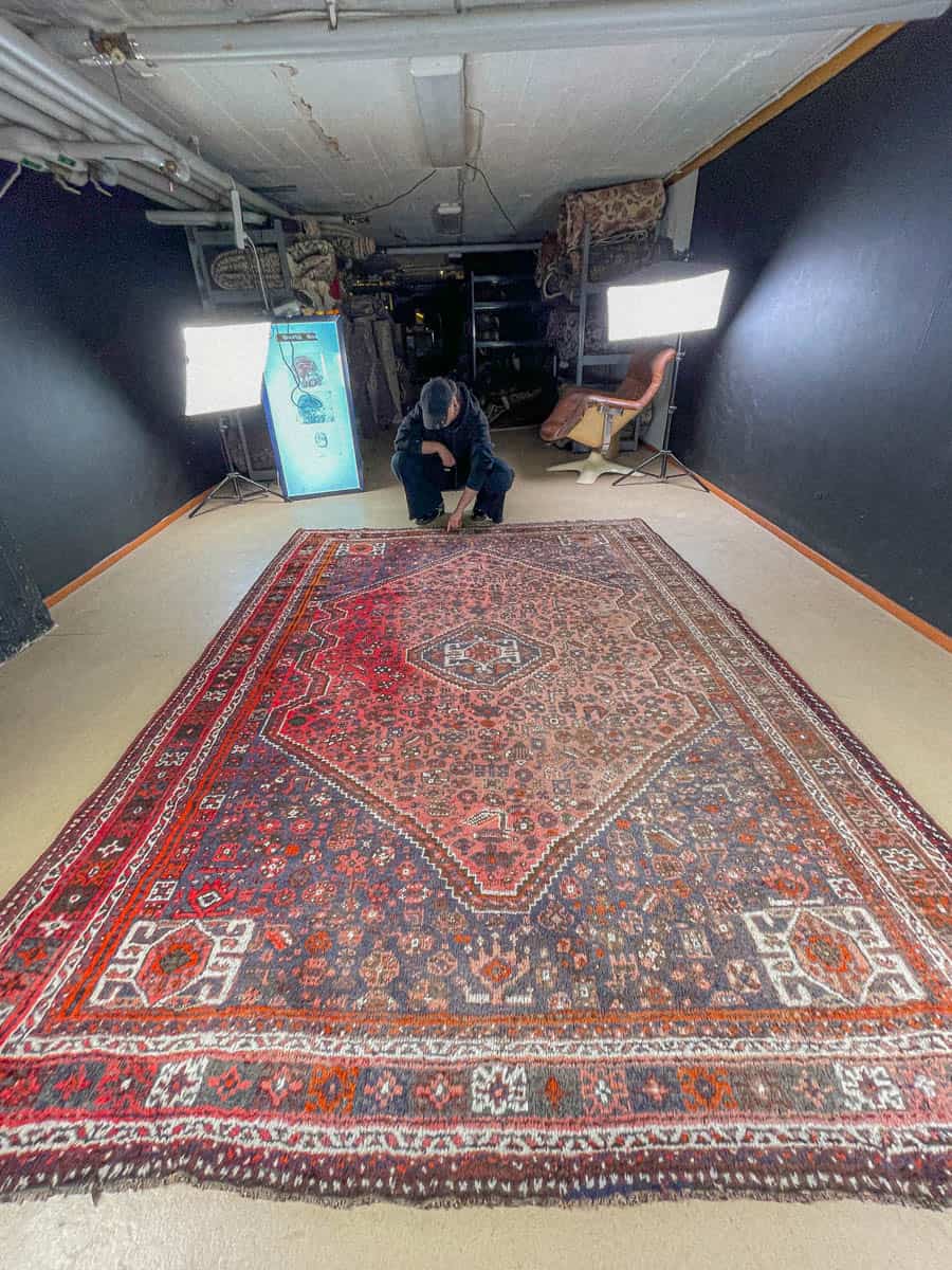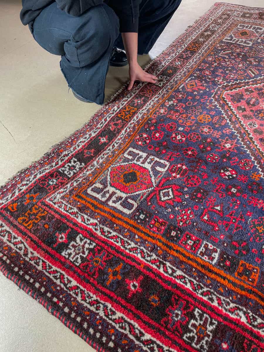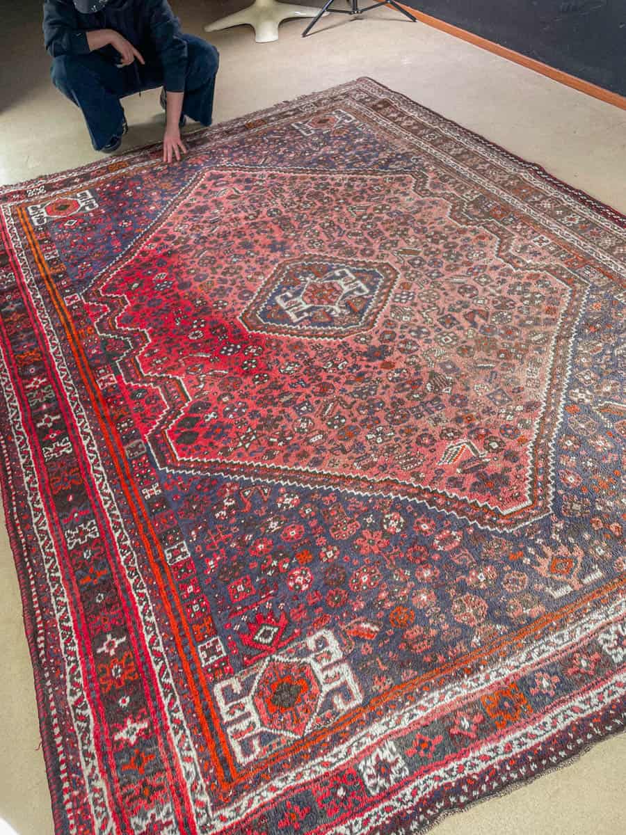 Tämä matto sijaitsee Töölön varastollamme – jos haluat tulla katsomaan sitä paikan päälle, sovithan näytön viestitse tai puhelimitse.