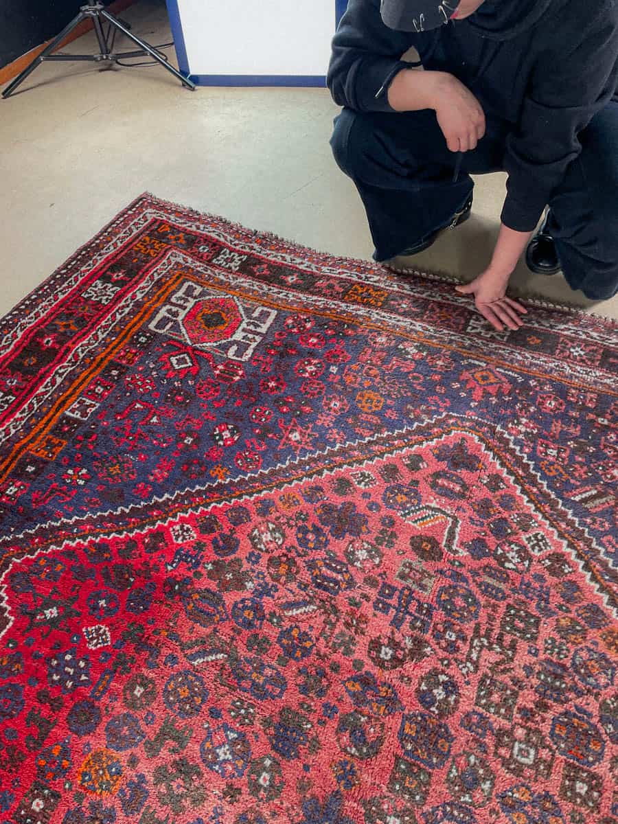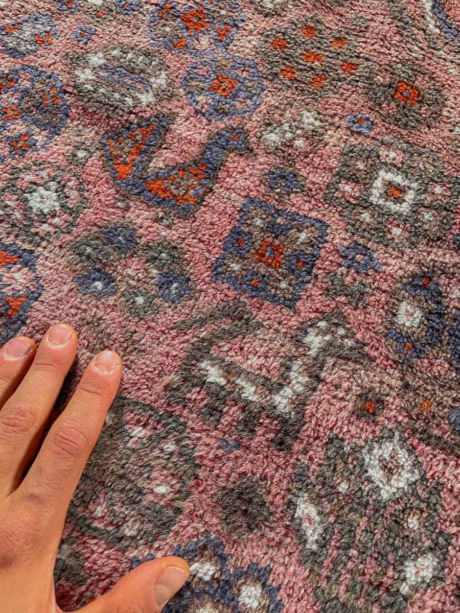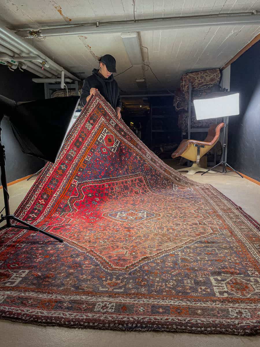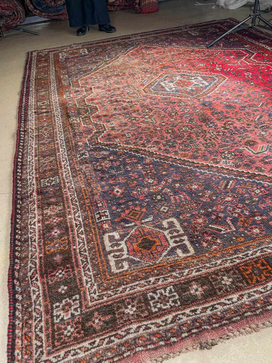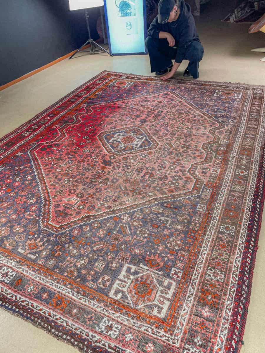 Tämä matto sijaitsee Töölön varastollamme – jos haluat tulla katsomaan sitä paikan päälle, sovithan näytön viestitse tai puhelimitse.