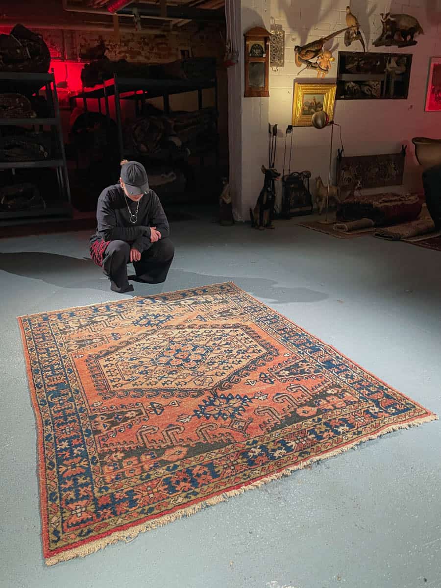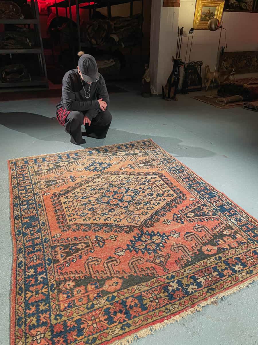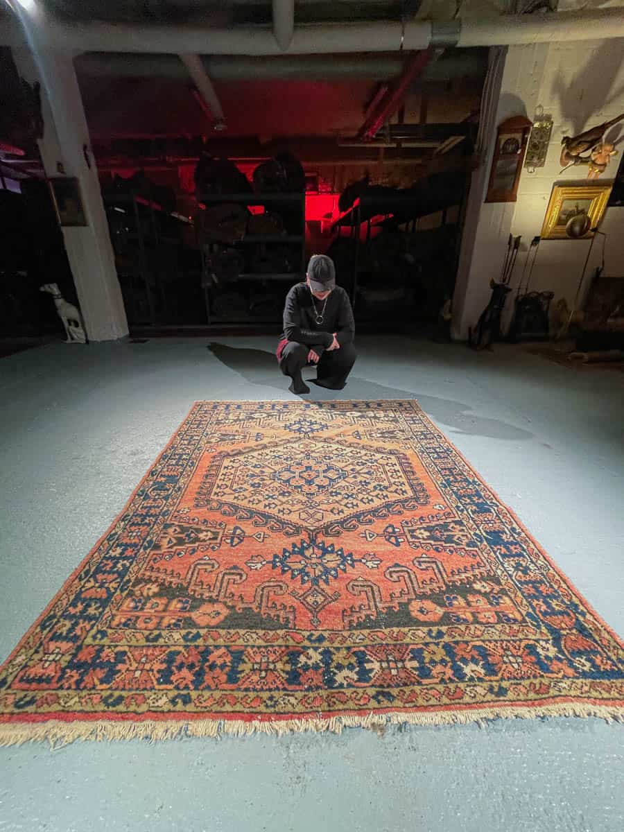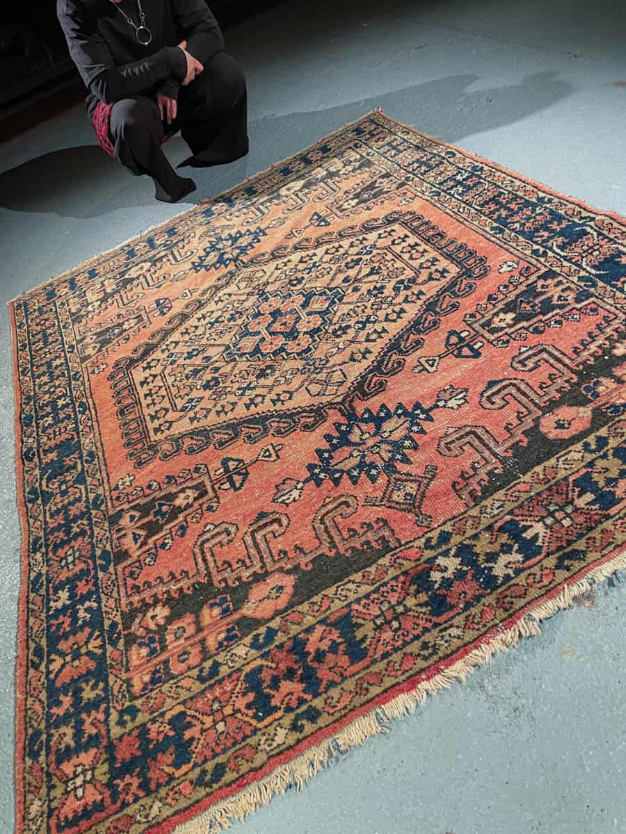 Tämä matto sijaitsee Töölön varastollamme – jos haluat tulla katsomaan sitä paikan päälle, sovithan näytön viestitse tai puhelimitse.