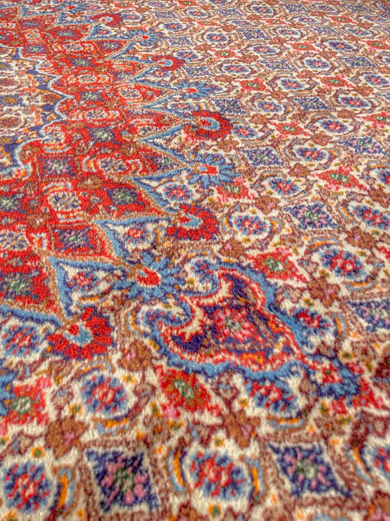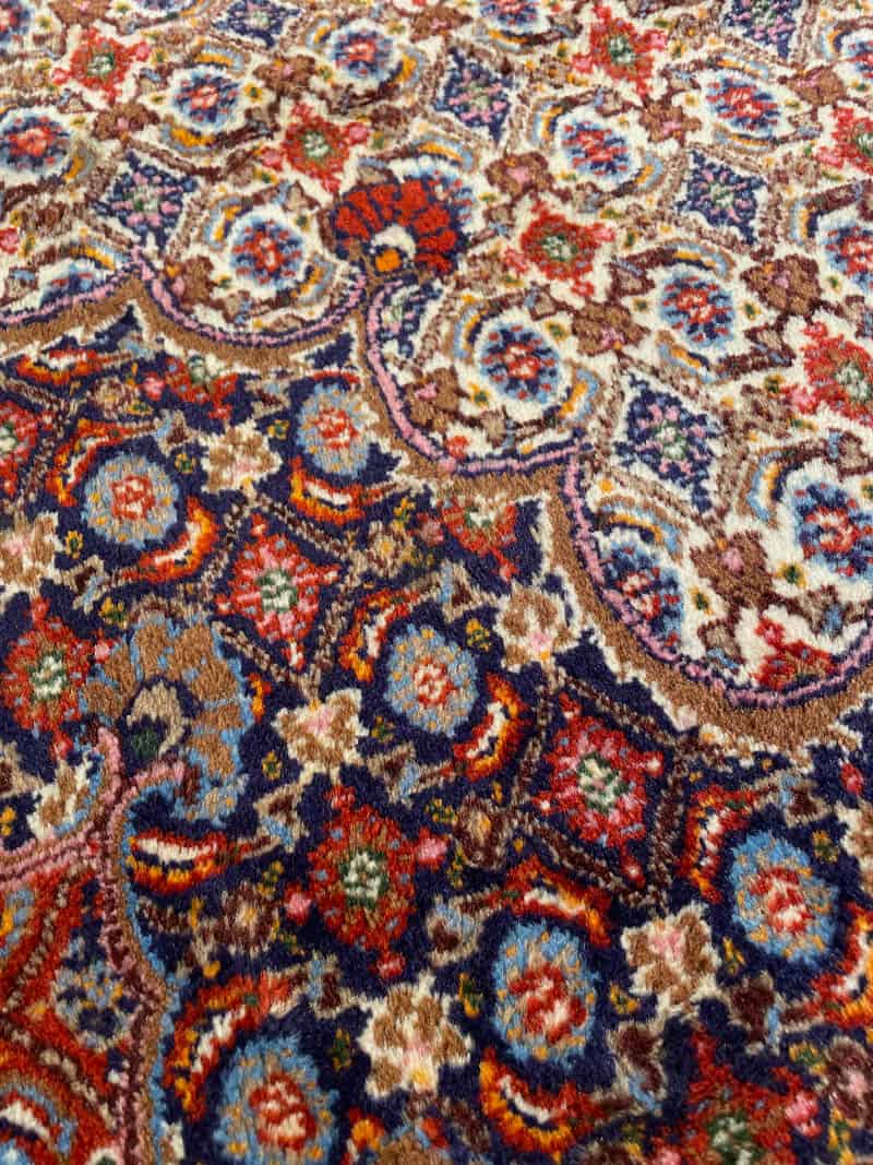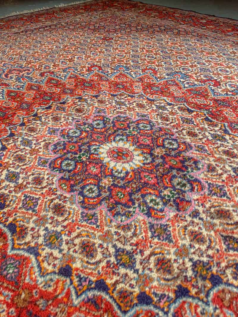 Upean yksityiskohtainen Moud perinteisissä vaaleissa sävyissä ja häikäisevällä Auringonkehä-keskimedaljongilla. Käsinsolmittu villasta. Upeasti säilyneet pigmentit ja hapsut.