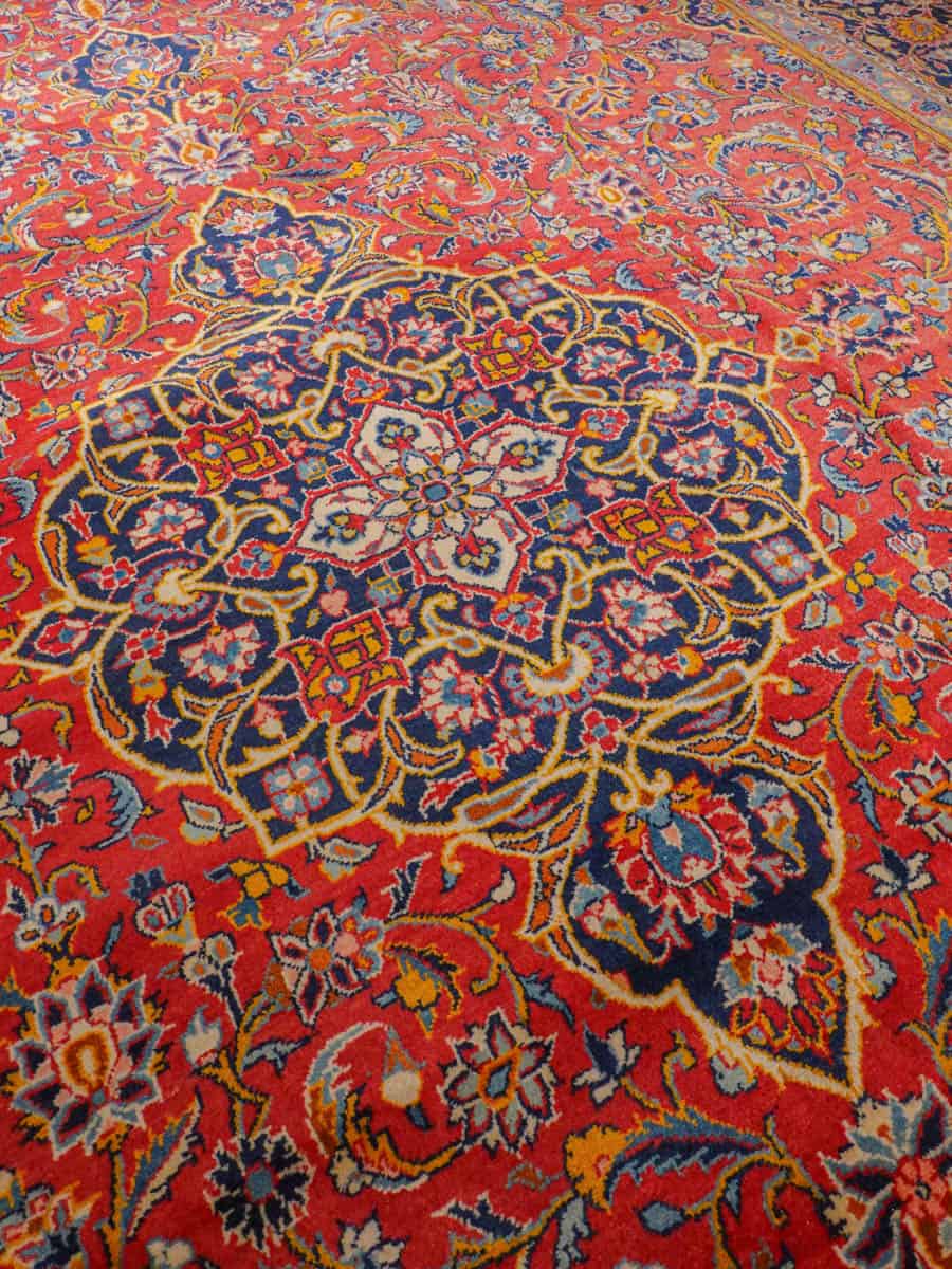 Käsinsolmittu perinteiseen persialaiseen Keshan-tyyliin. Kaunis ja perinteinen kuviointi keskimedaljongilla. Upeana säilynyt väritys.