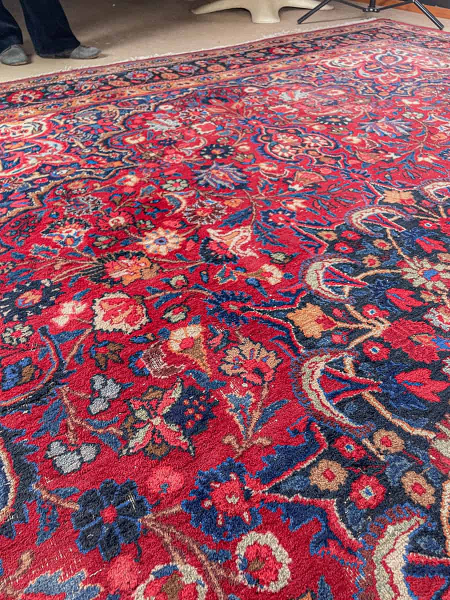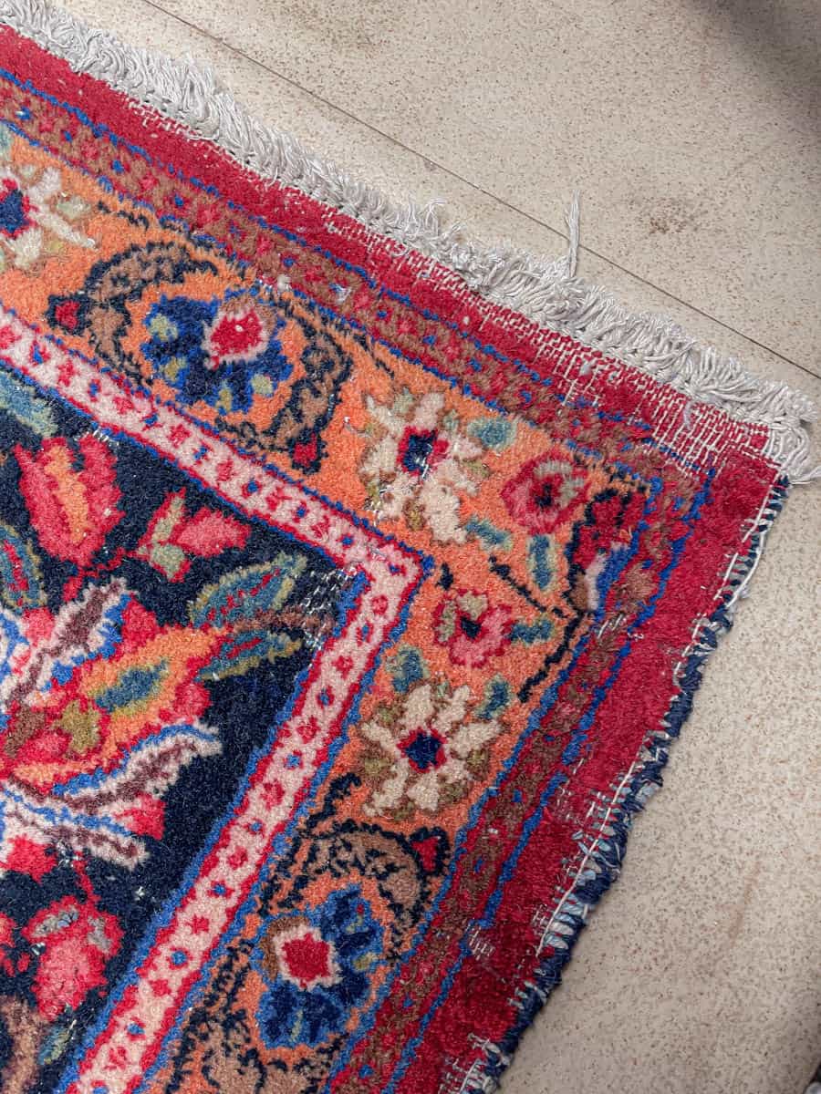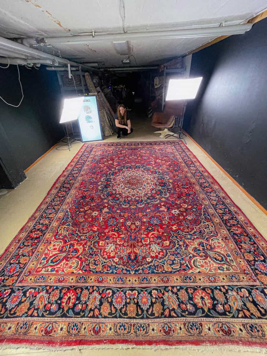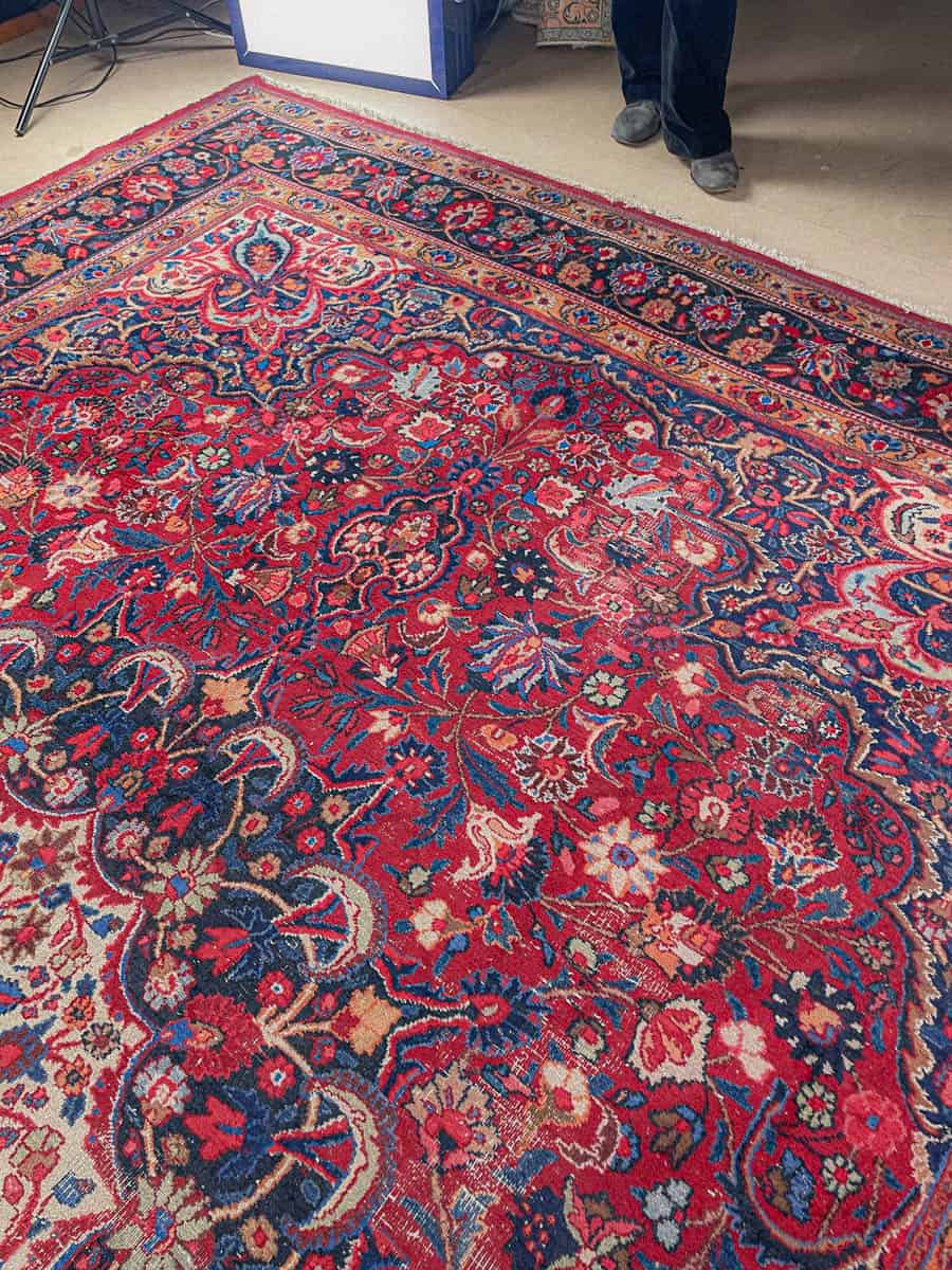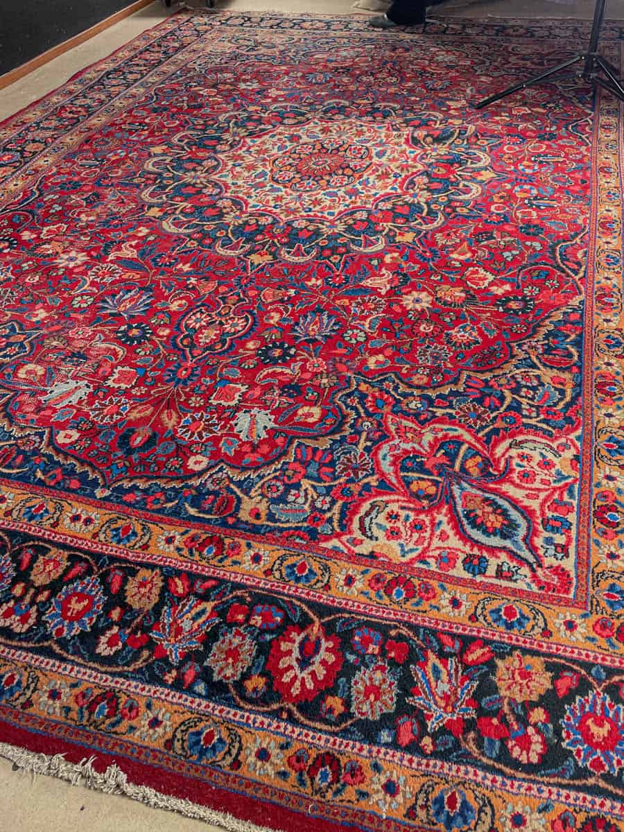 Tämä matto sijaitsee Töölön varastollamme – jos haluat tulla katsomaan sitä paikan päälle, sovithan näytön viestitse tai puhelimitse.