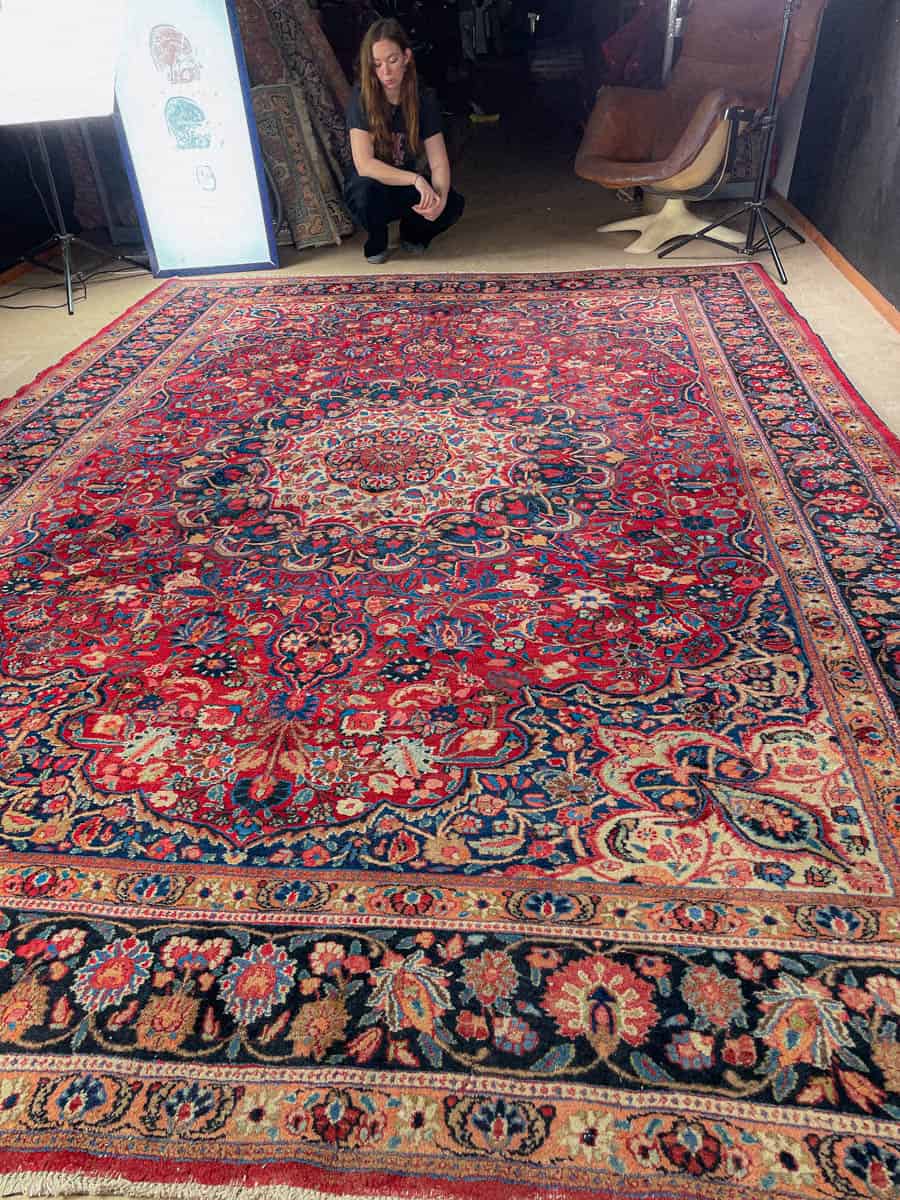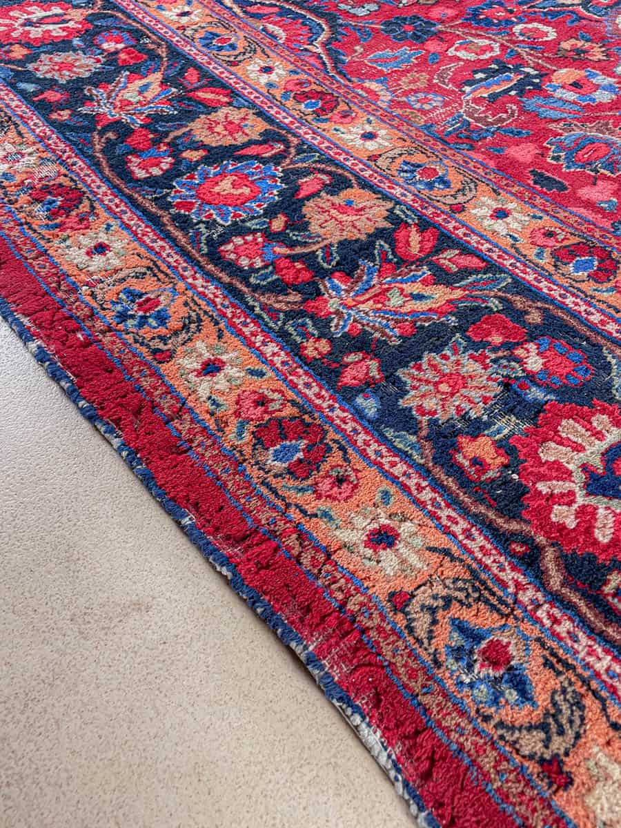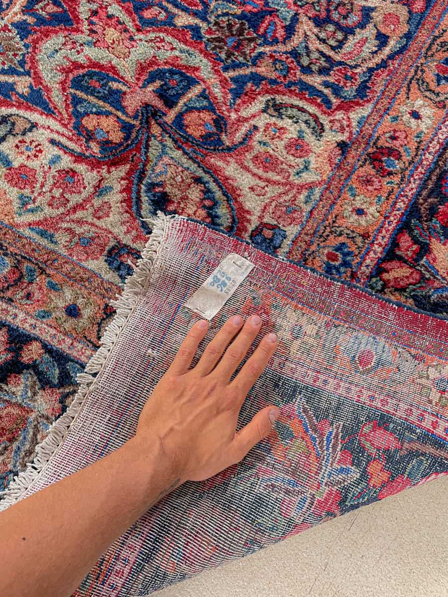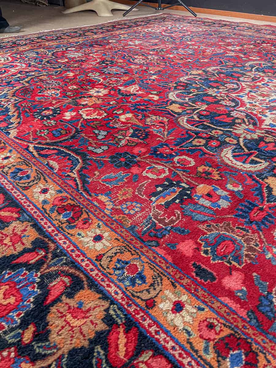 Tämä matto sijaitsee Töölön varastollamme – jos haluat tulla katsomaan sitä paikan päälle, sovithan näytön viestitse tai puhelimitse.