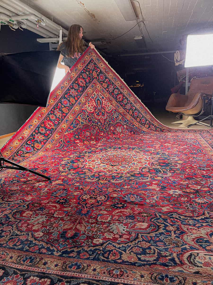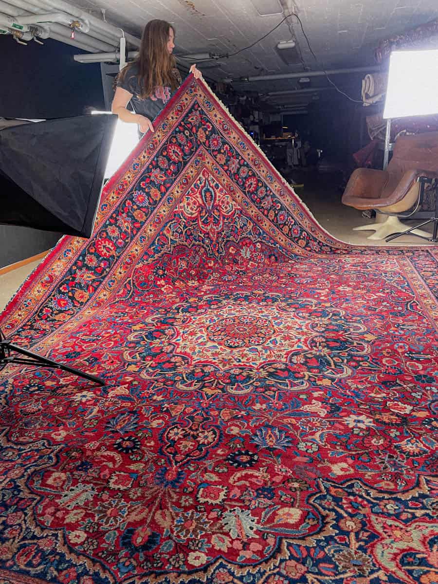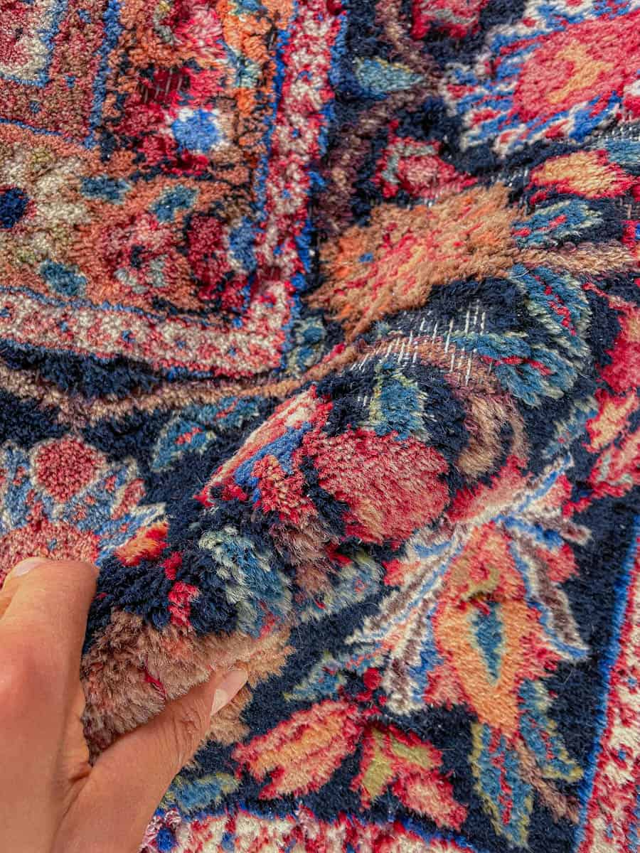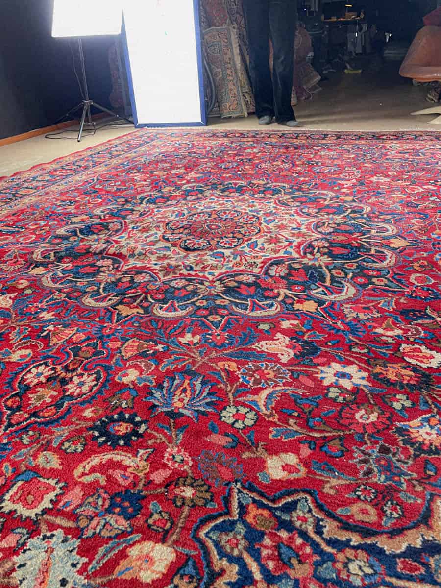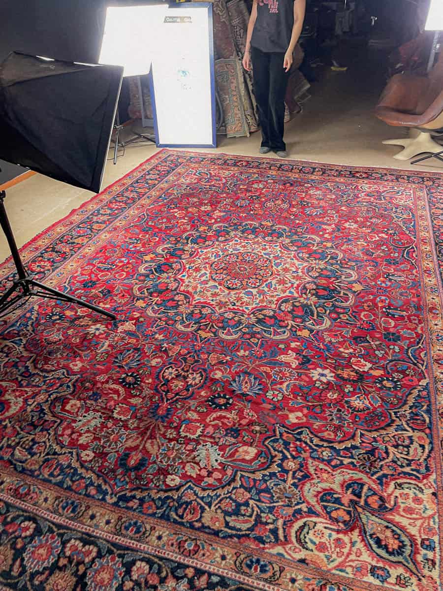 Tämä matto sijaitsee Töölön varastollamme – jos haluat tulla katsomaan sitä paikan päälle, sovithan näytön viestitse tai puhelimitse.