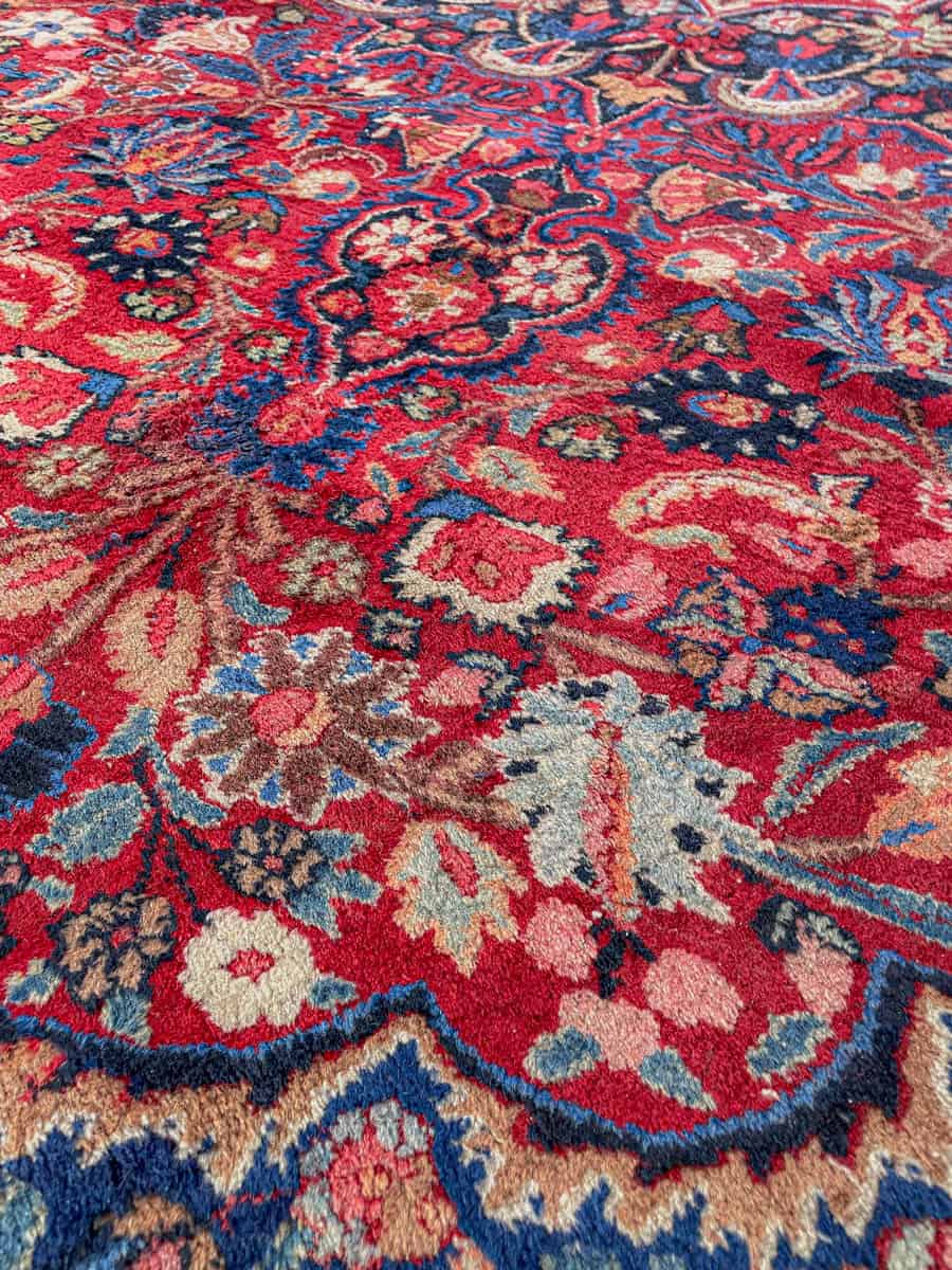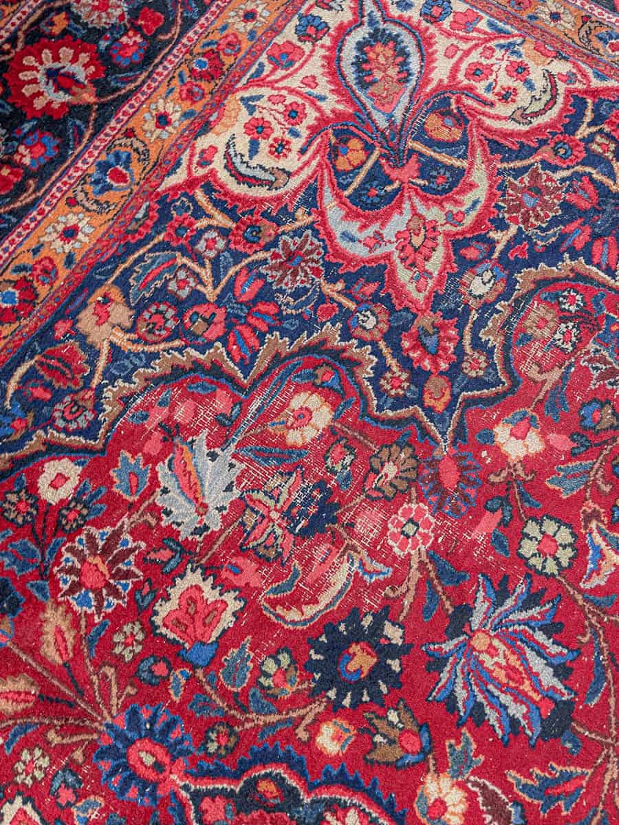 Tyrmäävän upea n. 1960-luvulla villasta käsinsolmittu Meshed, jonka väreissä kilpailevat keskenään lukemattomat sävyt. Hämmästyttävän yksityiskohtaiset ja uniikit, poikkeuksellisen yksityiskohtaiset, kuvioinnit.