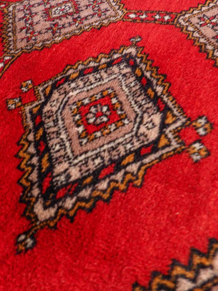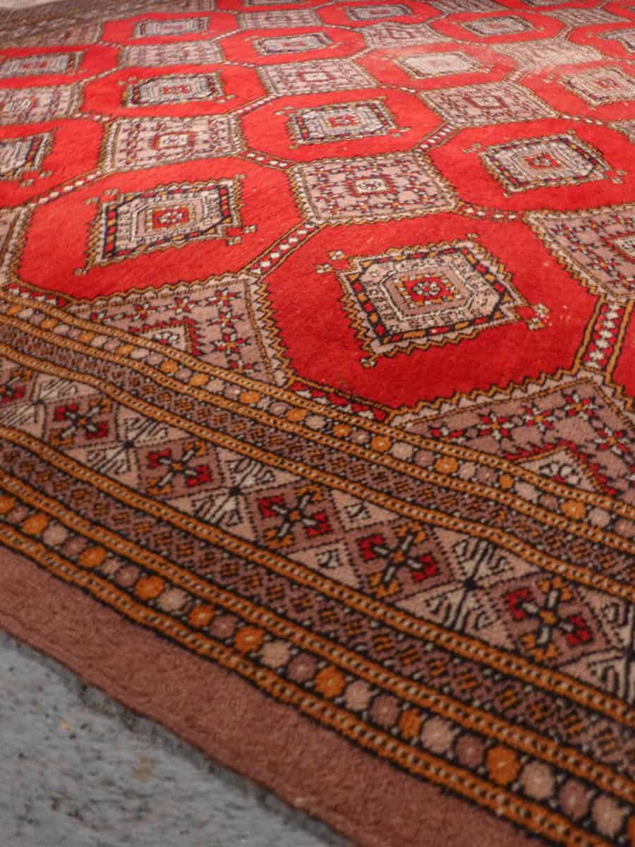 Tyylikkäästi patinoitunut perinteinen Buhara-villamatto kauniilla oranssiin taittavalla värillä ja lempeän ruskeilla kuvioinneilla.