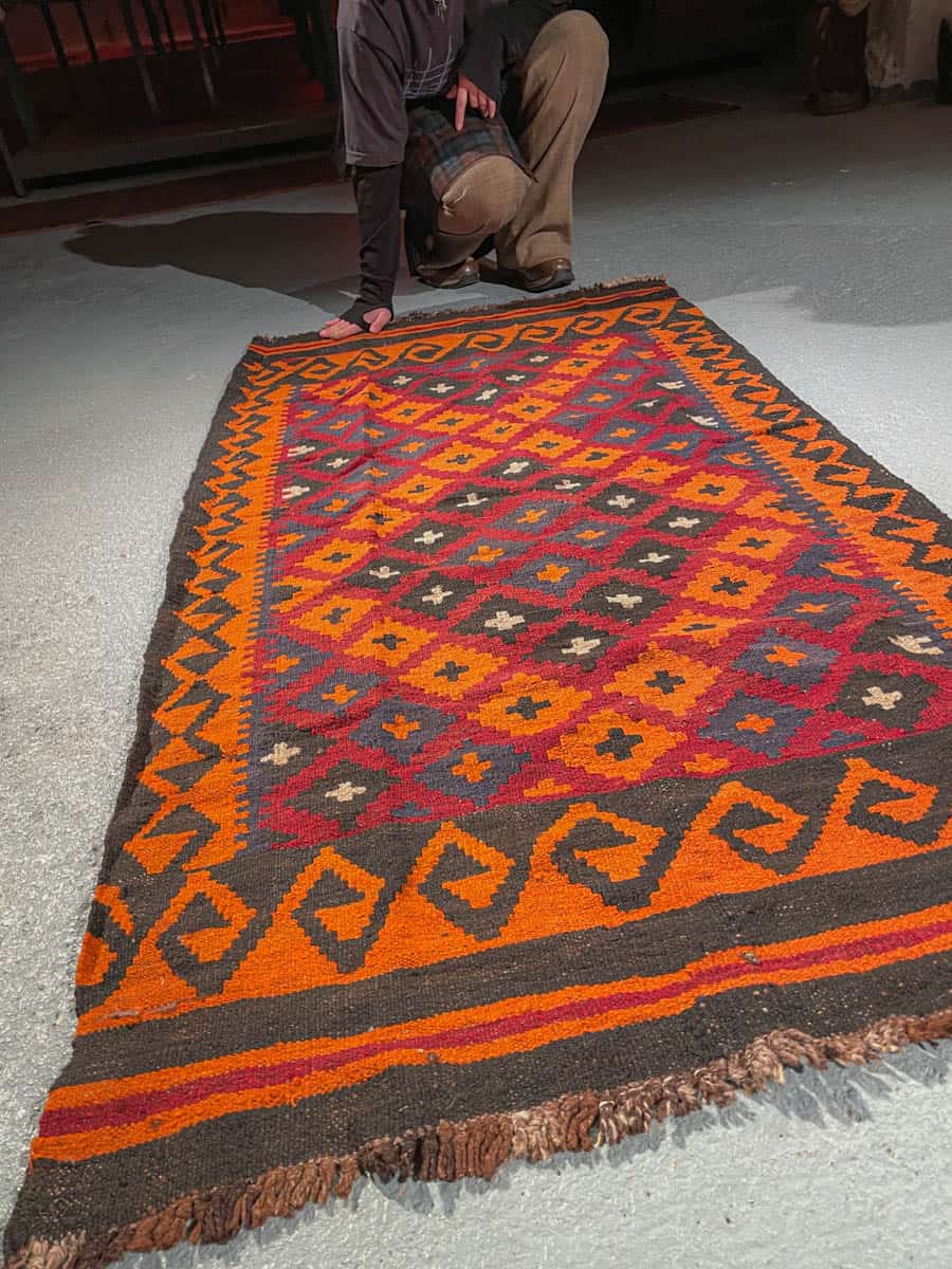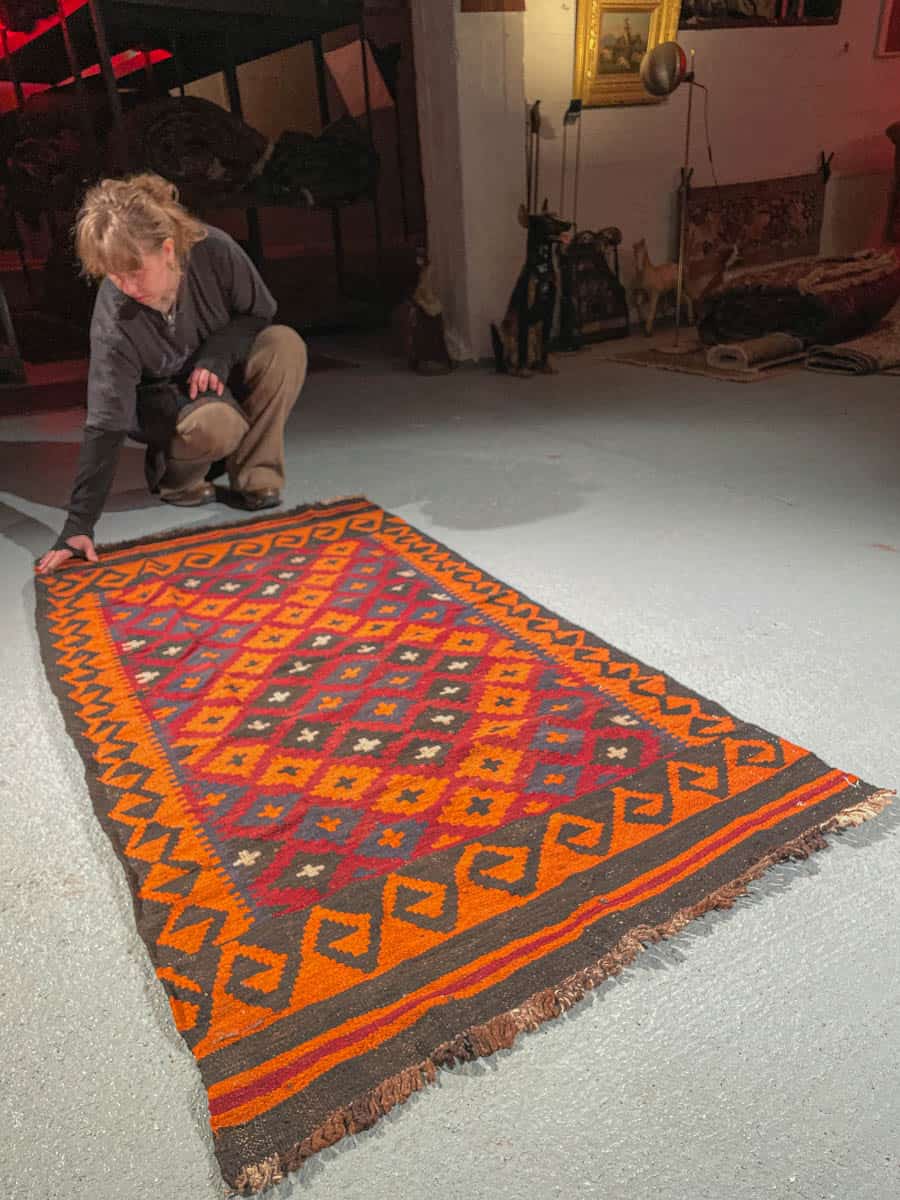 Tyylikäs Kelim lämpimillä väreillä ja klassisella kuvioinnilla.