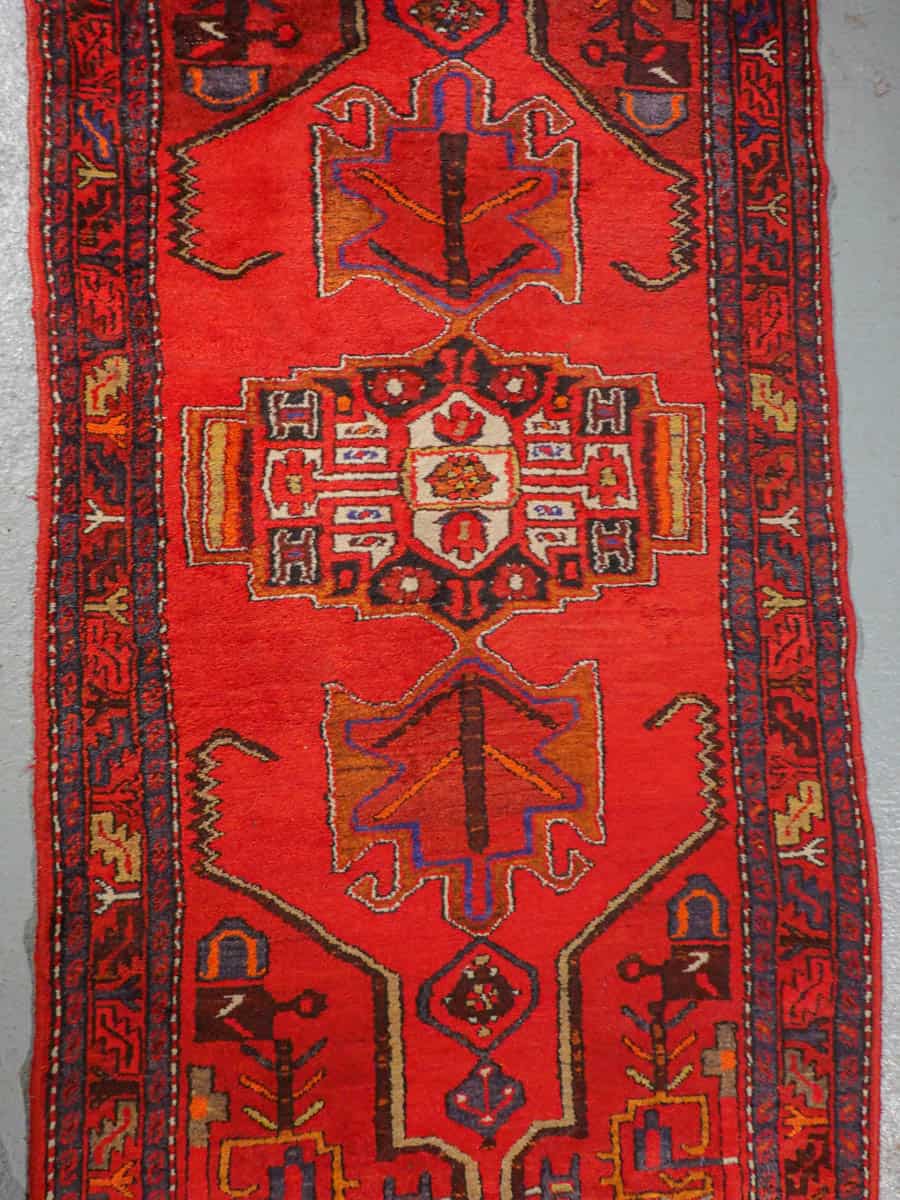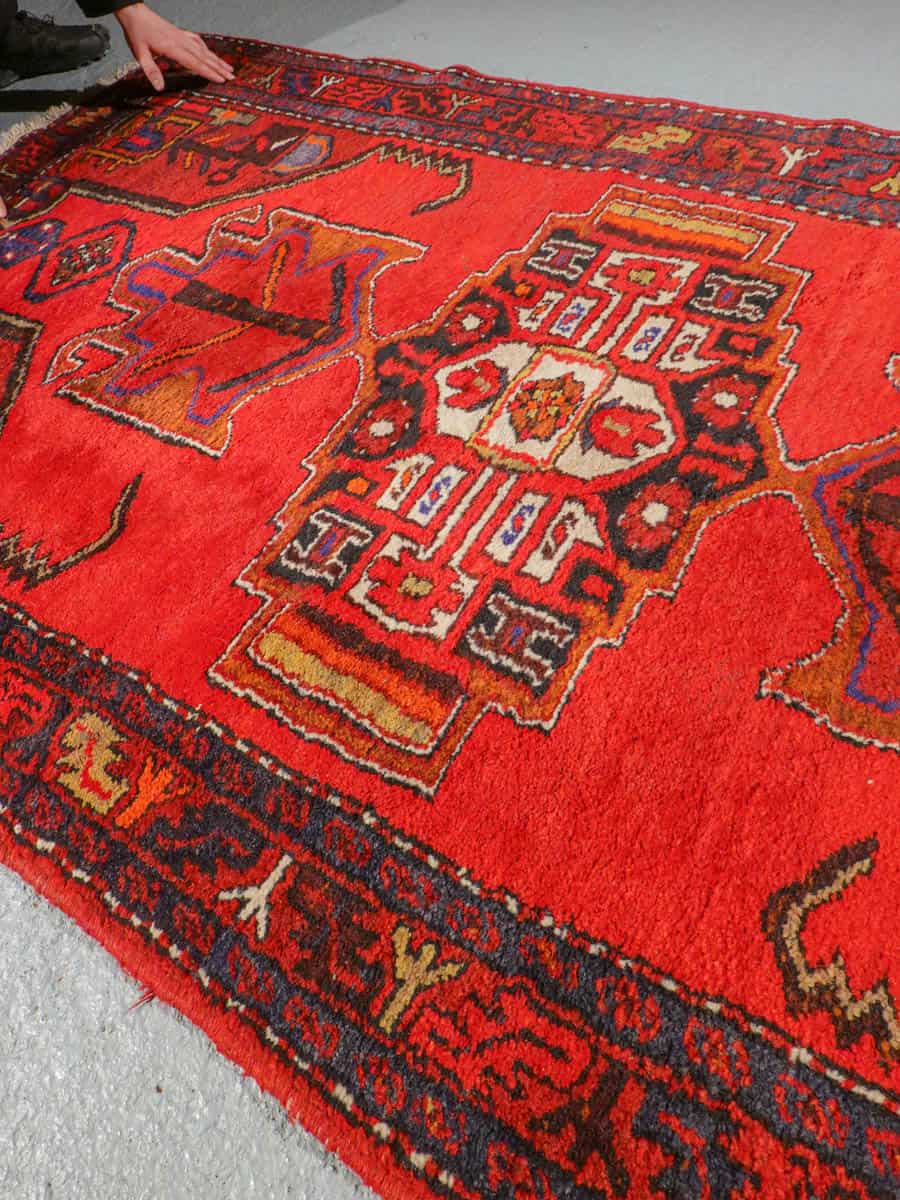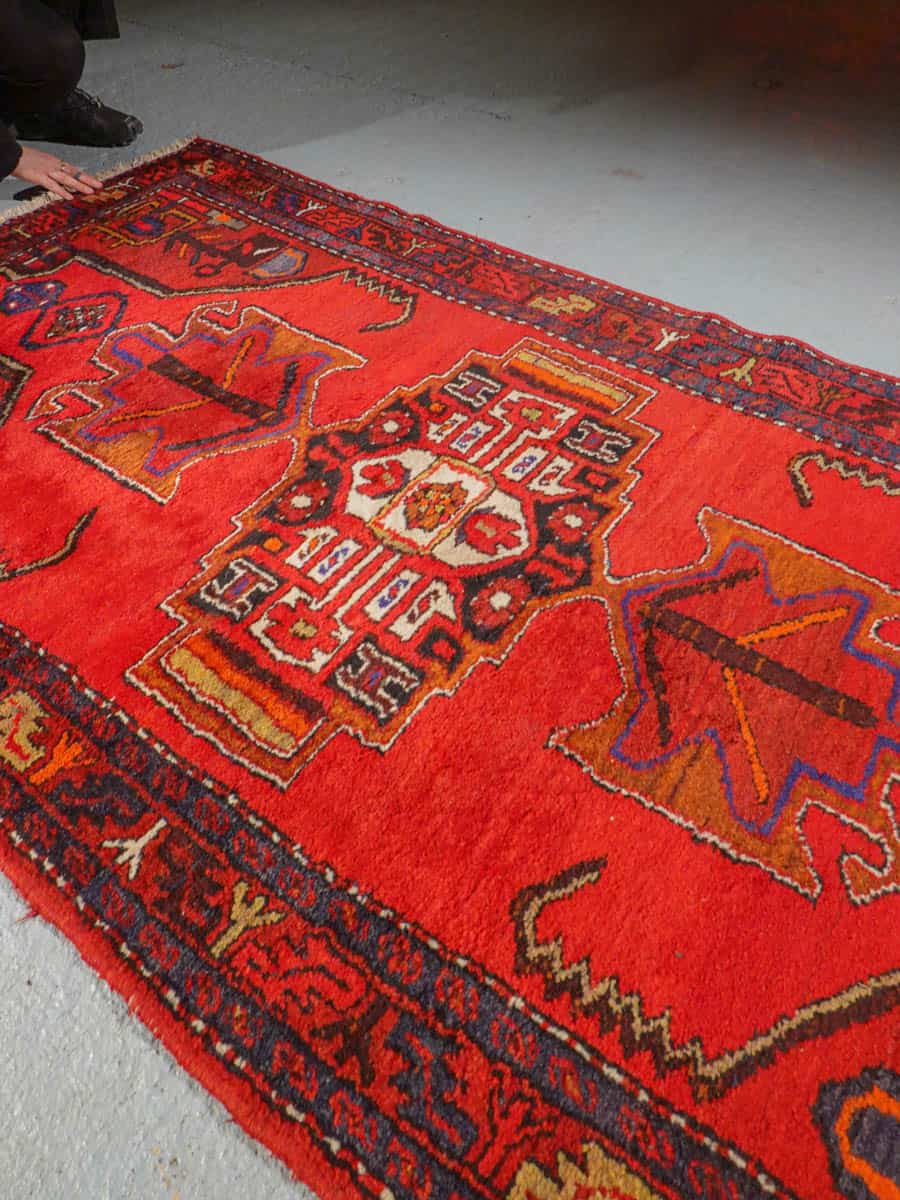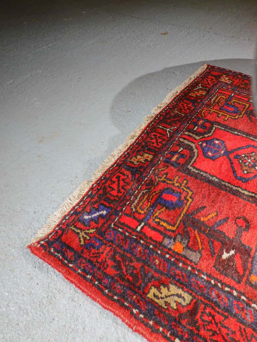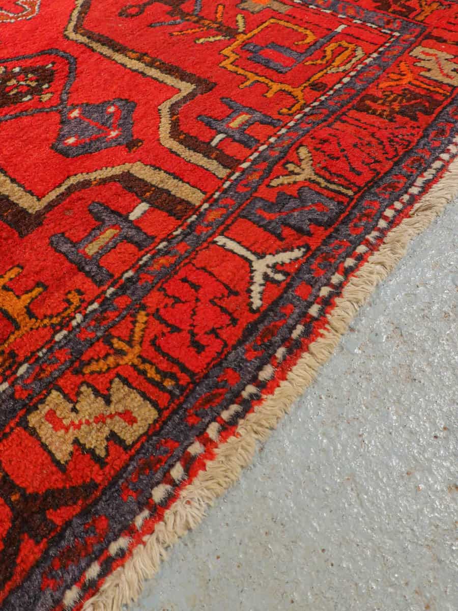Upea Hamadan kirkkaana säilyneenä punasella pohjalla ja tyylikkäillä geometrisilla kuvioilla..
